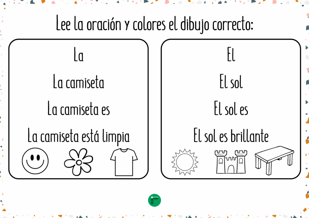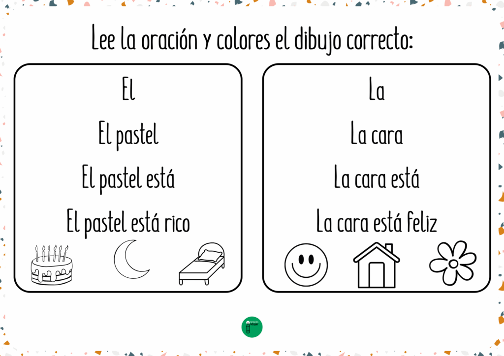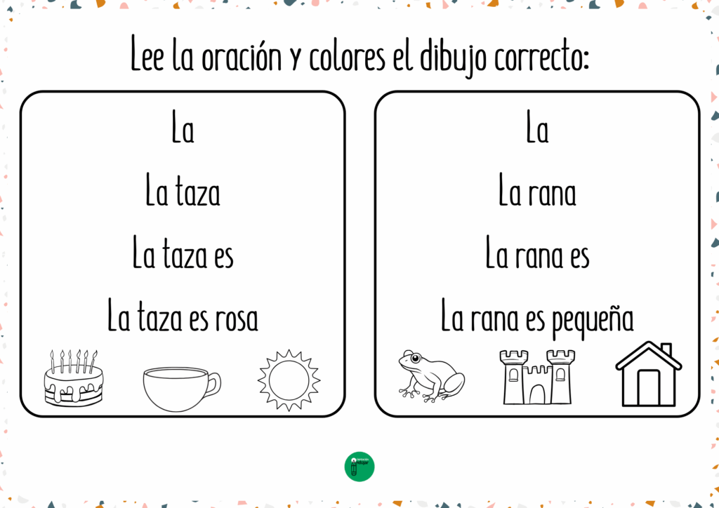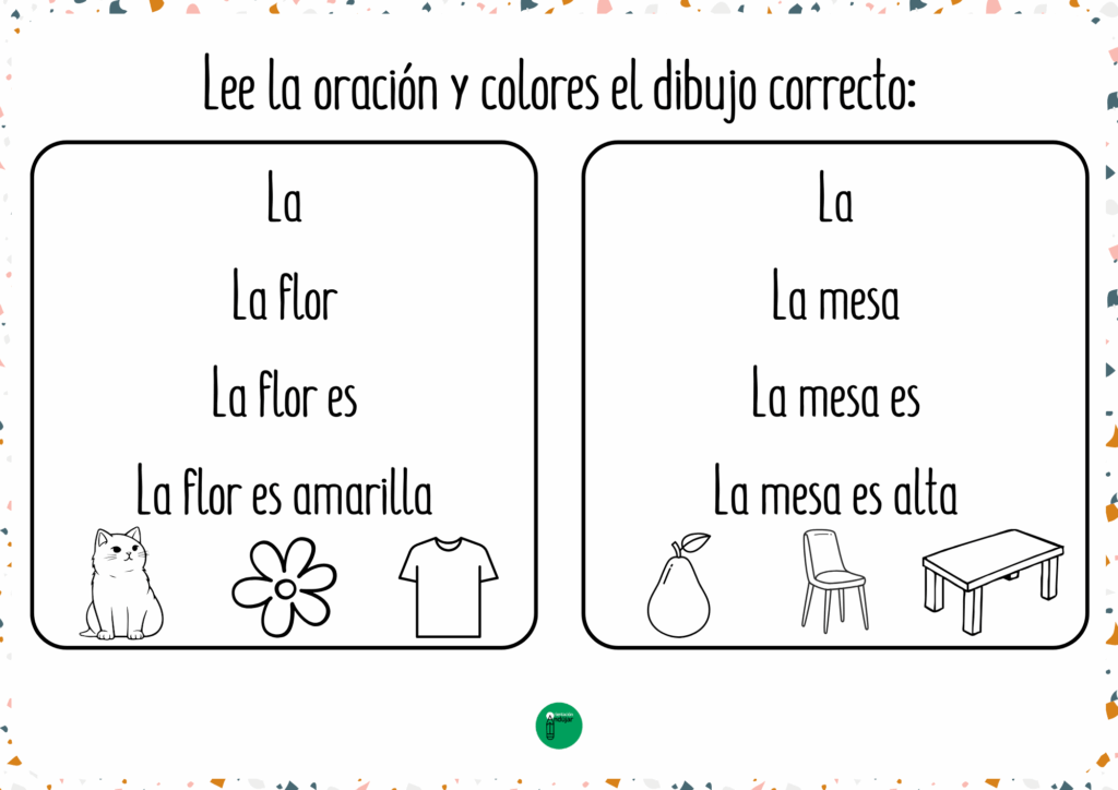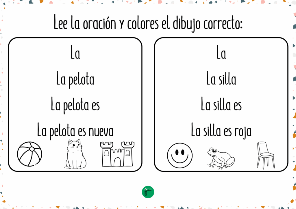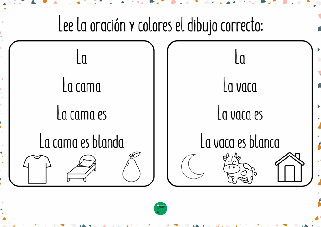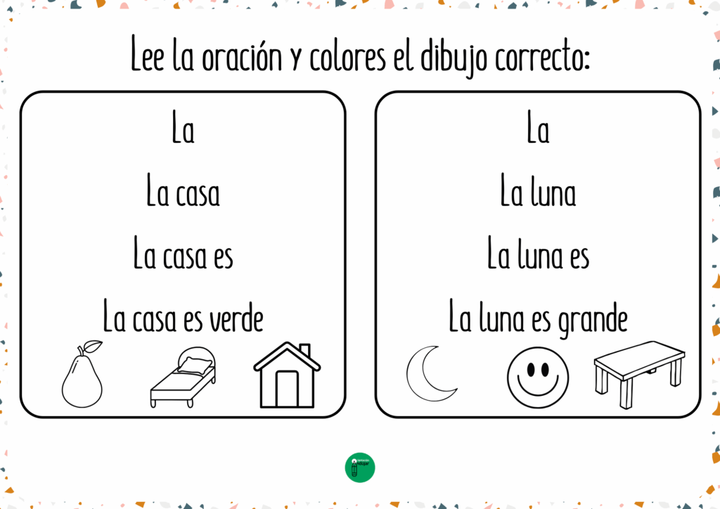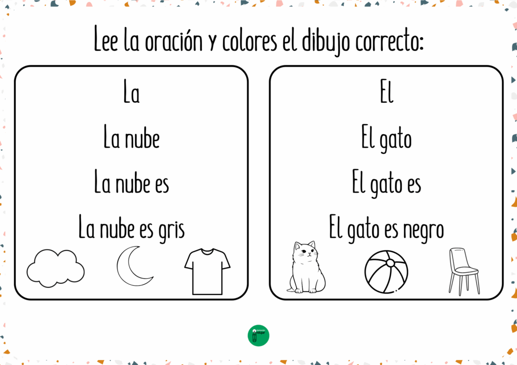 El material incluye oraciones sencillas y cotidianas con vocabulario cercano como casa, luna, flor, mesa, vaca, pelota, nube o sol, entre otros. Es un recurso ideal para usar tanto de forma individual como en pequeños grupos, fomentando la atención, la lectura y la escritura de manera lúdica. Además, se convierte en una actividad motivadora que combina lectura progresiva y coloreado, facilitando el aprendizaje de los más pequeños en el aula o en casa.