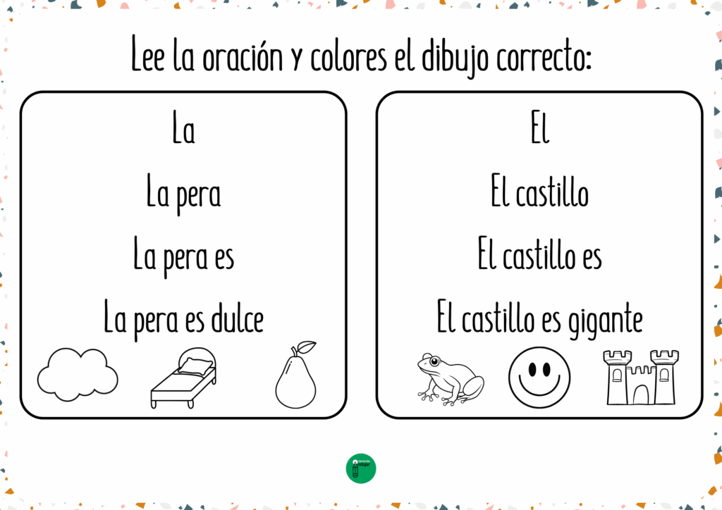 Hoy comparto un recurso muy práctico para trabajar la lectoescritura en los primeros cursos de Primaria. Se trata de pirámides de oraciones que permiten a los niños leer de manera progresiva, partiendo de una palabra hasta llegar a frases completas como La casa es verde. Cada pirámide está acompañada de dibujos, y los alumnos deberán colorear el correcto según la oración, reforzando así la comprensión lectora y la asociación entre texto e imagen.