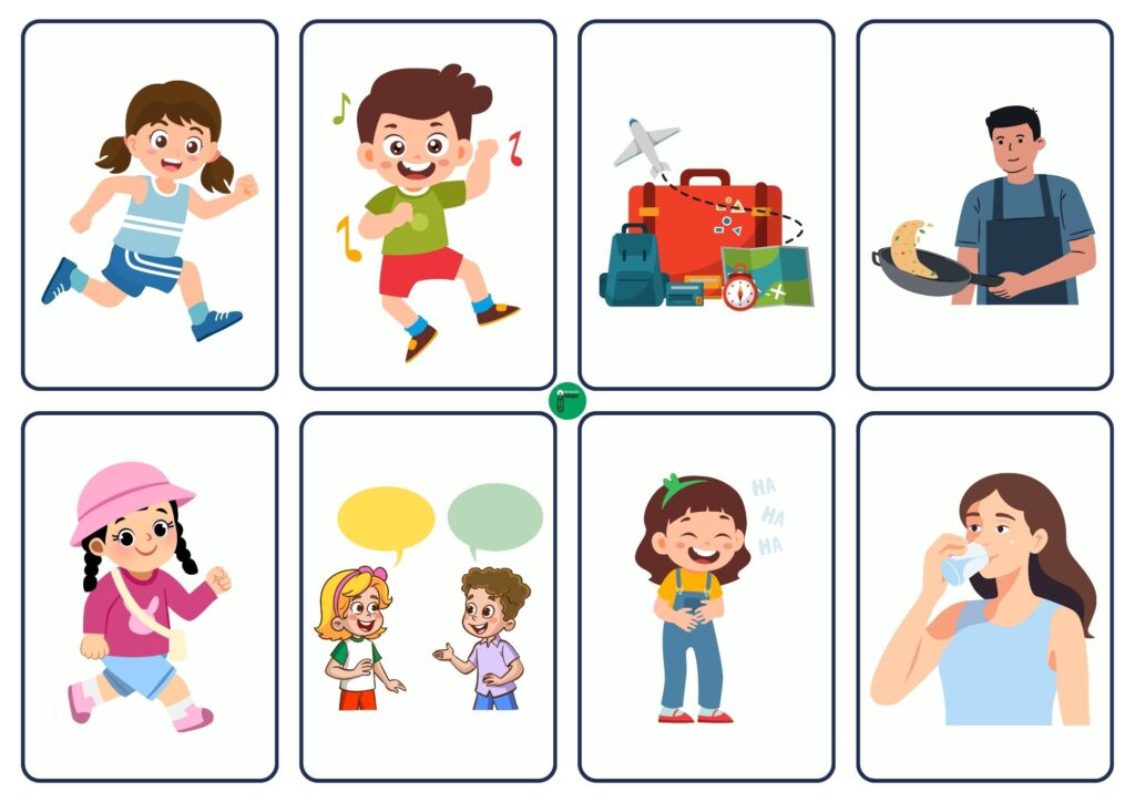 Cartas de verbos: cada una muestra un dibujo que representa un verbo (por ejemplo: correr, saltar, leer, dormir).