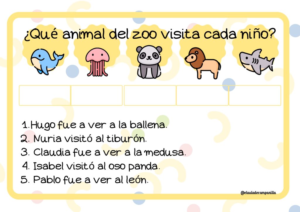 Hoy compartimos una divertida actividad de comprensión lectora para trabajar con los más pequeños de Primaria. A través de esta ficha, los alumnos deberán leer atentamente y relacionar qué animal del zoo visita cada niño o niña, desarrollando su atención, memoria y capacidad de asociación.