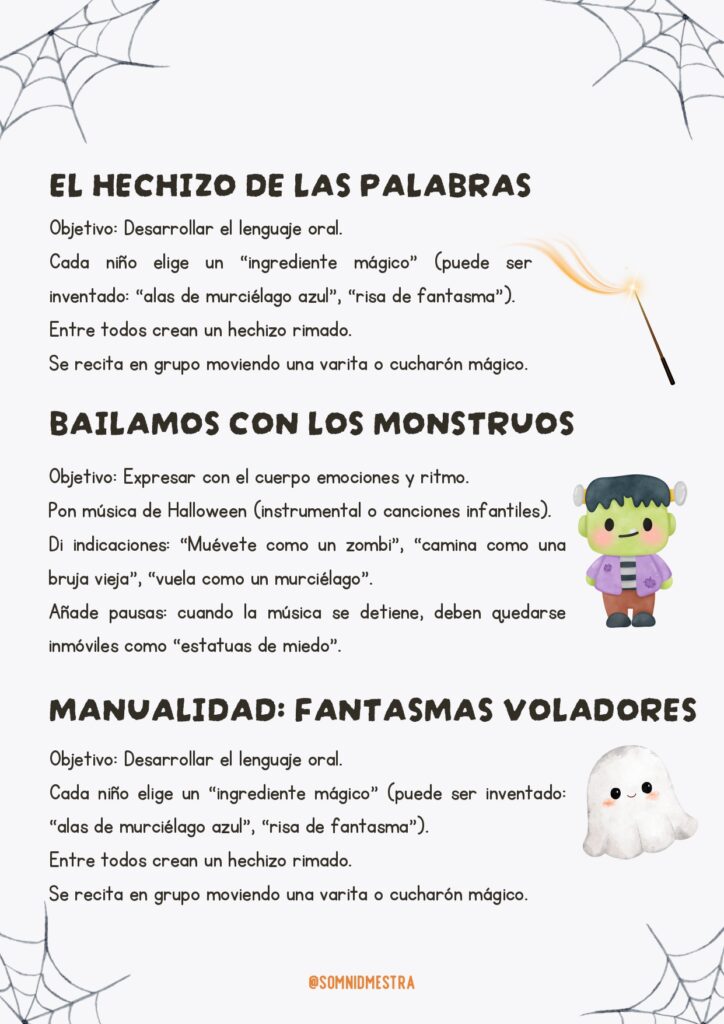 El pack puede emplearse como un proyecto de aula durante la semana de Halloween o integrarse en tus sesiones de educación artística, lengua, educación física o matemáticas. Cada actividad está explicada paso a paso con sus objetivos, materiales y variantes por niveles.
