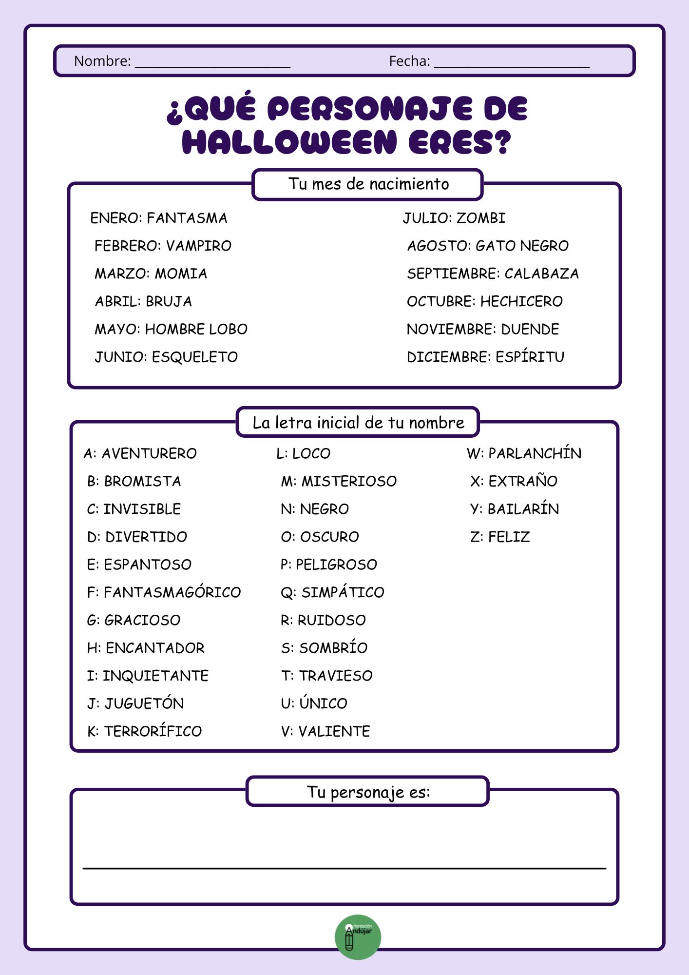 ¡Halloween está a la vuelta de la esquina y qué mejor manera de celebrarlo en el aula que con una actividad creativa y divertida! Hemos preparado un juego en el que cada alumno podrá descubrir qué personaje de Halloween le toca, combinando su mes de nacimiento y la primera letra de su nombre.