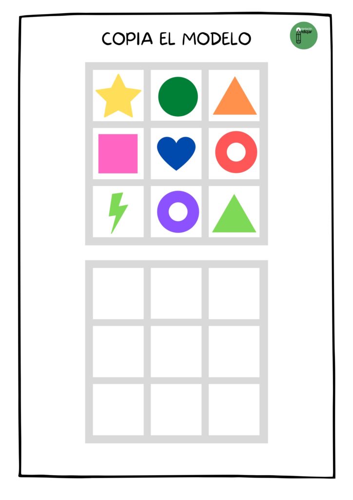 Entrega la ficha a los alumnos y pídeles que observen atentamente las figuras del modelo para reproducirlas igual en el espacio correspondiente. Es una excelente herramienta para desarrollar la atención sostenida y la precisión en el trazo. Ideal para sesiones cortas de trabajo individual o rincones de educación plástica.