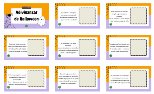 En esta colección de adivinanzas de Halloween, encontrarás personajes y elementos clásicos de esta festividad, como calabazas, brujas, murciélagos, fantasmas, momias, vampiros, esqueletos y calderos mágicos. Cada adivinanza está diseñada para hacer que los niños piensen, observen y usen pistas contextuales para descubrir la respuesta, fomentando así habilidades cognitivas importantes.