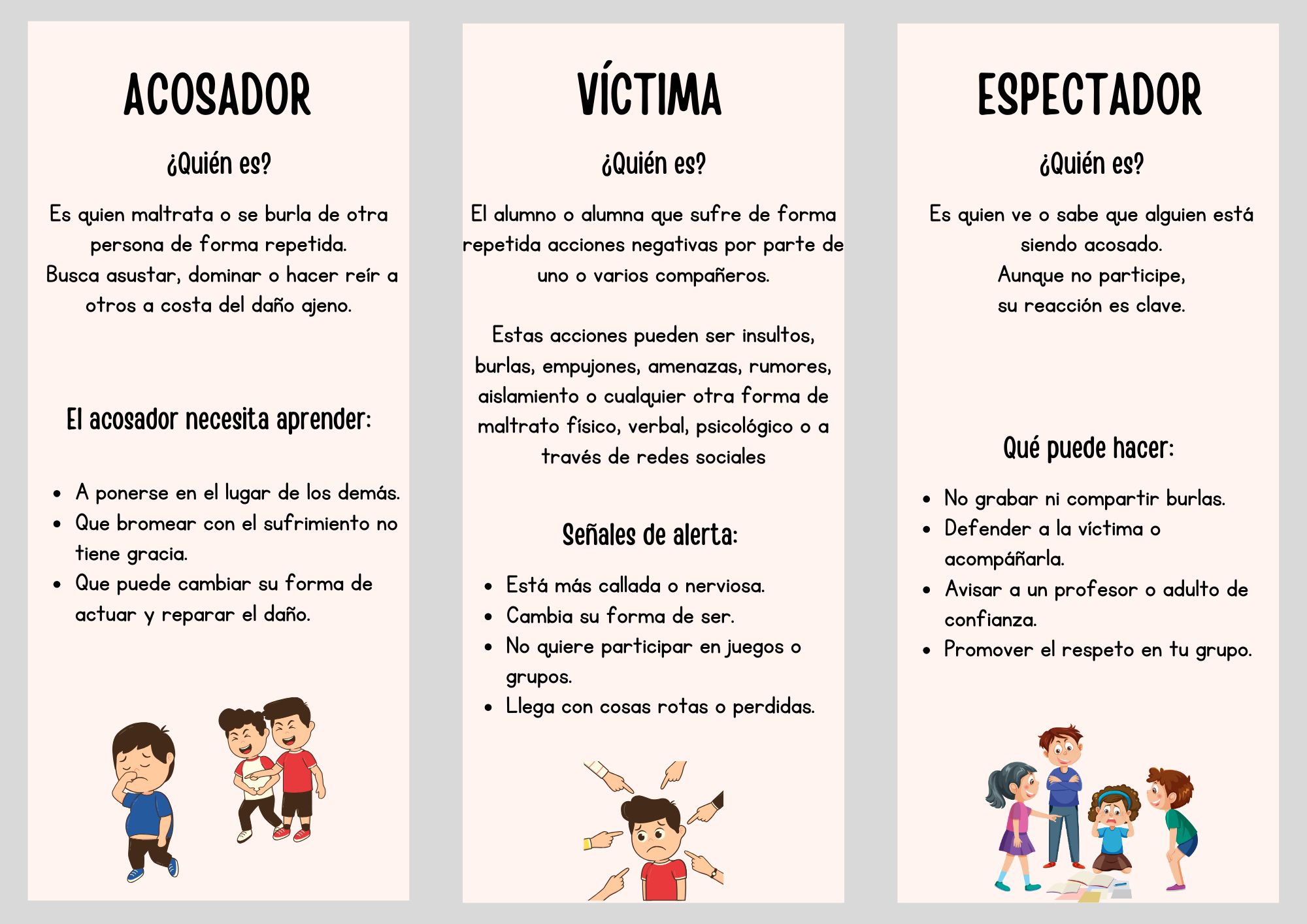 A través de ilustraciones y frases sencillas, el tríptico ayuda a los niños y niñas a identificar cómo se comporta cada uno de estos personajes, a reflexionar sobre las consecuencias del acoso y, sobre todo, a comprender que todos podemos hacer algo para detenerlo.
