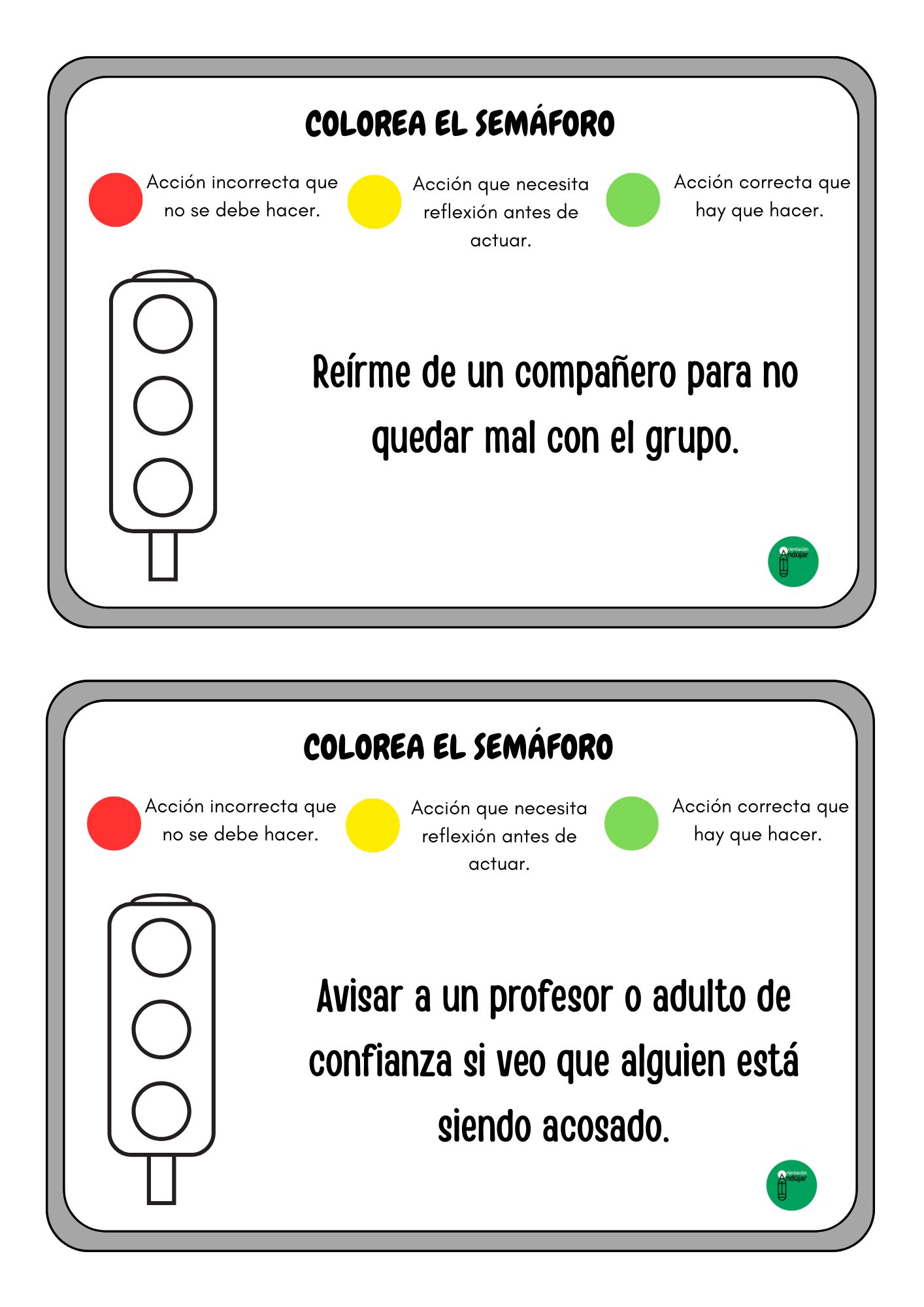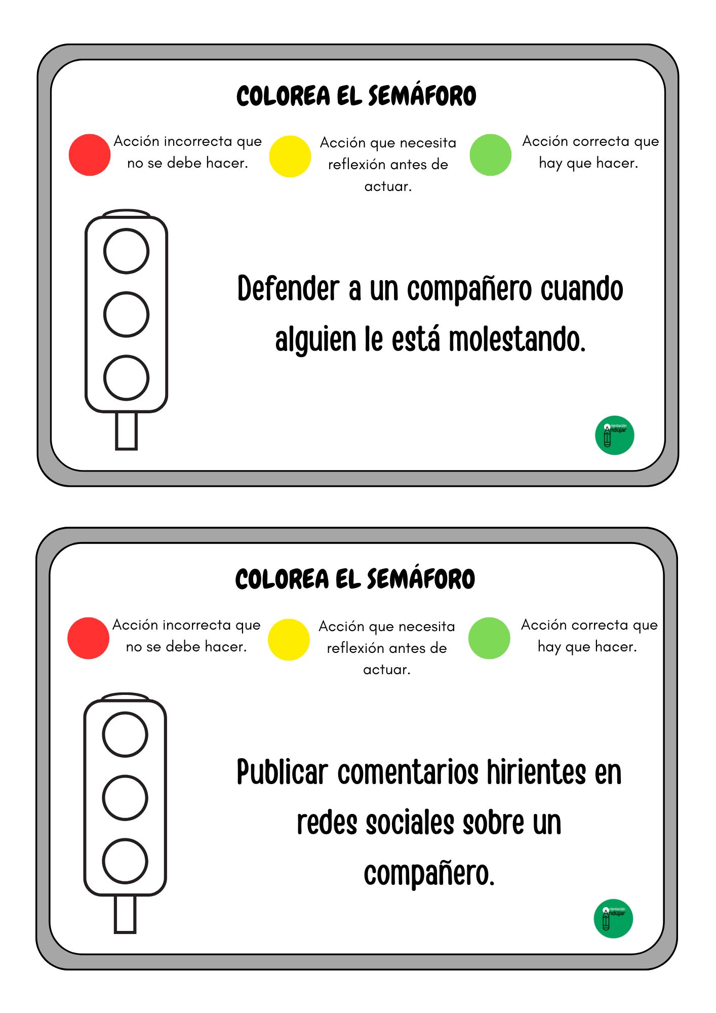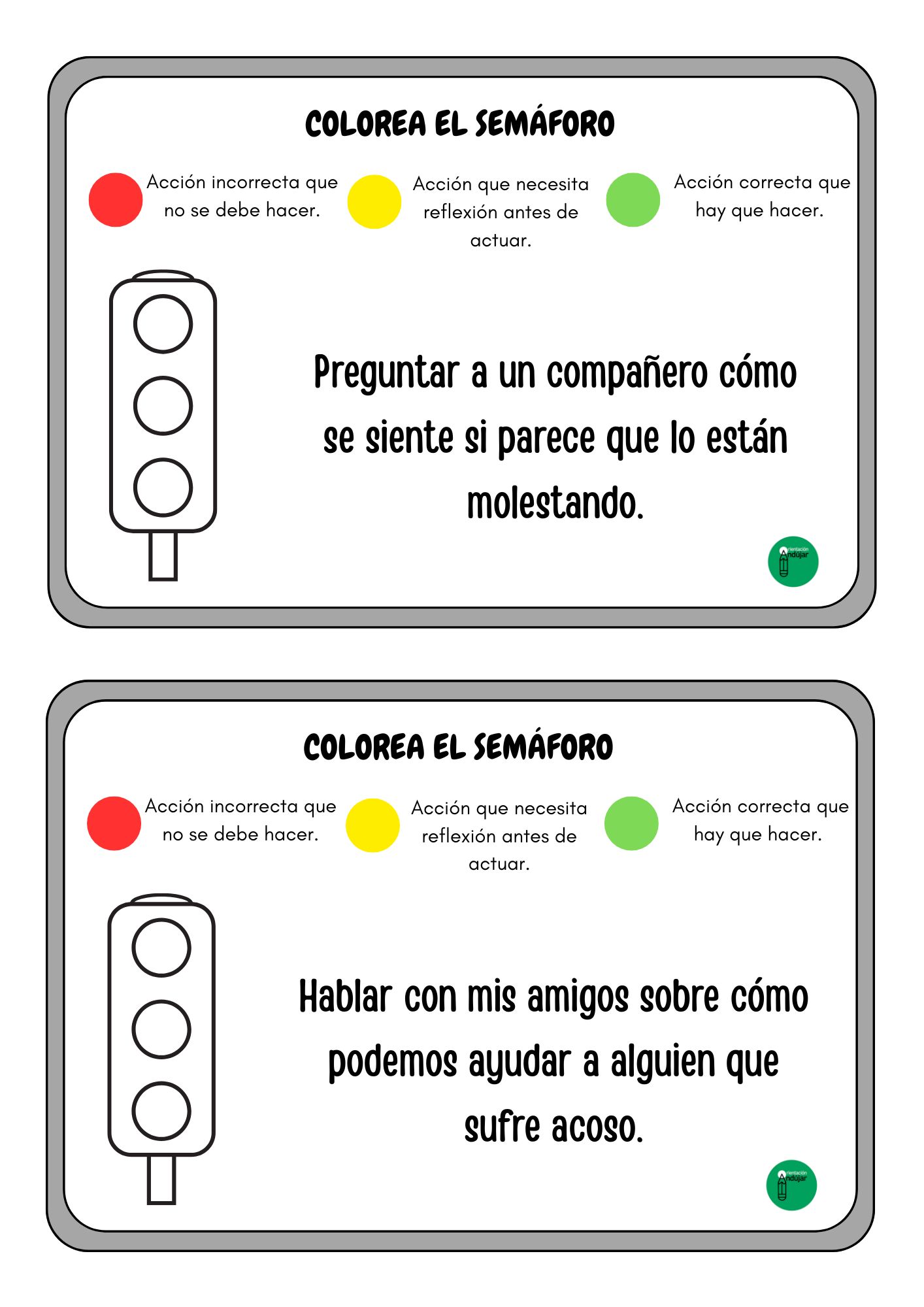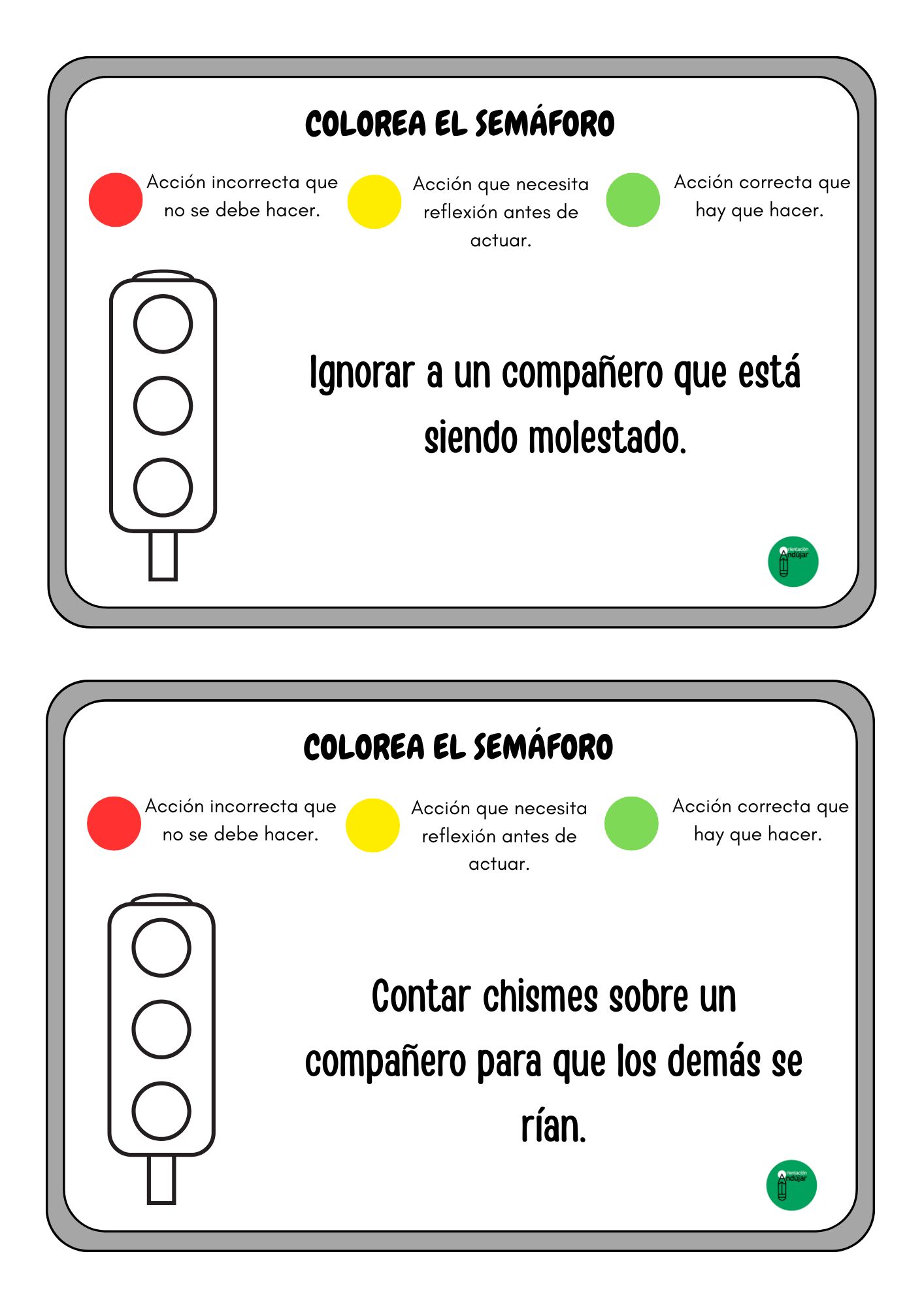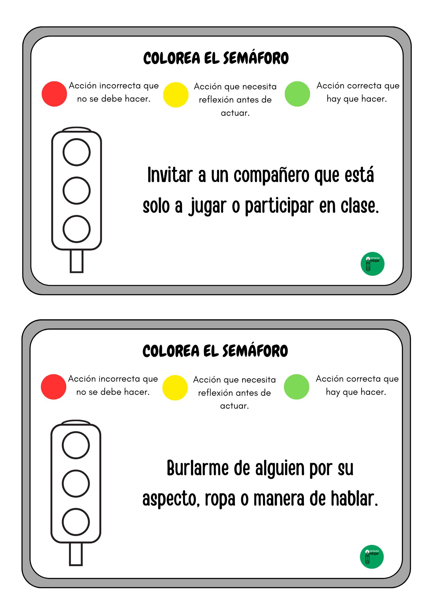 La propuesta consiste en presentar a los alumnos una serie de tarjetas, cada una con una acción o comportamiento que puede darse en la convivencia escolar. Junto a la frase aparece un semáforo, que los alumnos deberán colorear según su juicio y reflexión.