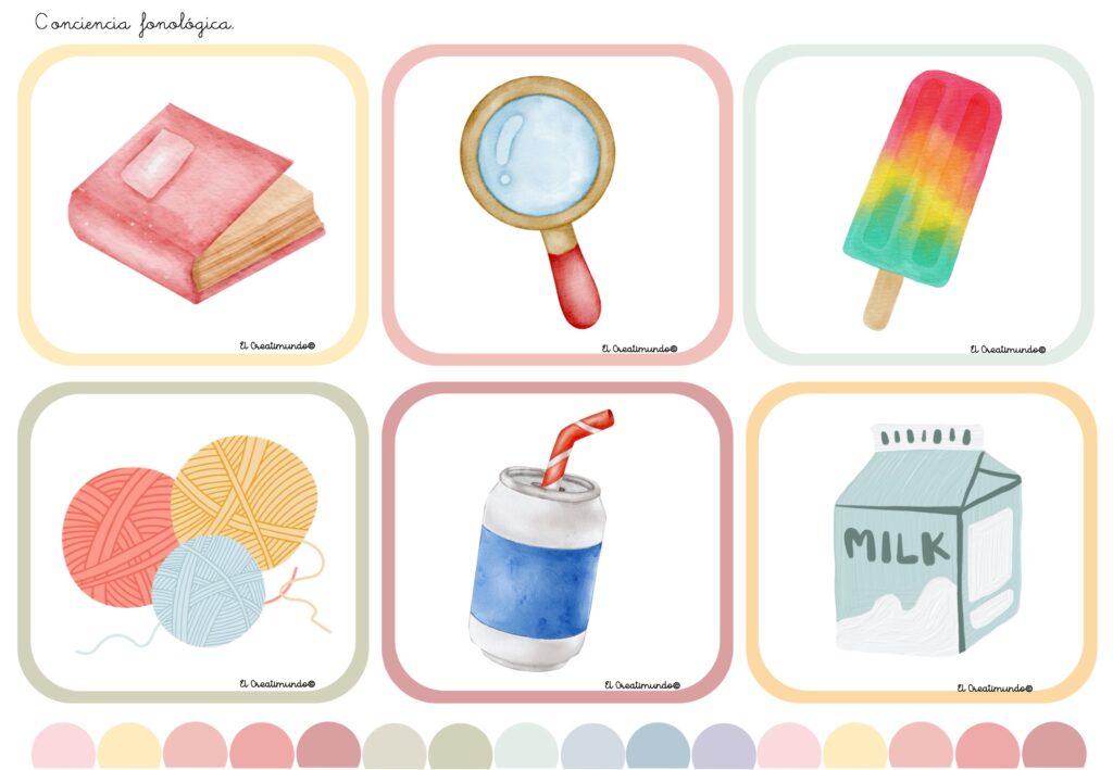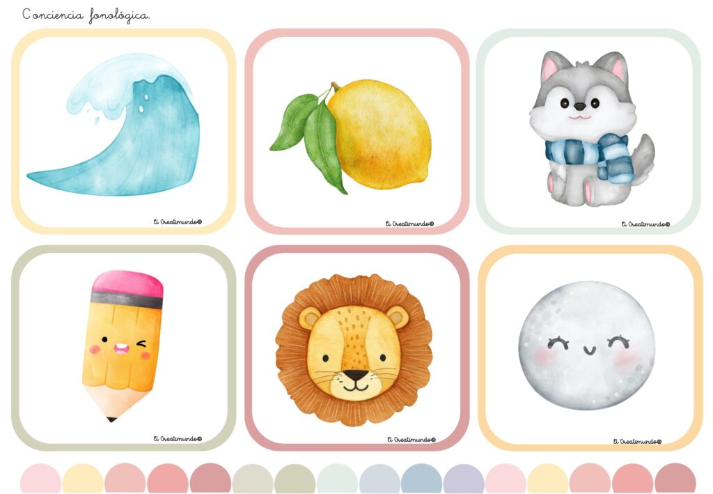 Tarjetas de palabras con imágenes asociadas a la letra L: libro, lupa, limón, lobo, lápiz, luna, leche, lana, etc.