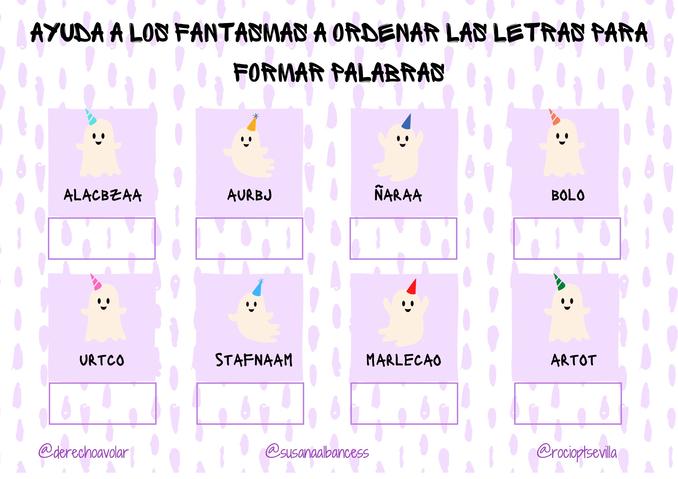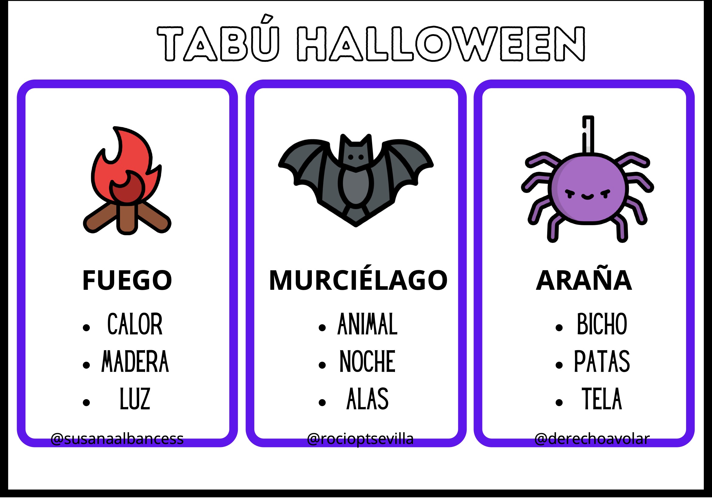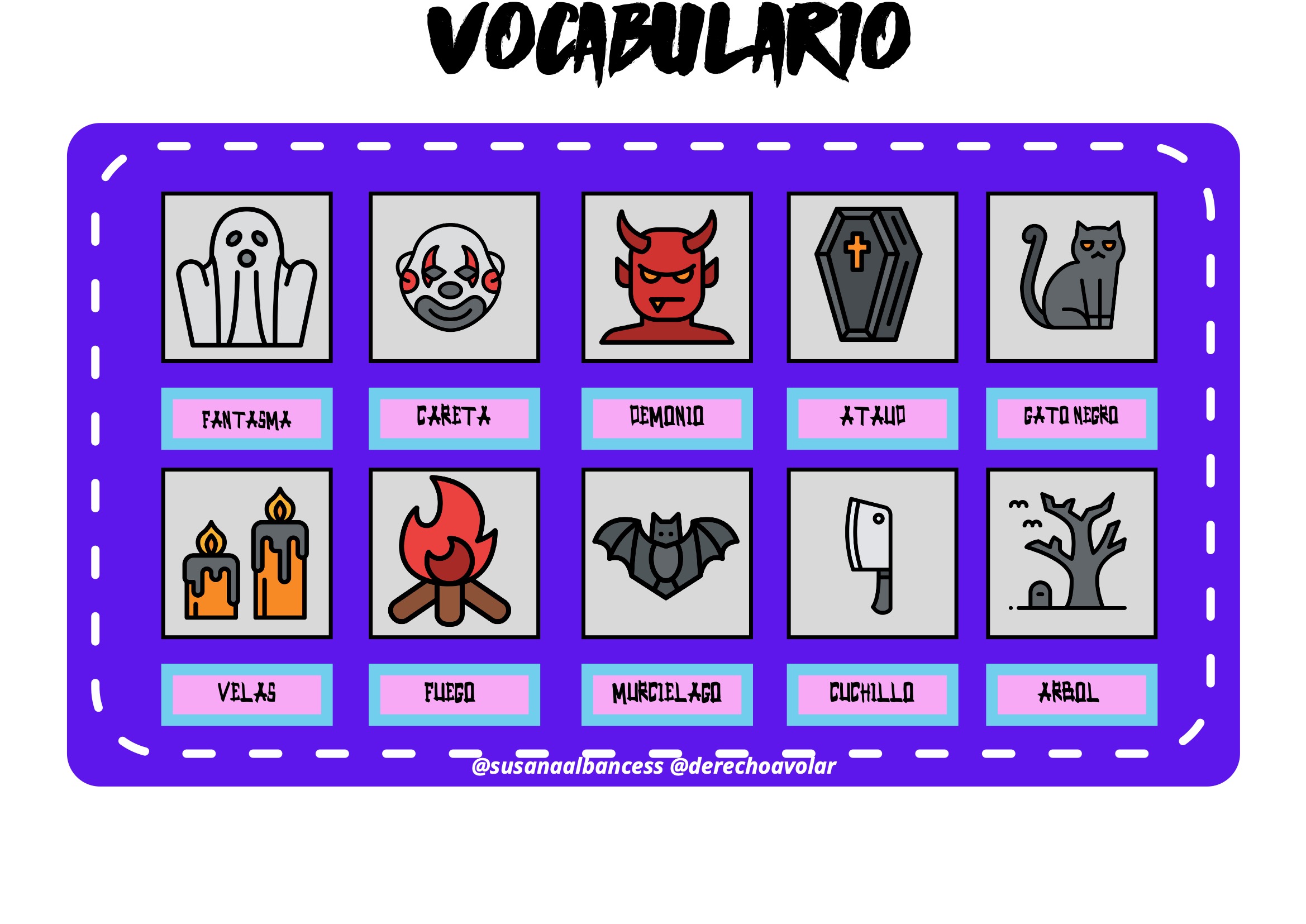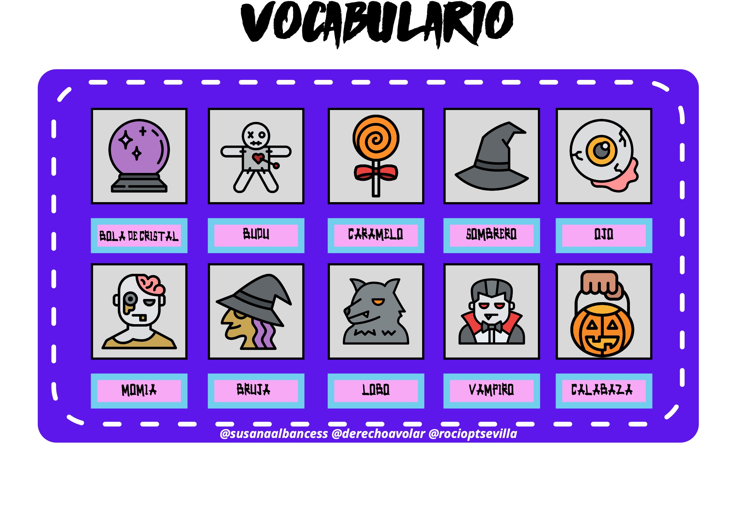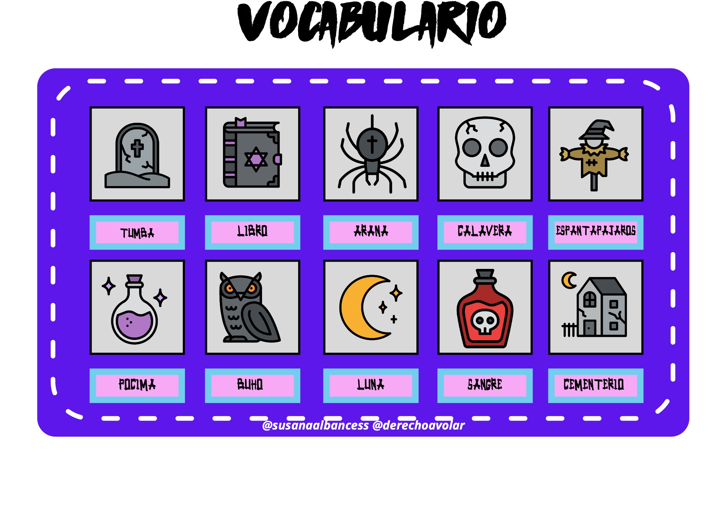 Actividades de vocabulario temático de Halloween: palabras como bruja, calabaza, murciélago, vampiro o fantasma.