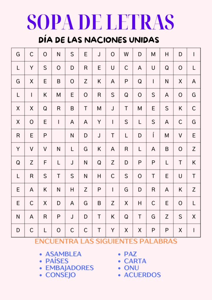 Sopa de letras temática de la ONU, con palabras relacionadas con el trabajo de la organización: Asamblea, Paz, Carta, Acuerdos, Países, Embajadores, entre otras.