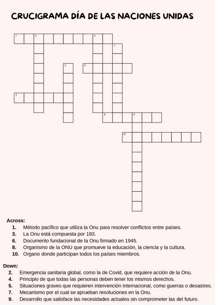 Crucigrama del Día de las Naciones Unidas, con preguntas sobre la historia y funciones de la ONU.