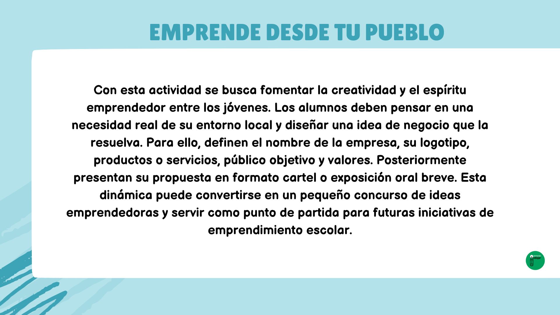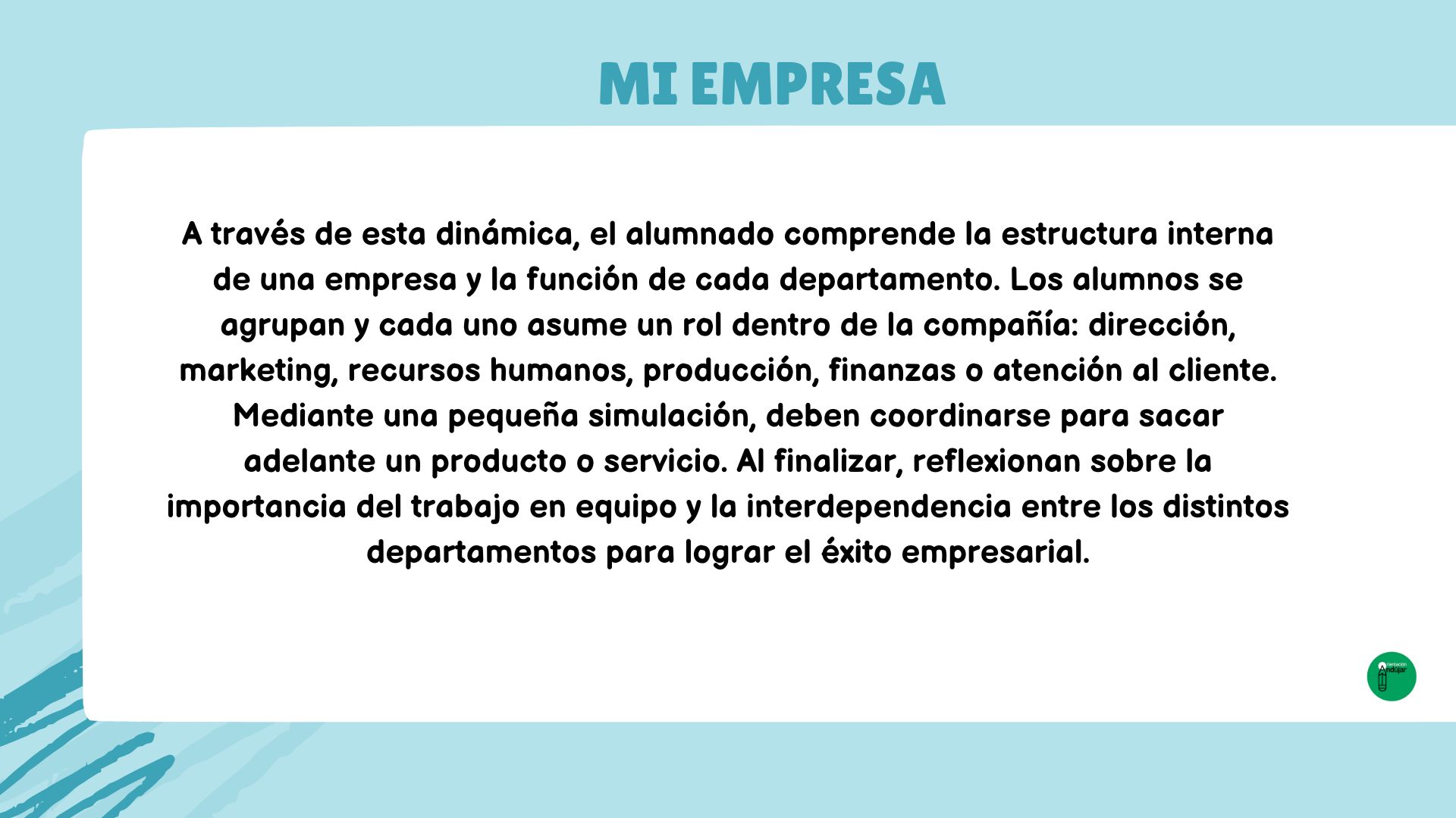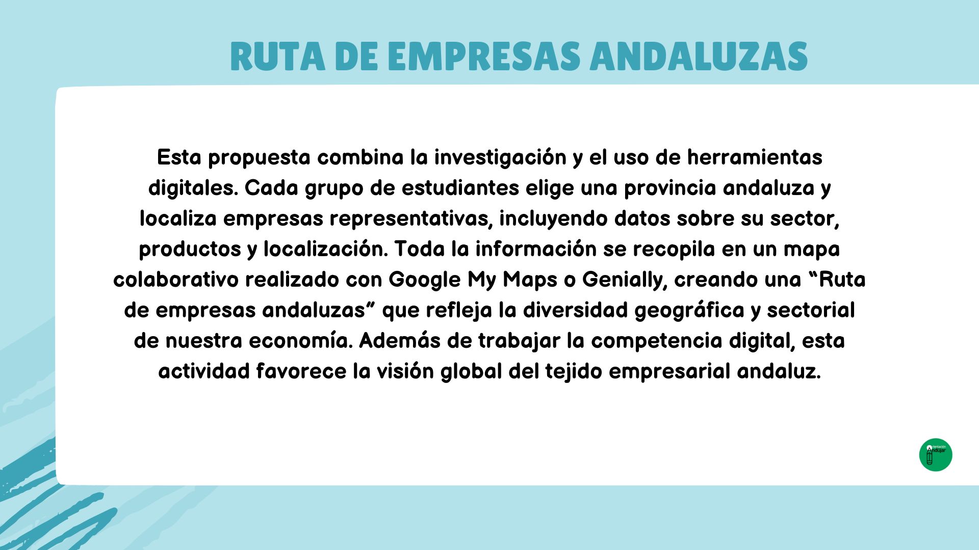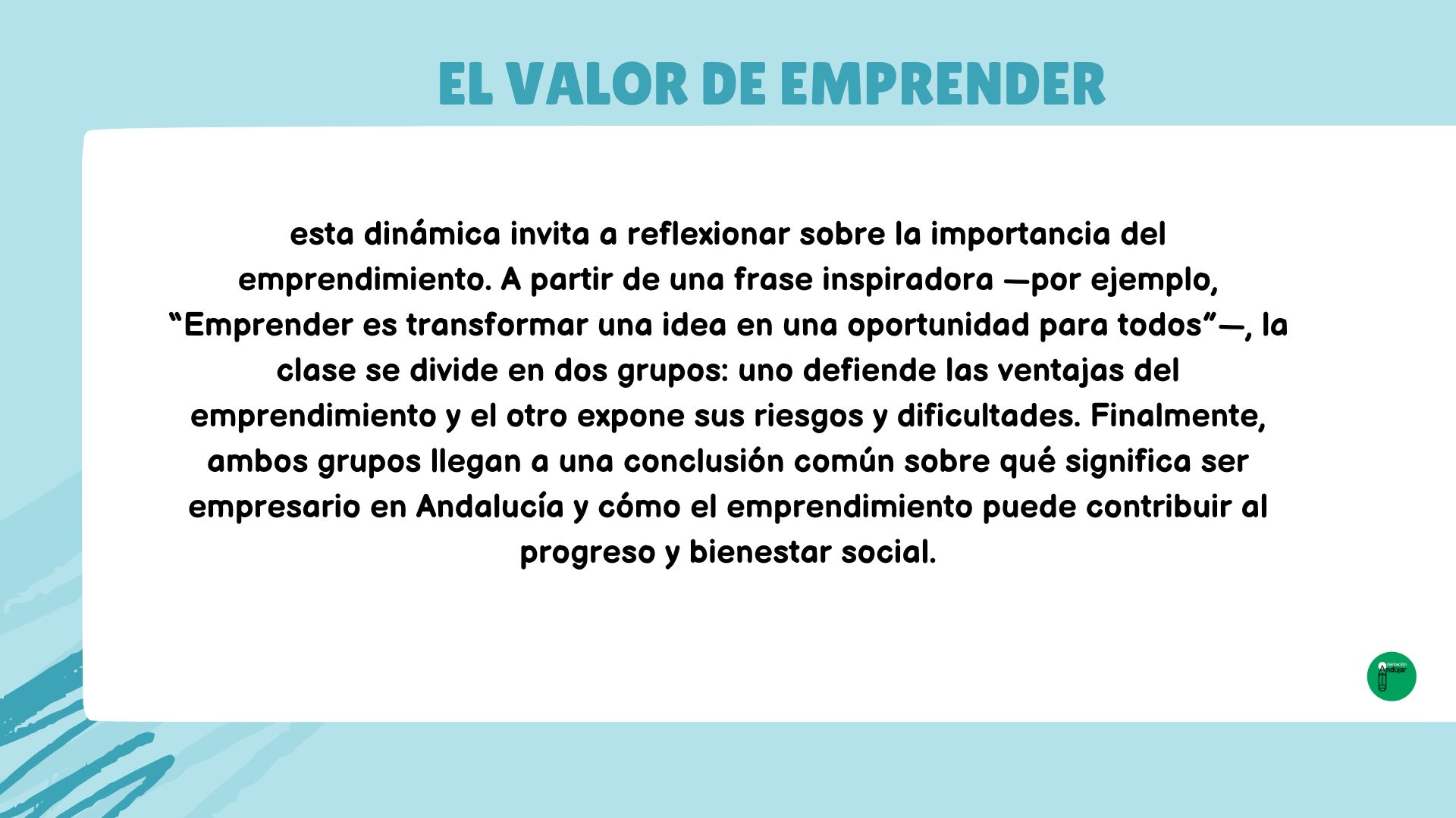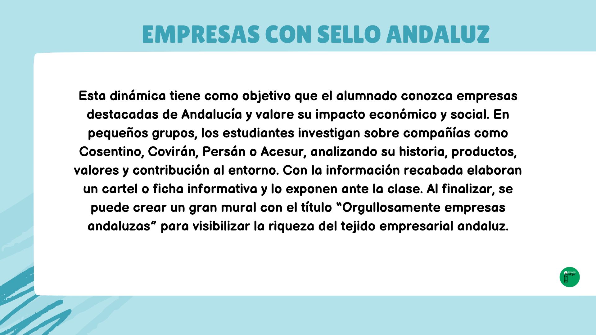 Con motivo del Día de la Empresa Andaluza, compartimos una completa colección de dinámicas participativas para el alumnado de Secundaria y Bachillerato. Este recurso tiene como objetivo acercar el mundo empresarial al aula, fomentando la creatividad, el trabajo en equipo y la valoración del tejido empresarial andaluz. A través de propuestas prácticas, los estudiantes aprenderán a identificar empresas locales, comprender su funcionamiento y reflexionar sobre el papel del emprendimiento en el desarrollo sostenible de nuestra comunidad.