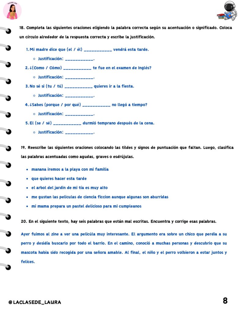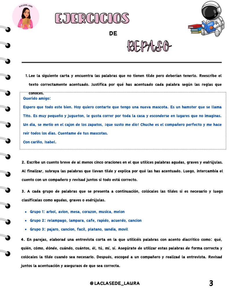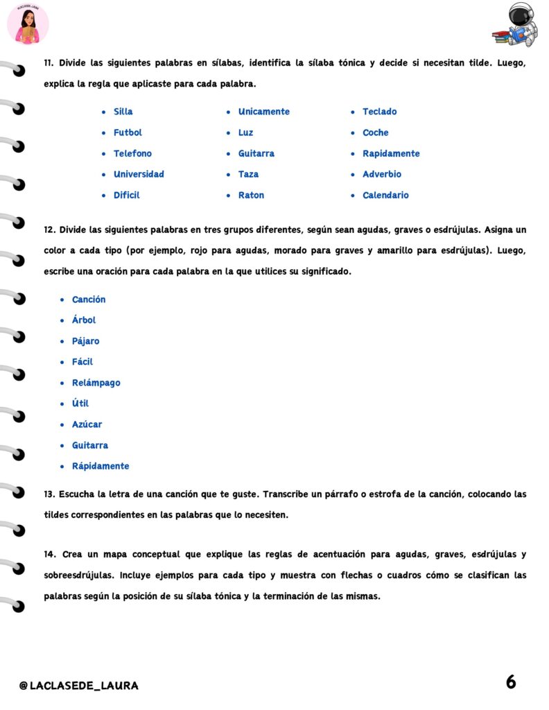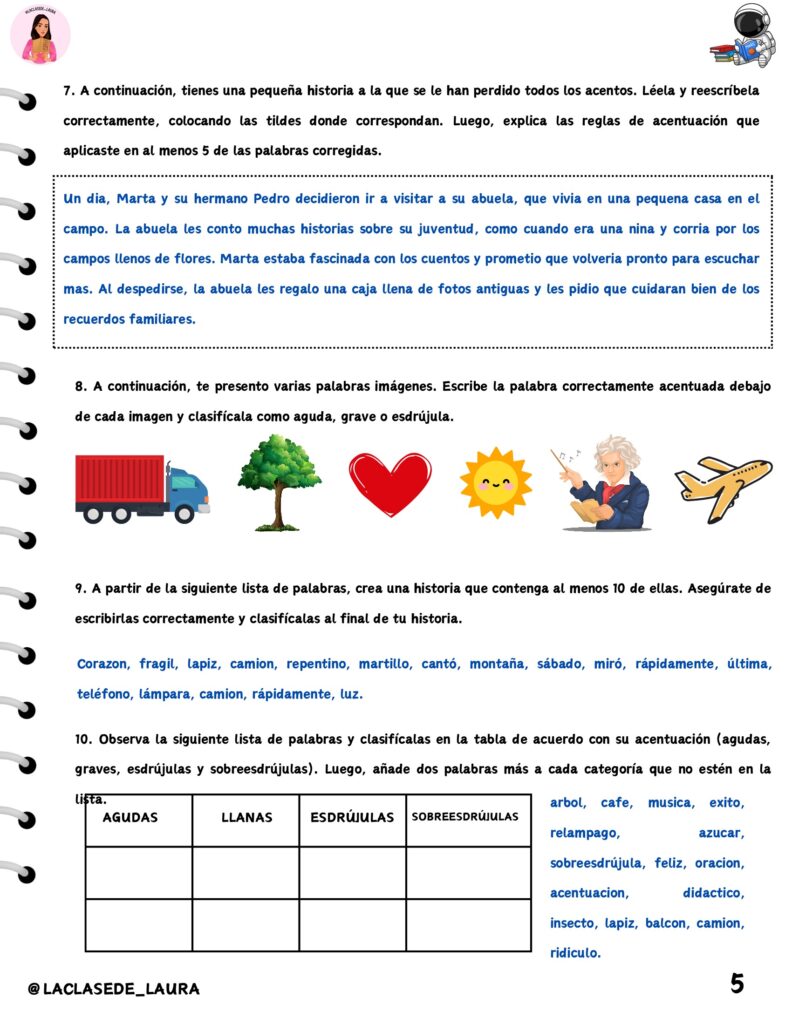 Aprender las reglas de acentuación es fundamental para mejorar la ortografía y la expresión escrita. Este cuaderno está diseñado para que los alumnos comprendan de forma clara y práctica cómo se acentúan las palabras agudas, llanas, esdrújulas y sobreesdrújulas, así como el uso de la tilde diacrítica.