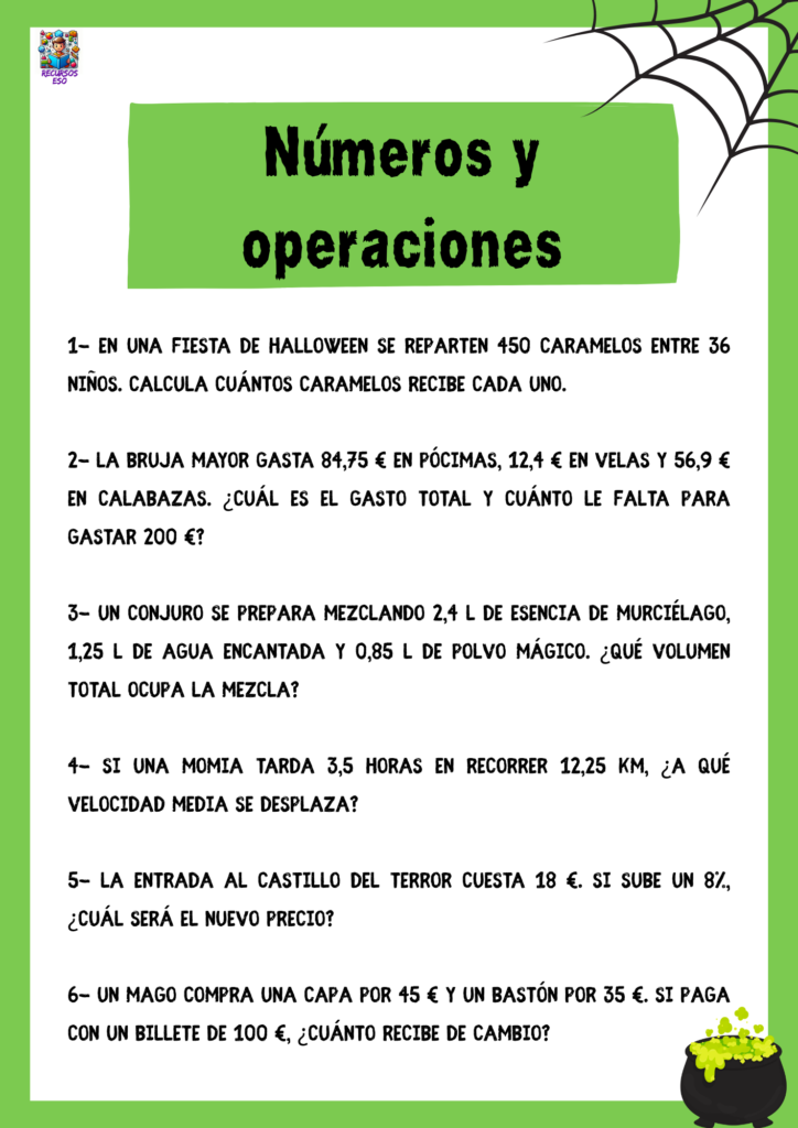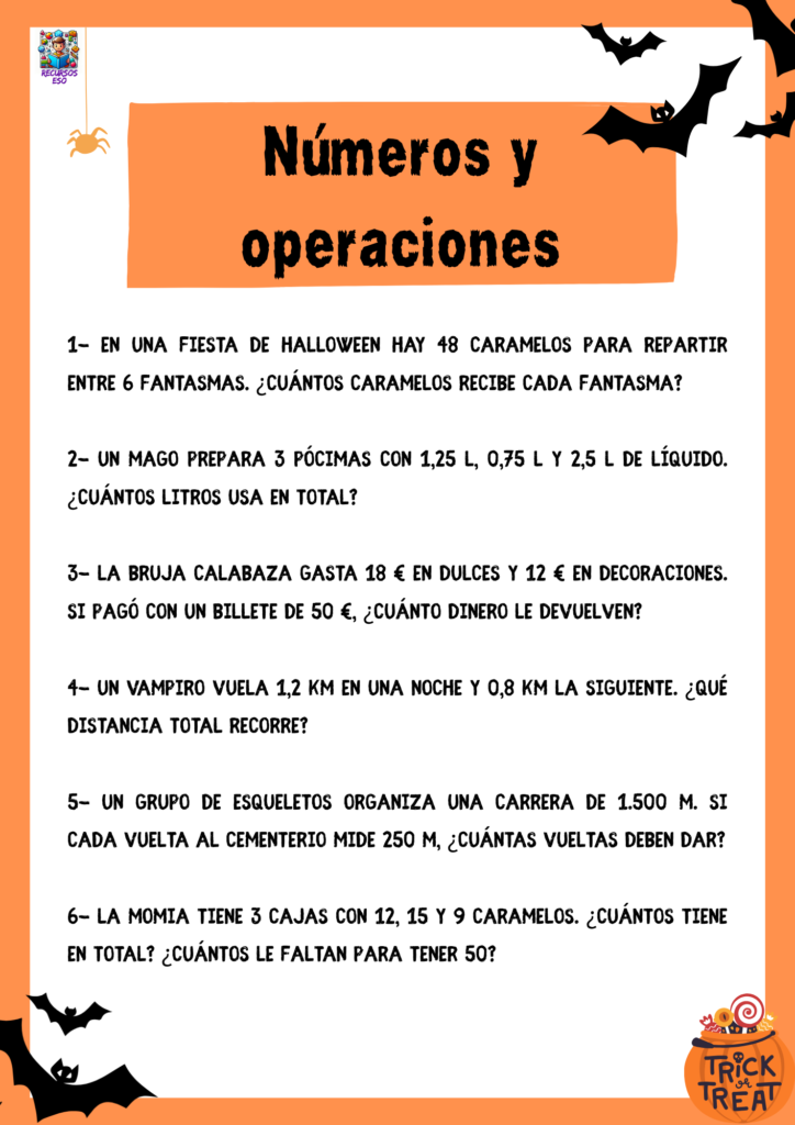 Para 1.º de ESO: ejercicios de problemas con contexto de Halloween para iniciarse en la resolución de situaciones con números y operaciones.