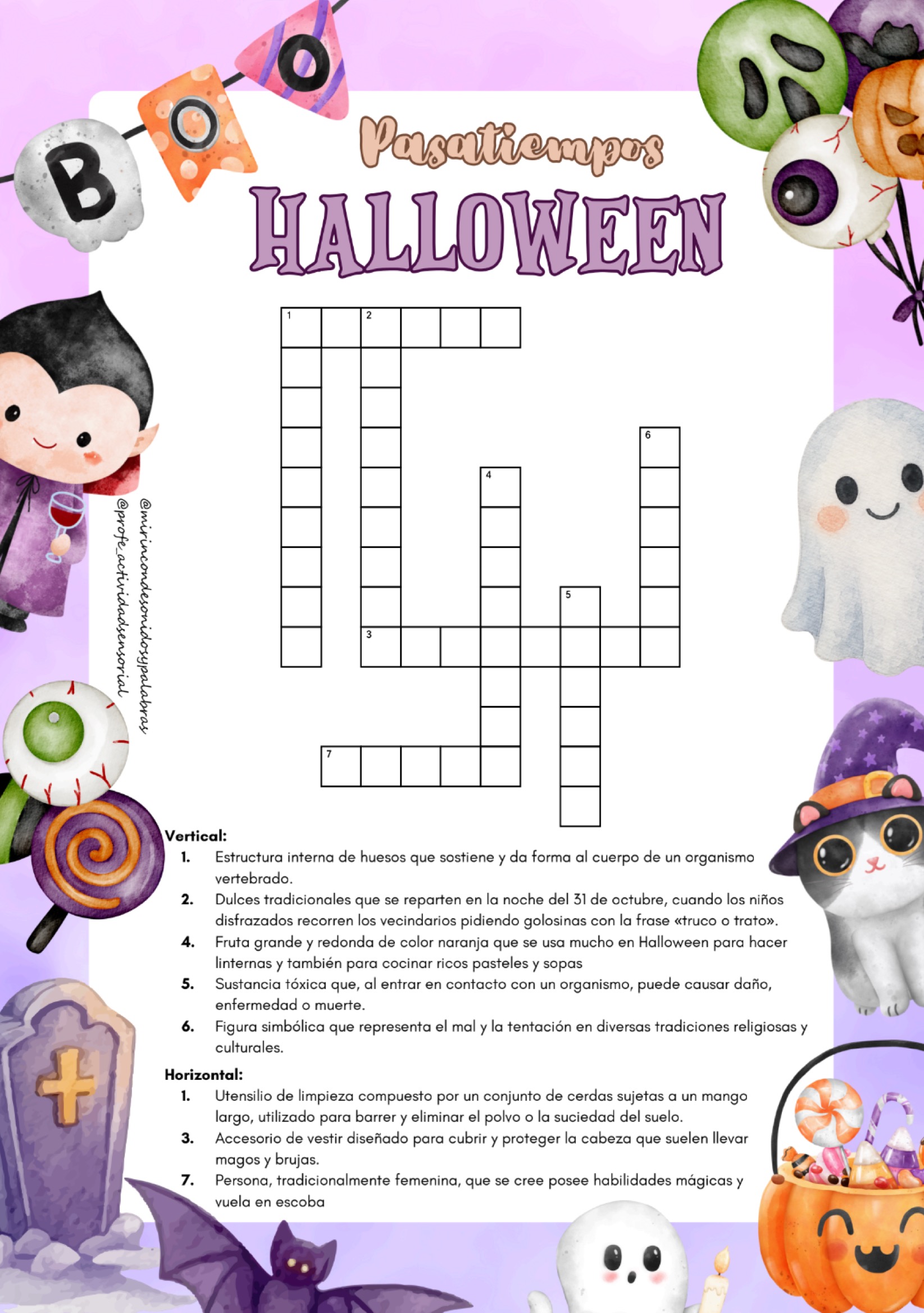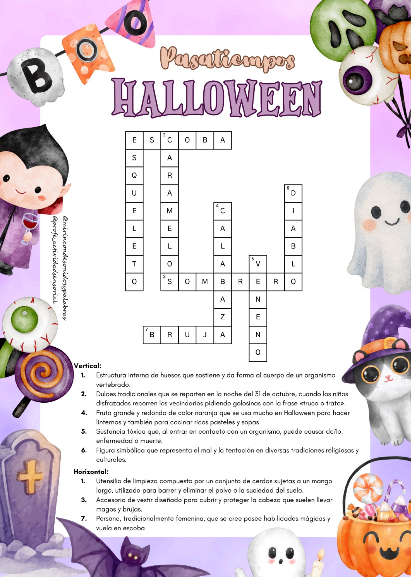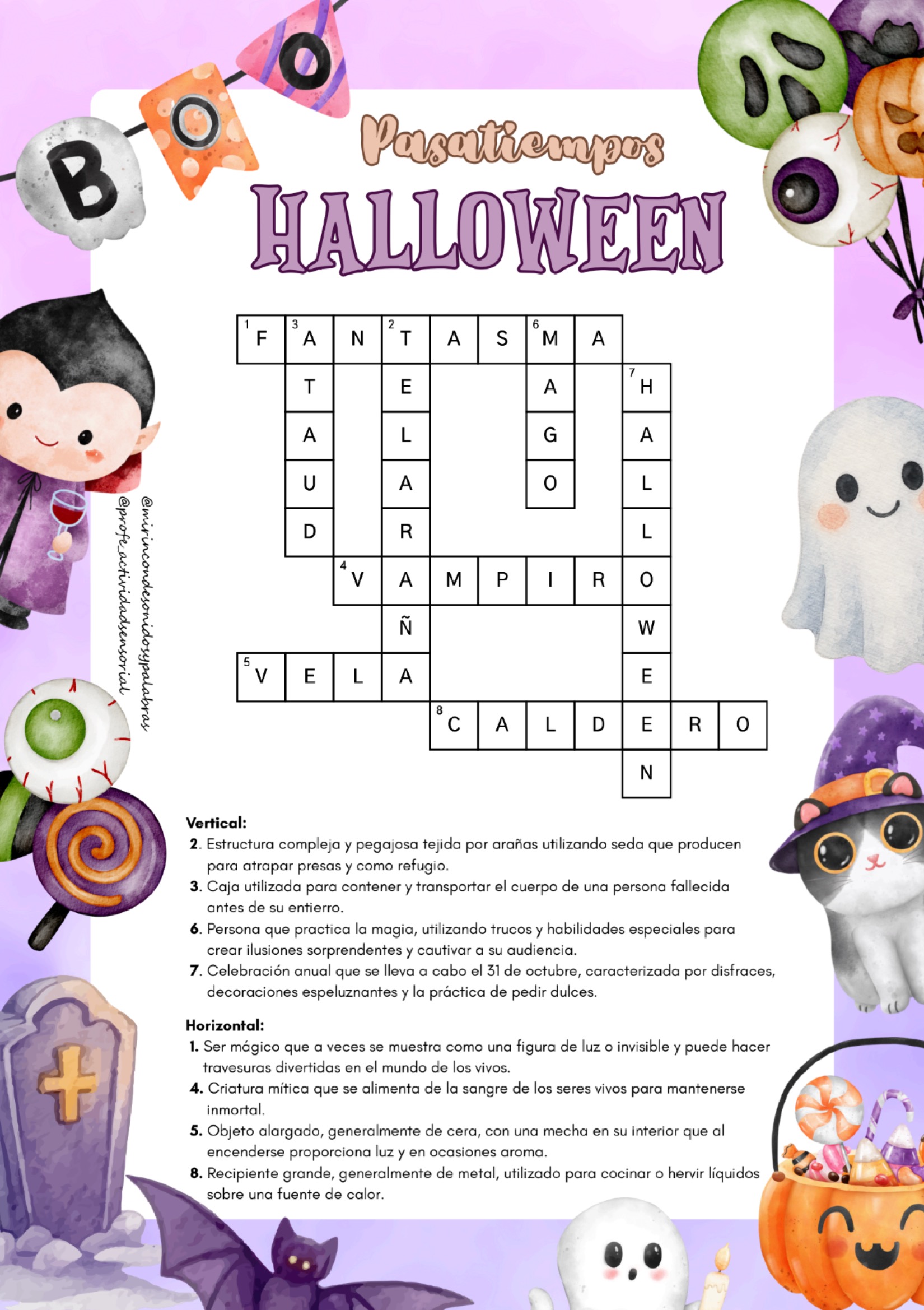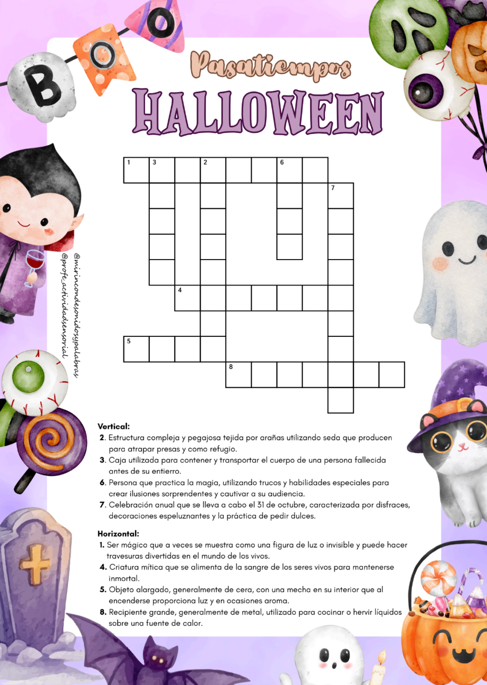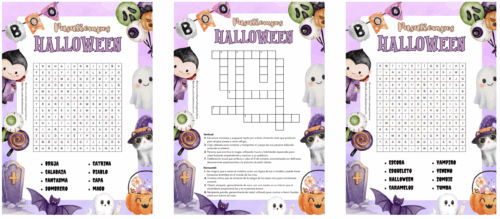 Crucigramas de Halloween con vocabulario temático (bruja, vampiro, calabaza, fantasma, etc.).