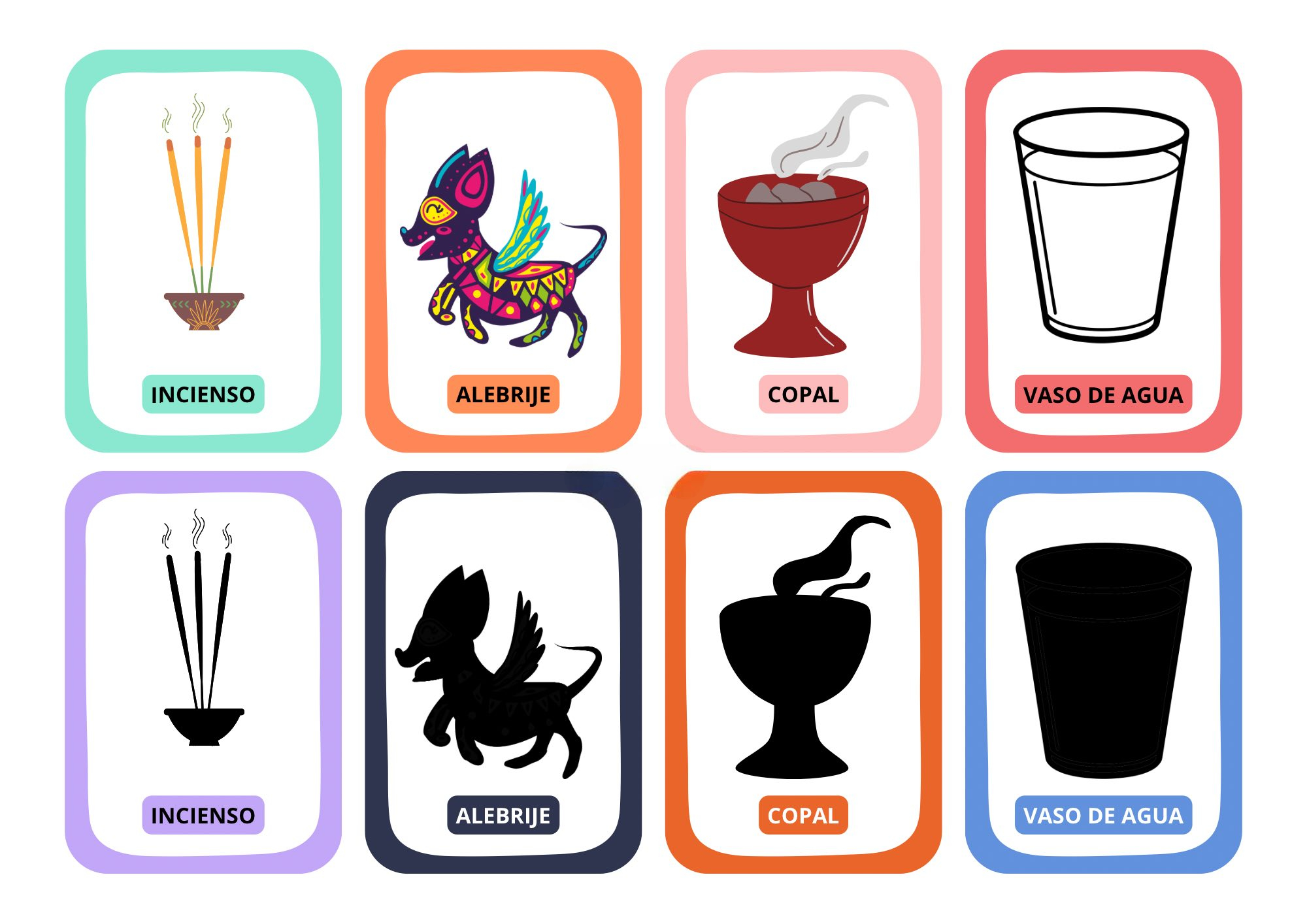 El pack contiene tarjetas de memoria a color y en silueta, diseñadas con ilustraciones del altar de muertos y sus elementos más representativos: