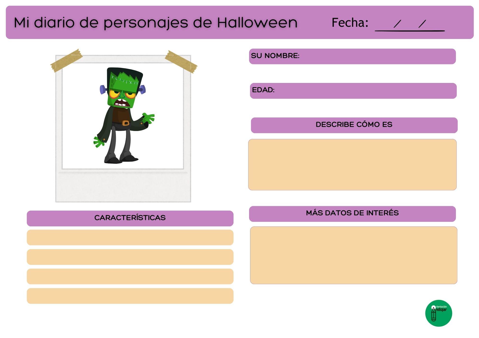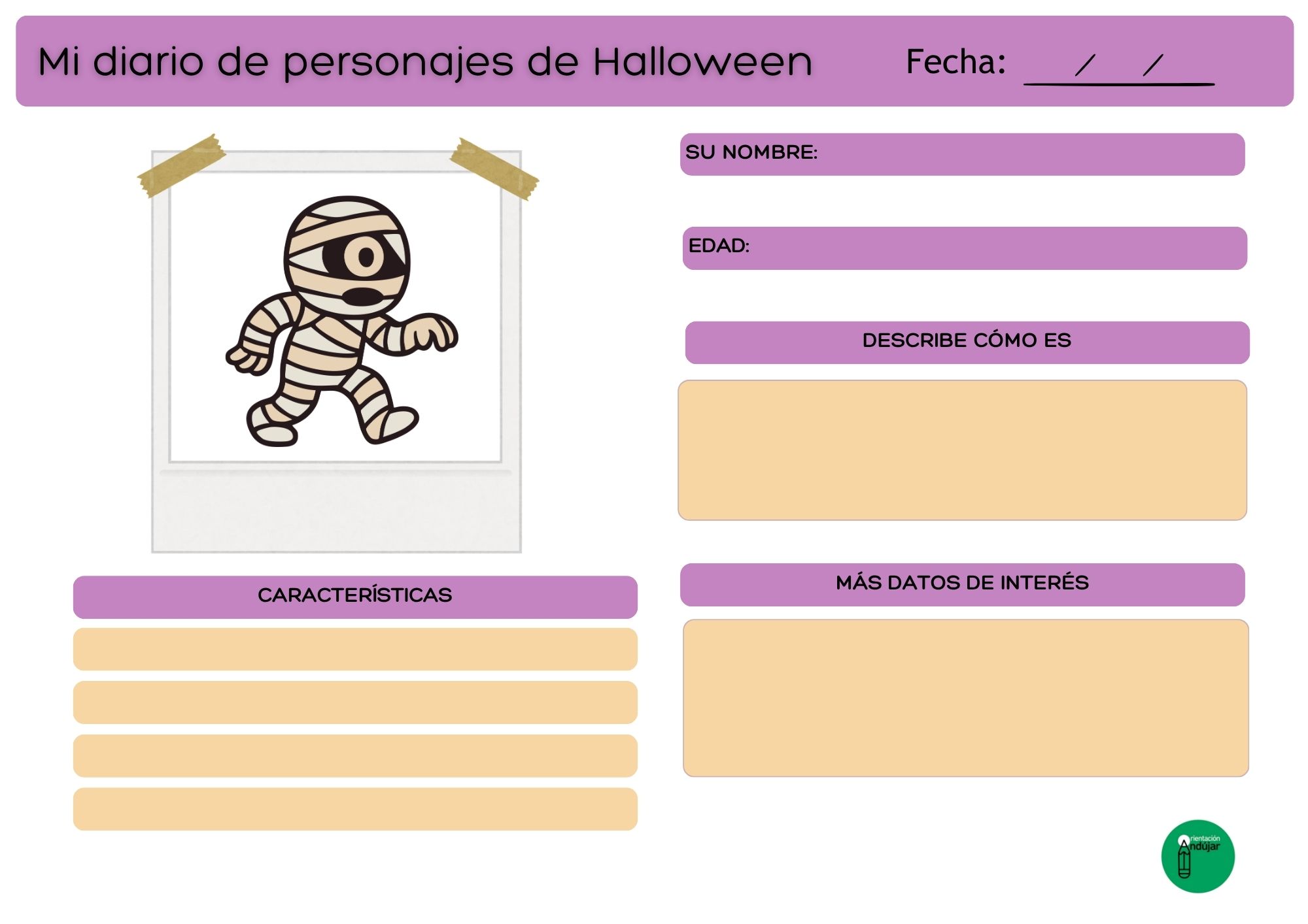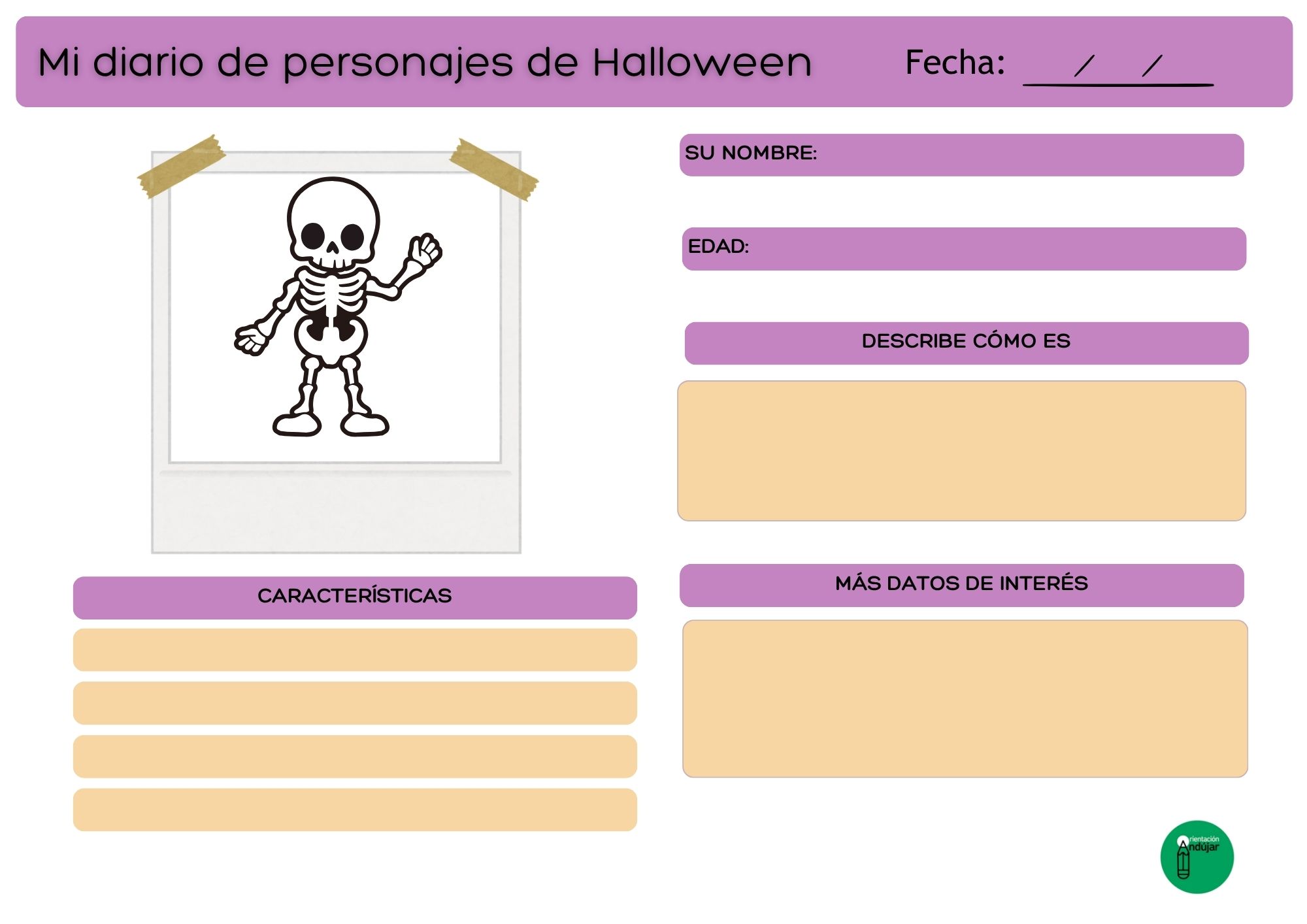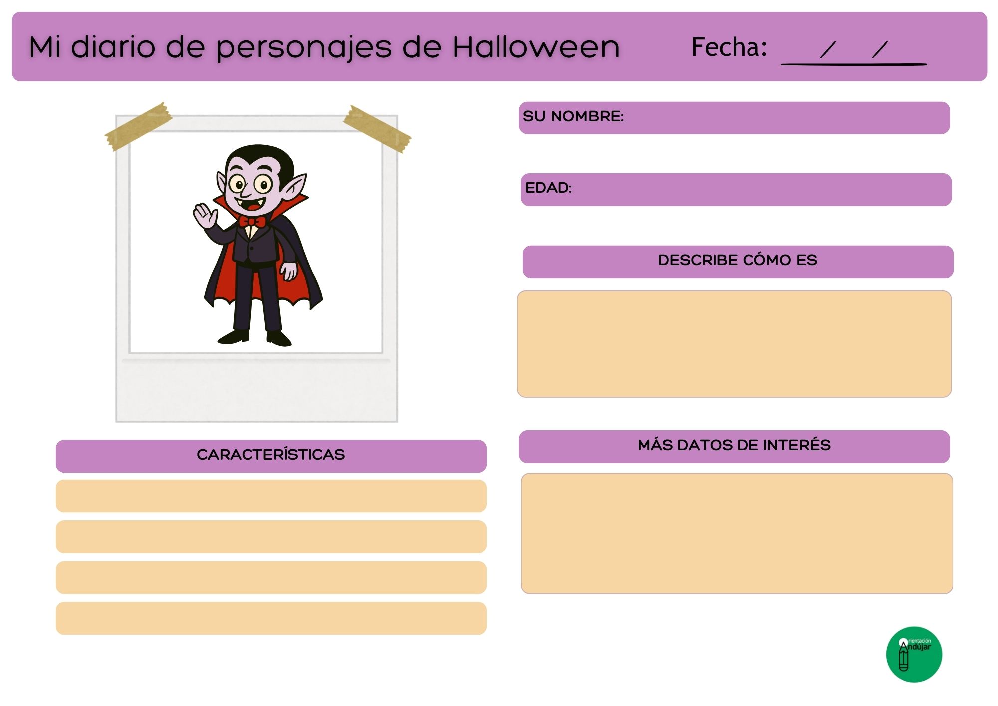 Se trata de un “diario de personajes de Halloween”, en el que los alumnos podrán dejar volar su imaginación. En cada plantilla aparece la imagen de un personaje (bruja, vampiro, fantasma, momia, zombi, entre otros) y apartados para completar con datos inventados por ellos mismos, sobre su edad, su nombre, sus características y hasta una breve descripción.