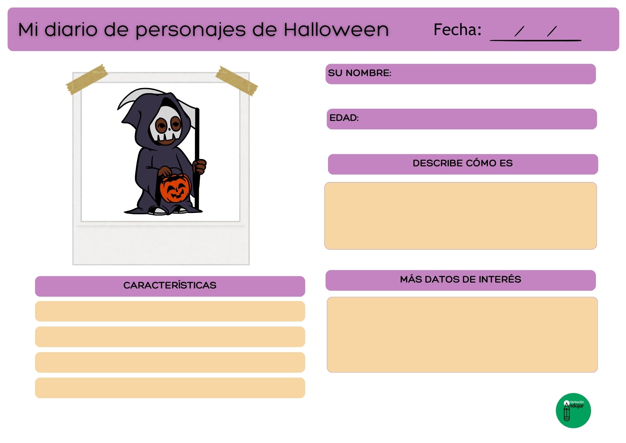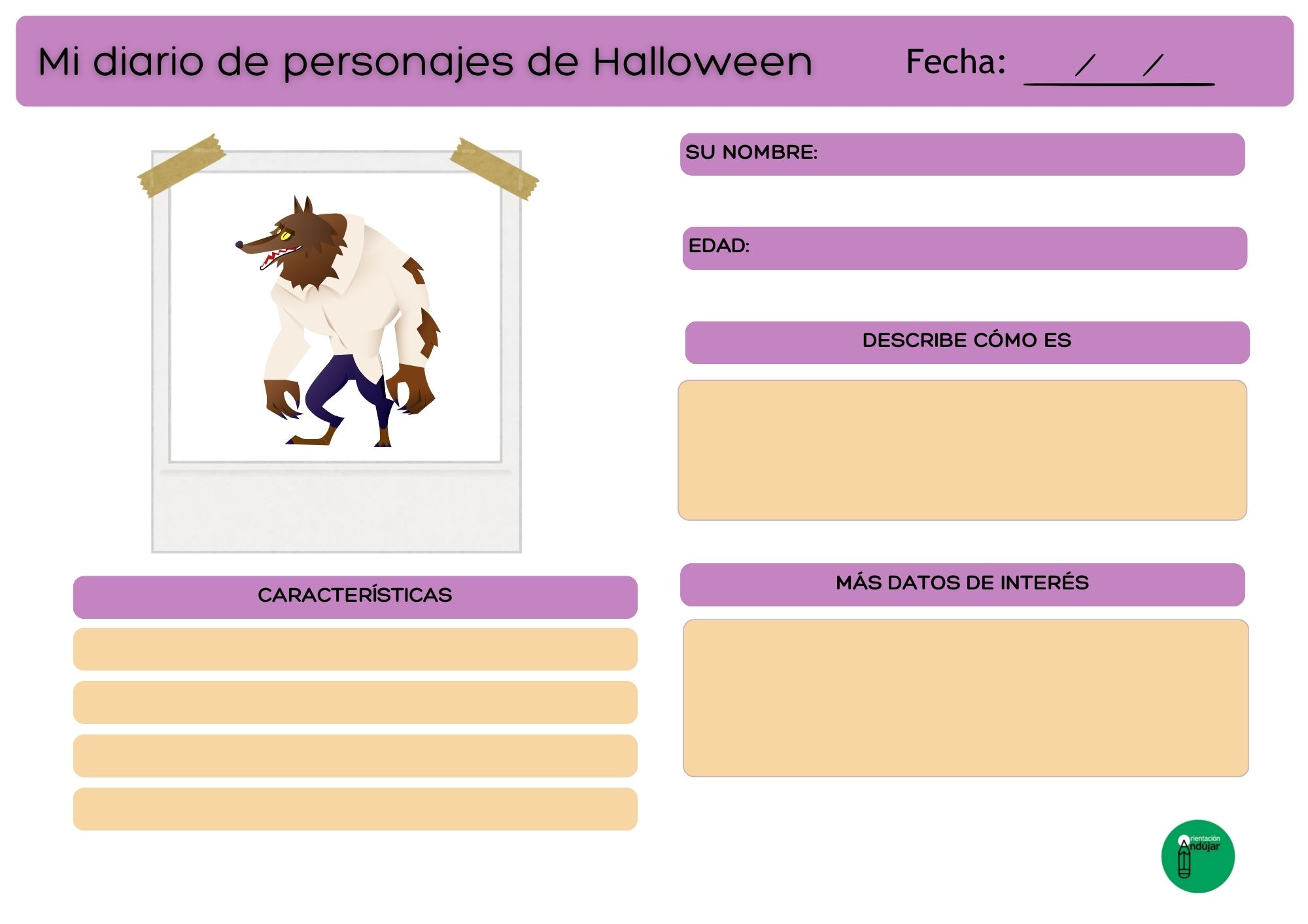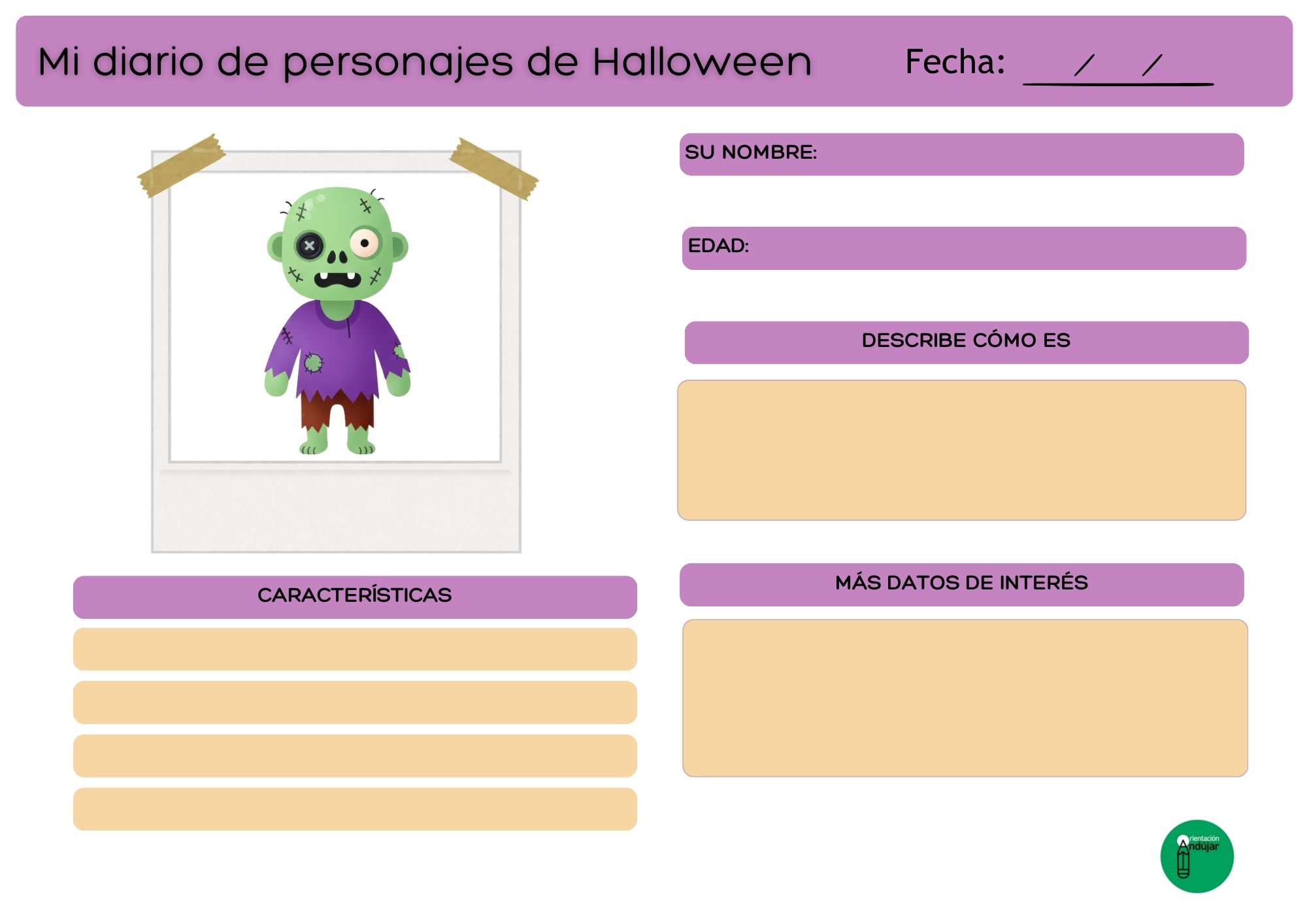 Se trata de un “diario de personajes de Halloween”, en el que los alumnos podrán dejar volar su imaginación. En cada plantilla aparece la imagen de un personaje (bruja, vampiro, fantasma, momia, zombi, entre otros) y apartados para completar con datos inventados por ellos mismos, sobre su edad, su nombre, sus características y hasta una breve descripción.