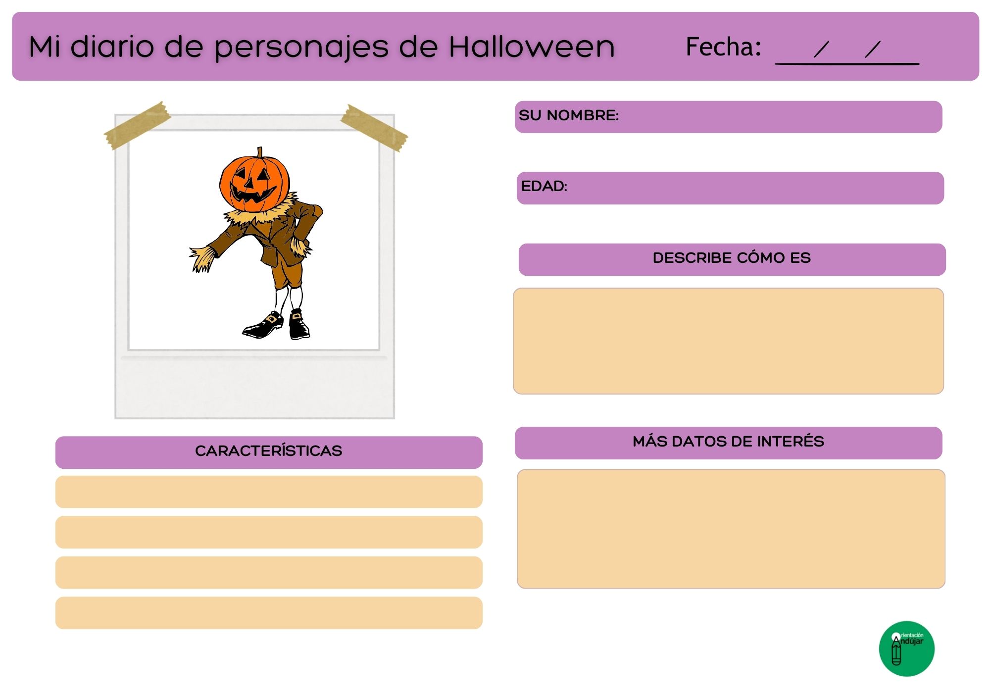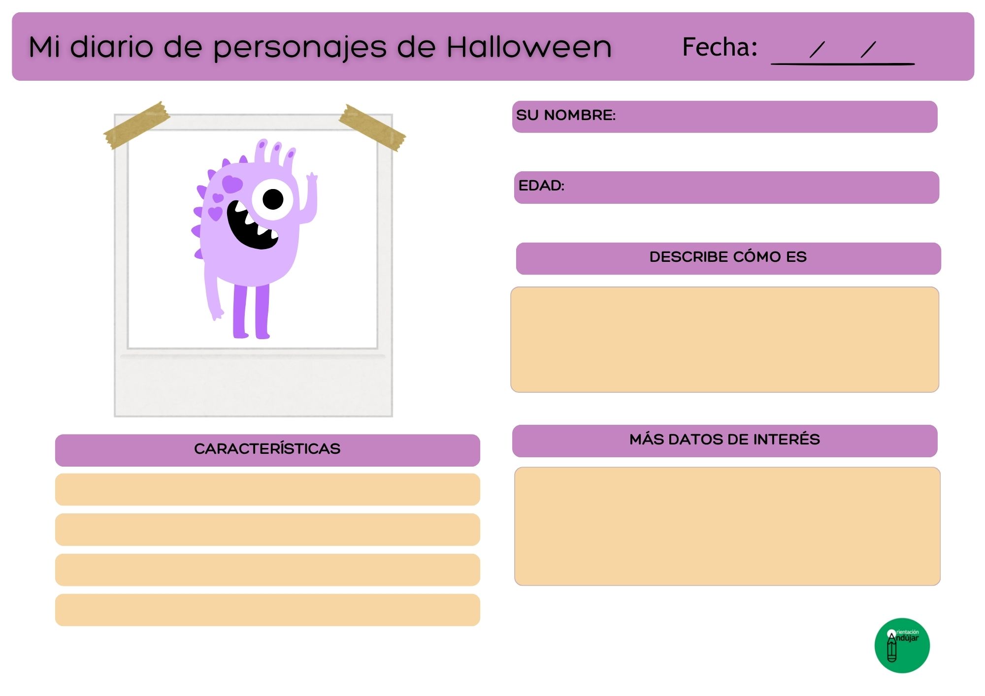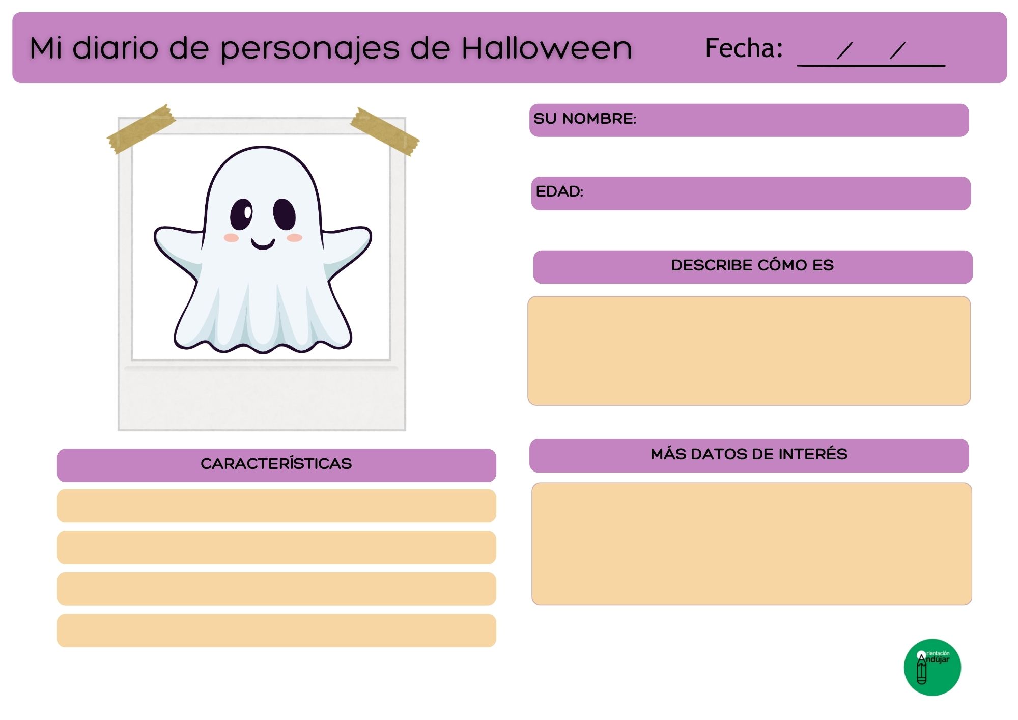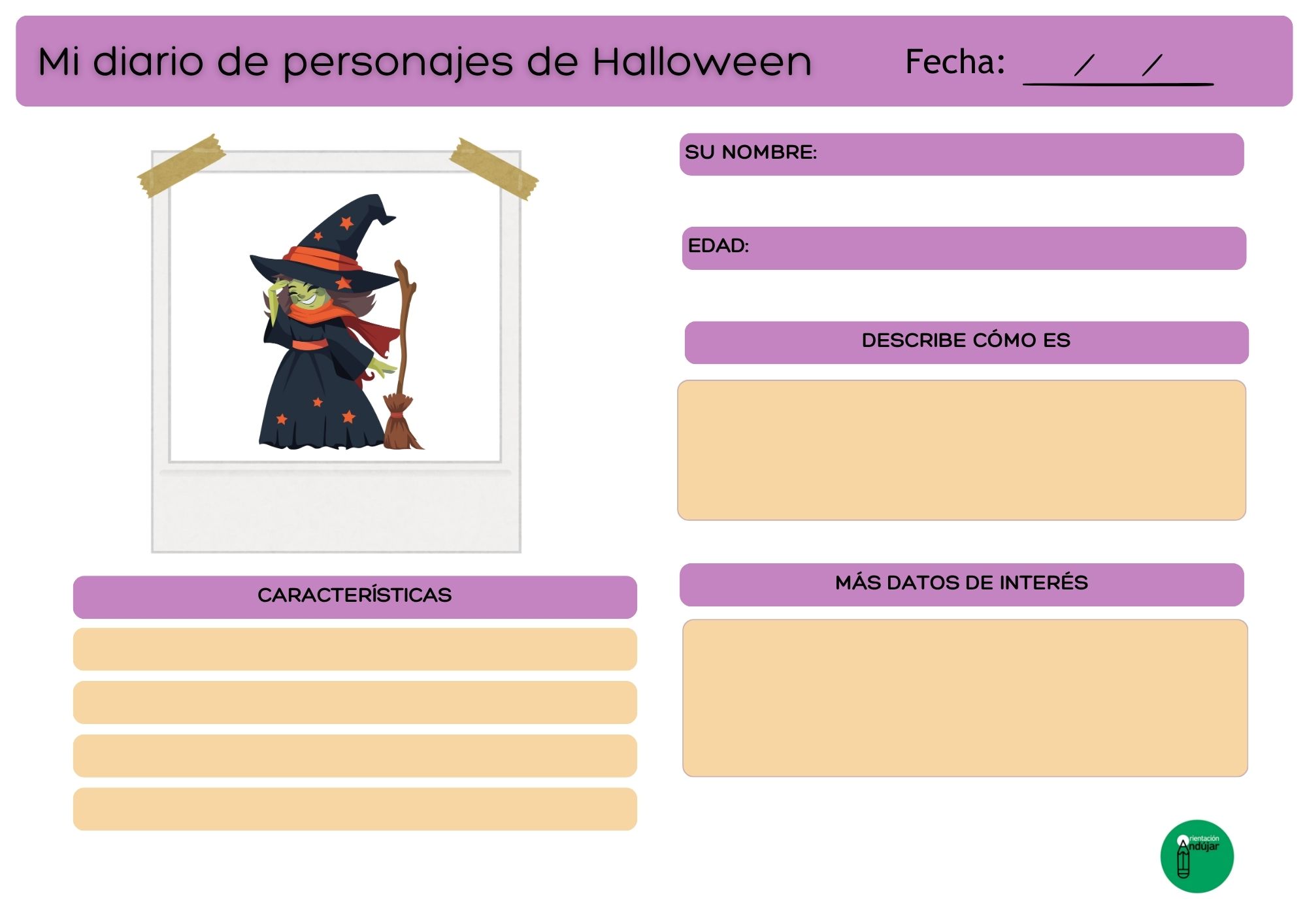 Se trata de un “diario de personajes de Halloween”, en el que los alumnos podrán dejar volar su imaginación. En cada plantilla aparece la imagen de un personaje (bruja, vampiro, fantasma, momia, zombi, entre otros) y apartados para completar con datos inventados por ellos mismos, sobre su edad, su nombre, sus características y hasta una breve descripción.