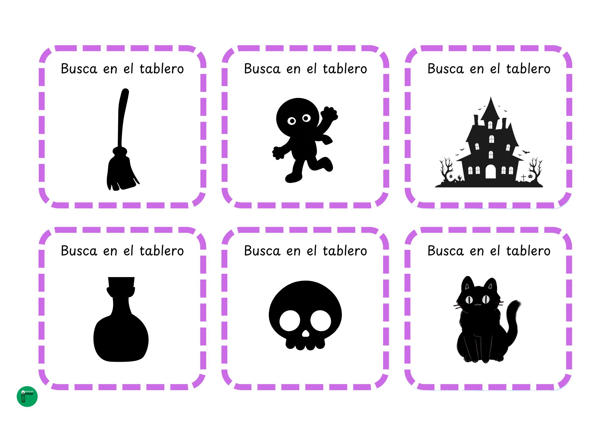 El material está formado por un tablero lleno de dibujos de Halloween —calabazas, fantasmas, murciélagos, sombreros de bruja…— y una colección de cartas con las siluetas de esos mismos objetos. El reto para los alumnos es sencillo pero súper estimulante: toman una carta, observan su silueta y deben encontrar rápidamente la imagen correspondiente en el tablero.