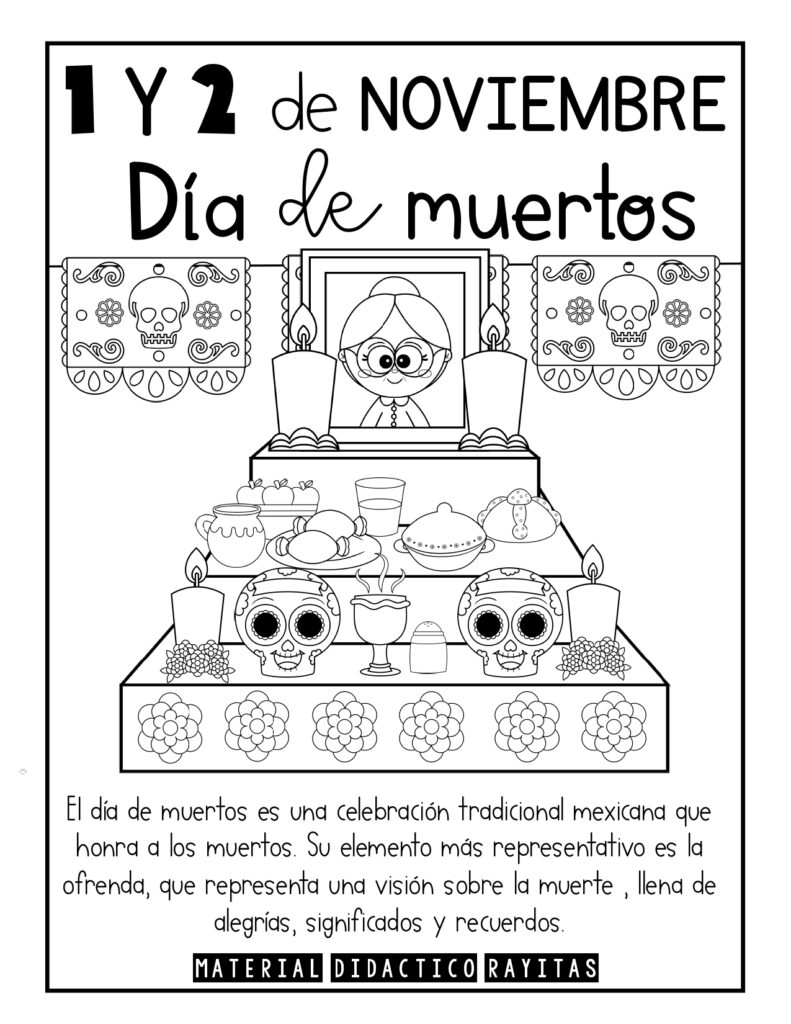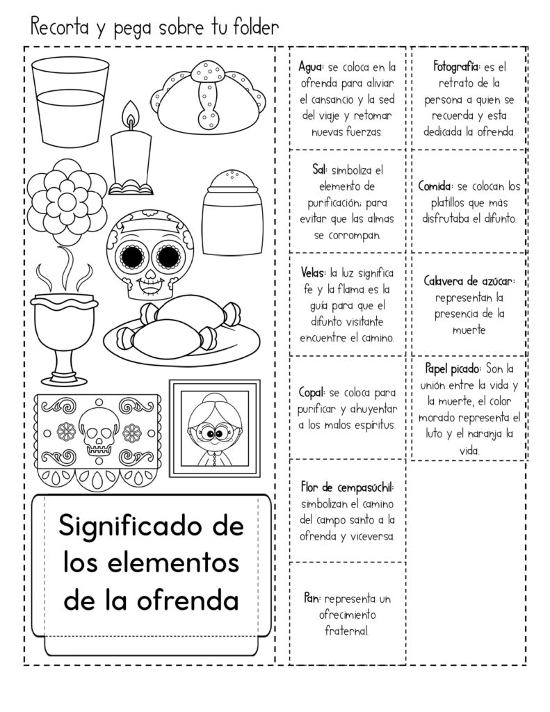Imprime las páginas y prepara una carpeta de cartulina o folder de colores. Los alumnos recortan y pegan cada pieza en su sitio, decoran con creatividad y leen la información de cada elemento. Ideal para proyectos interculturales, clases de Ciencias Sociales, Valores o Educación Artística, o como actividad especial durante la semana del 1 y 2 de noviembre.