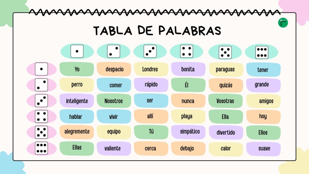 Después de 2 o 3 tiradas, cuando tenga varias palabras, el alumno debe crear una oración que incluya todas las palabras obtenidas.