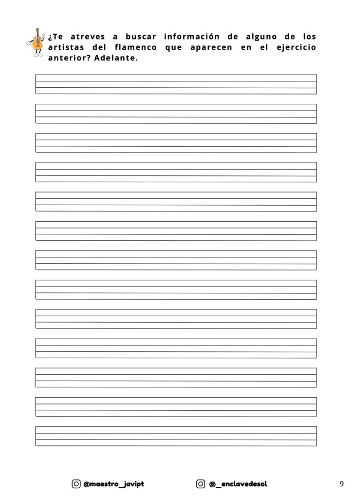Las actividades se pueden trabajar de forma individual o cooperativa, e incluso puedes crear un mural flamenco del aula con los dibujos, textos y artistas investigados.