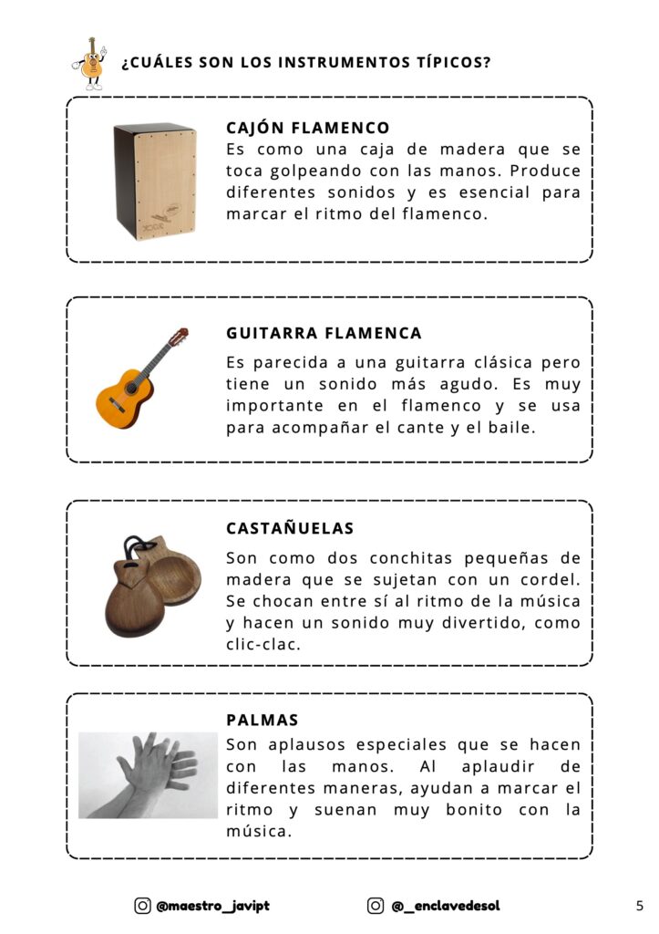 🥁 Actividades de instrumentos flamencos, como el cajón, las palmas, las castañuelas y la guitarra.