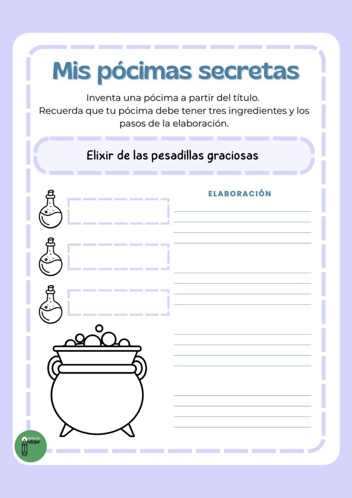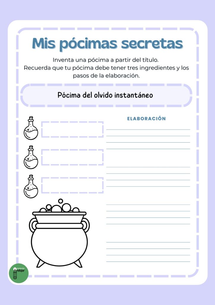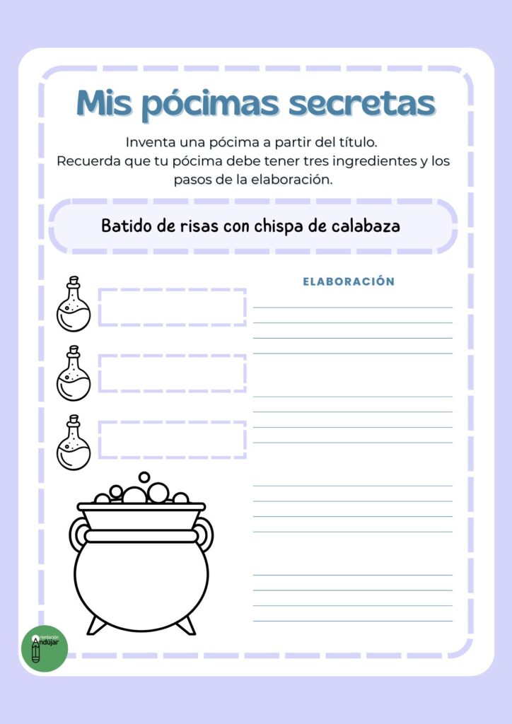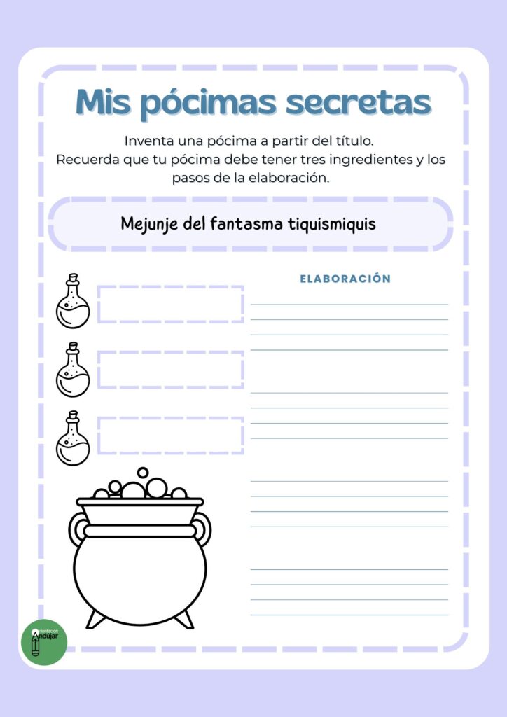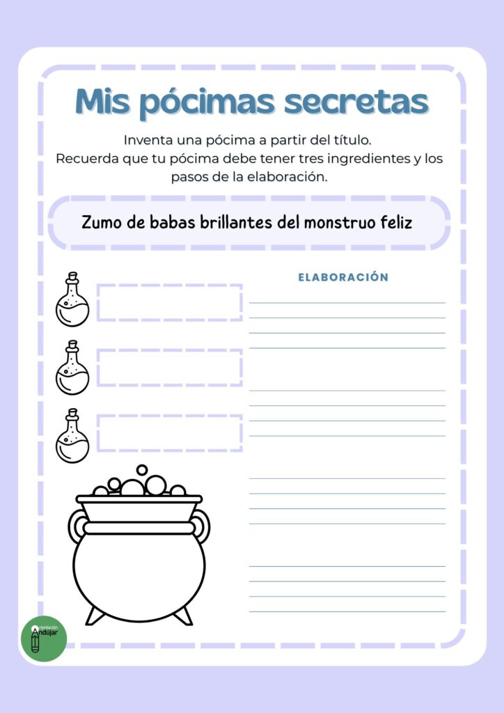 Esta divertida actividad de escritura creativa propone a los alumnos convertirse en auténticos hechiceros y brujitas, inventando sus propias pócimas mágicas a partir de títulos llenos de fantasía.