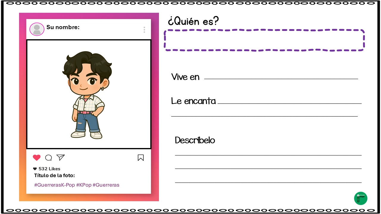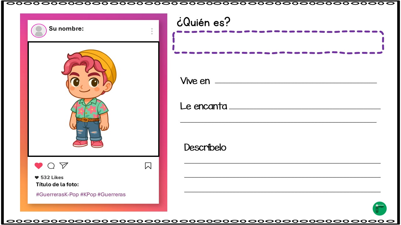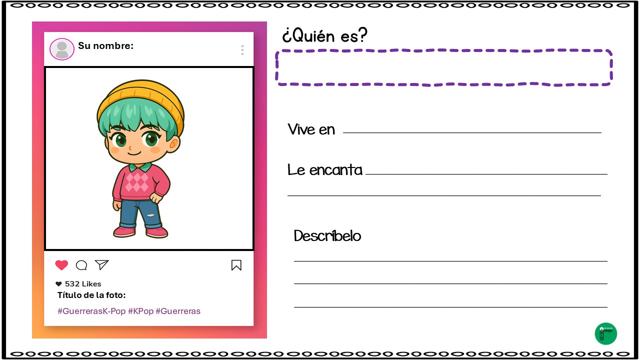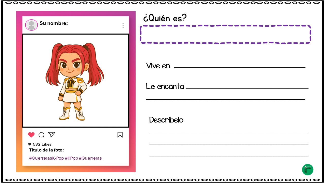 Hoy te traemos una actividad creativa y lúdica para tus alumnos: simular el perfil de Instagram de cada personaje de Las Guerreras K-Pop. Con esta dinámica, los estudiantes no solo ejercitan su imaginación, sino que también practican redacción, descripción y conocimientos sobre los personajes.