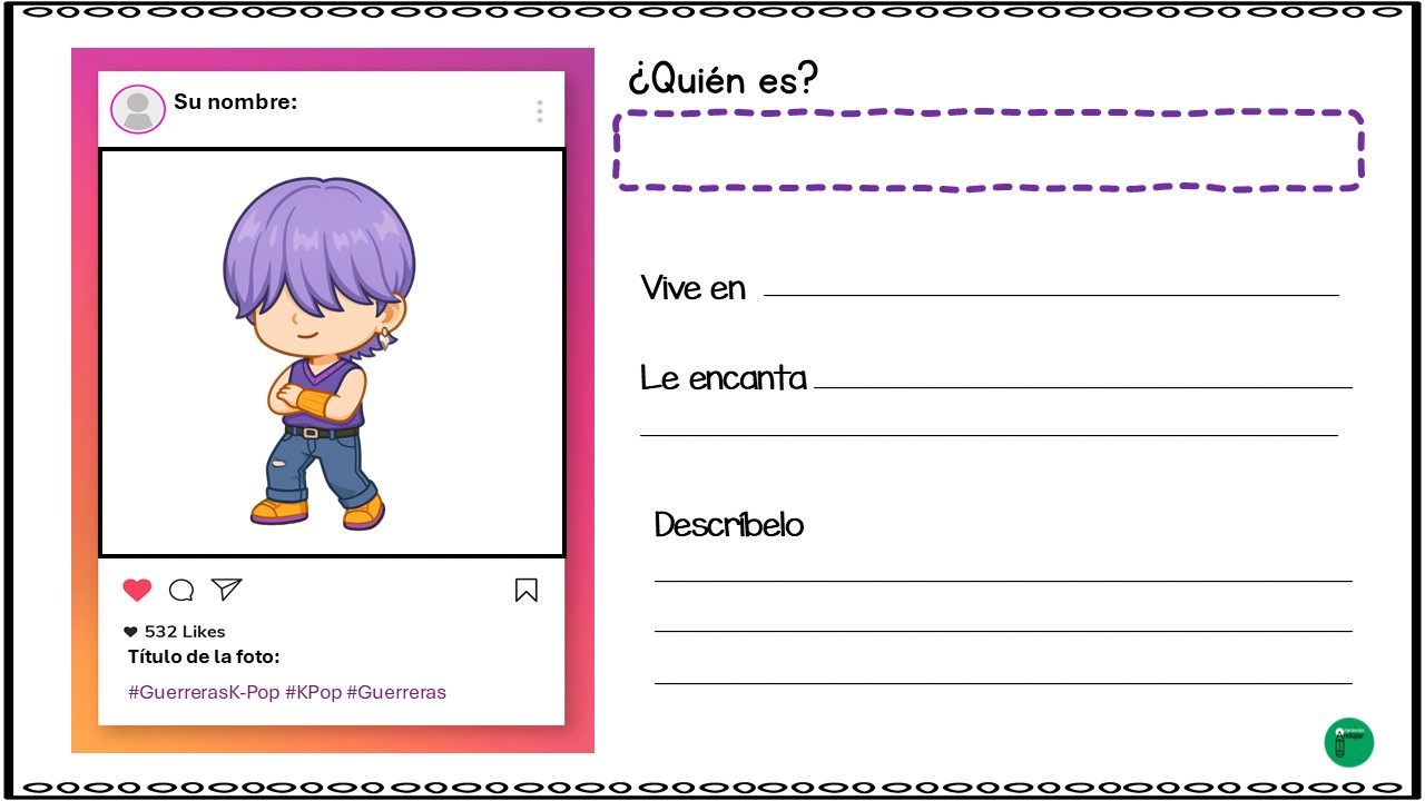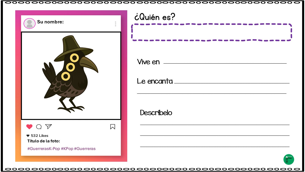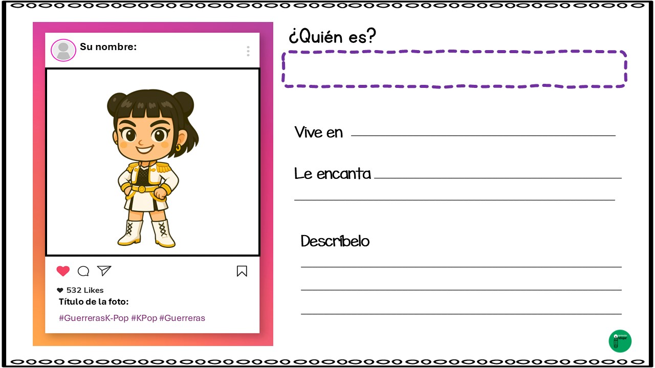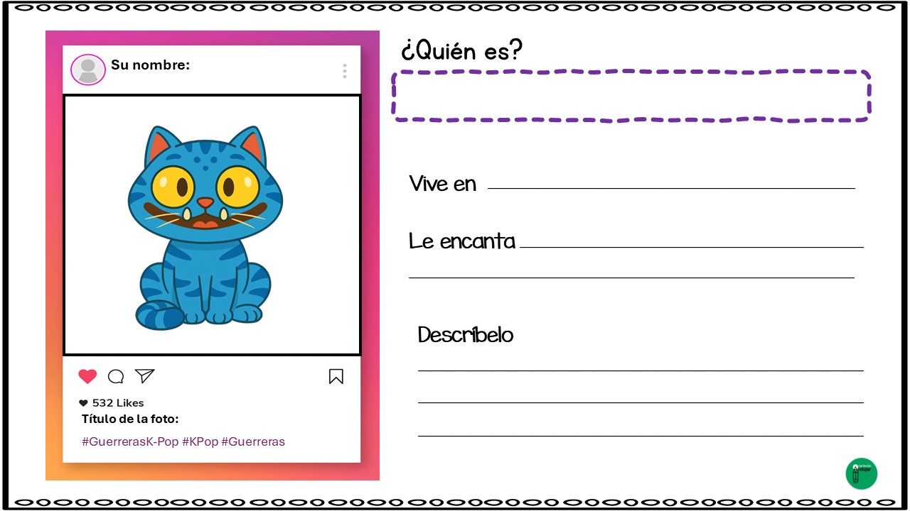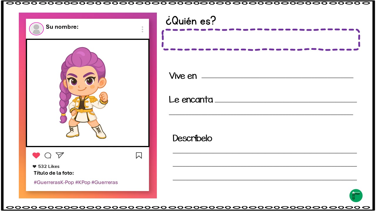 Hoy te traemos una actividad creativa y lúdica para tus alumnos: simular el perfil de Instagram de cada personaje de Las Guerreras K-Pop. Con esta dinámica, los estudiantes no solo ejercitan su imaginación, sino que también practican redacción, descripción y conocimientos sobre los personajes.