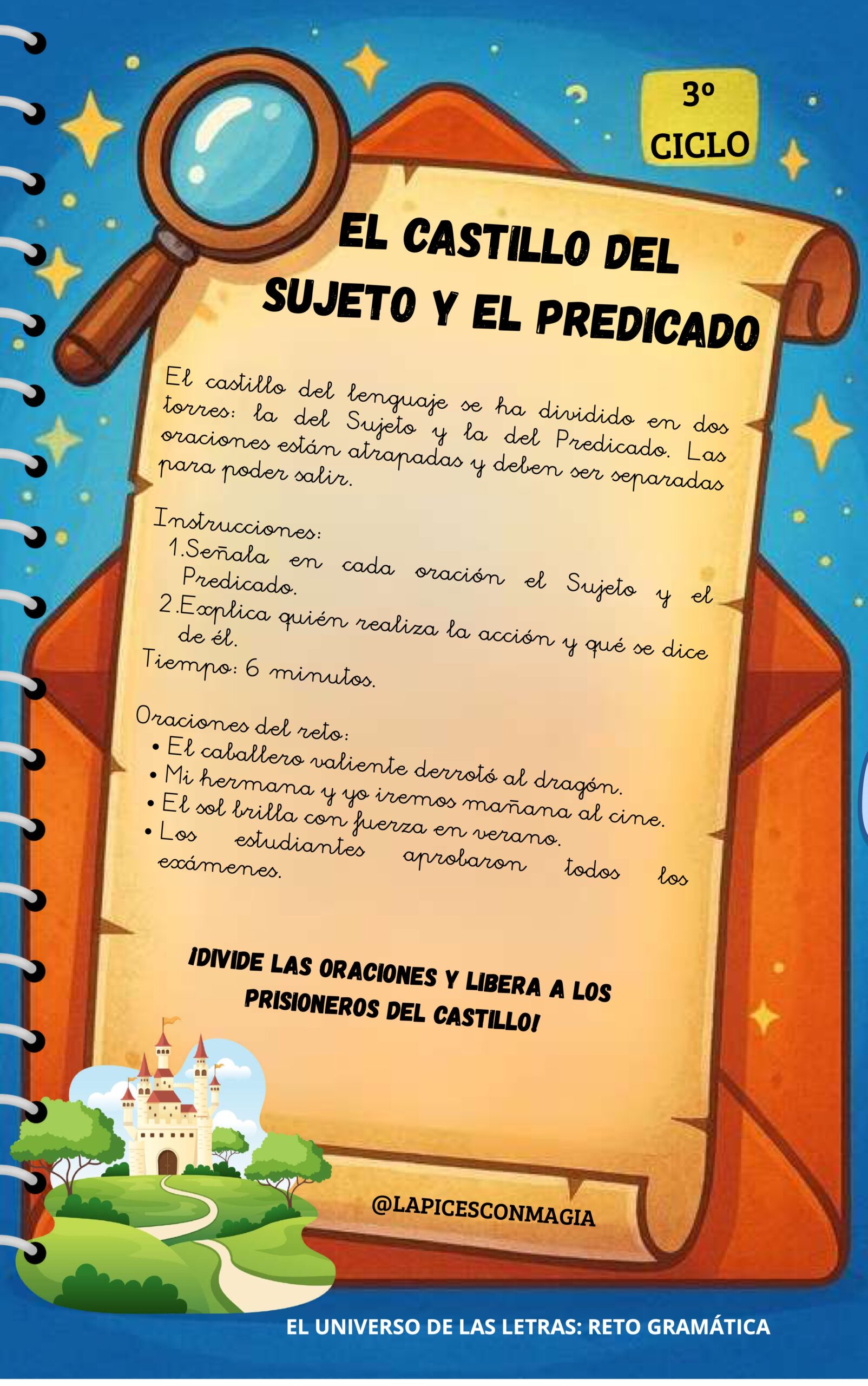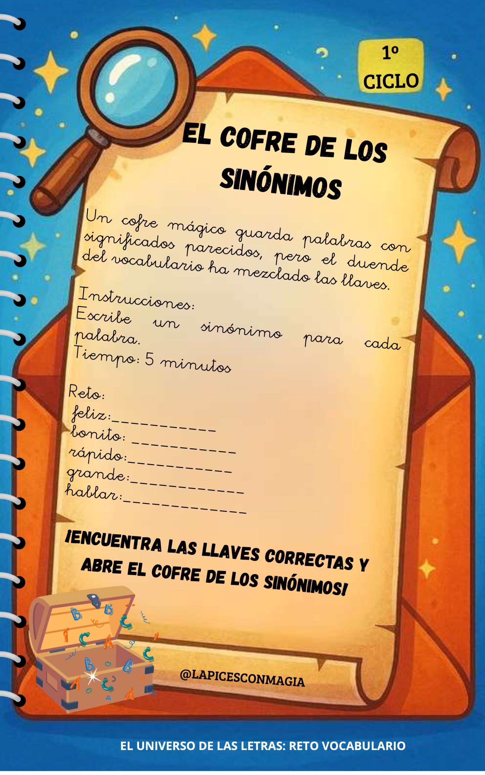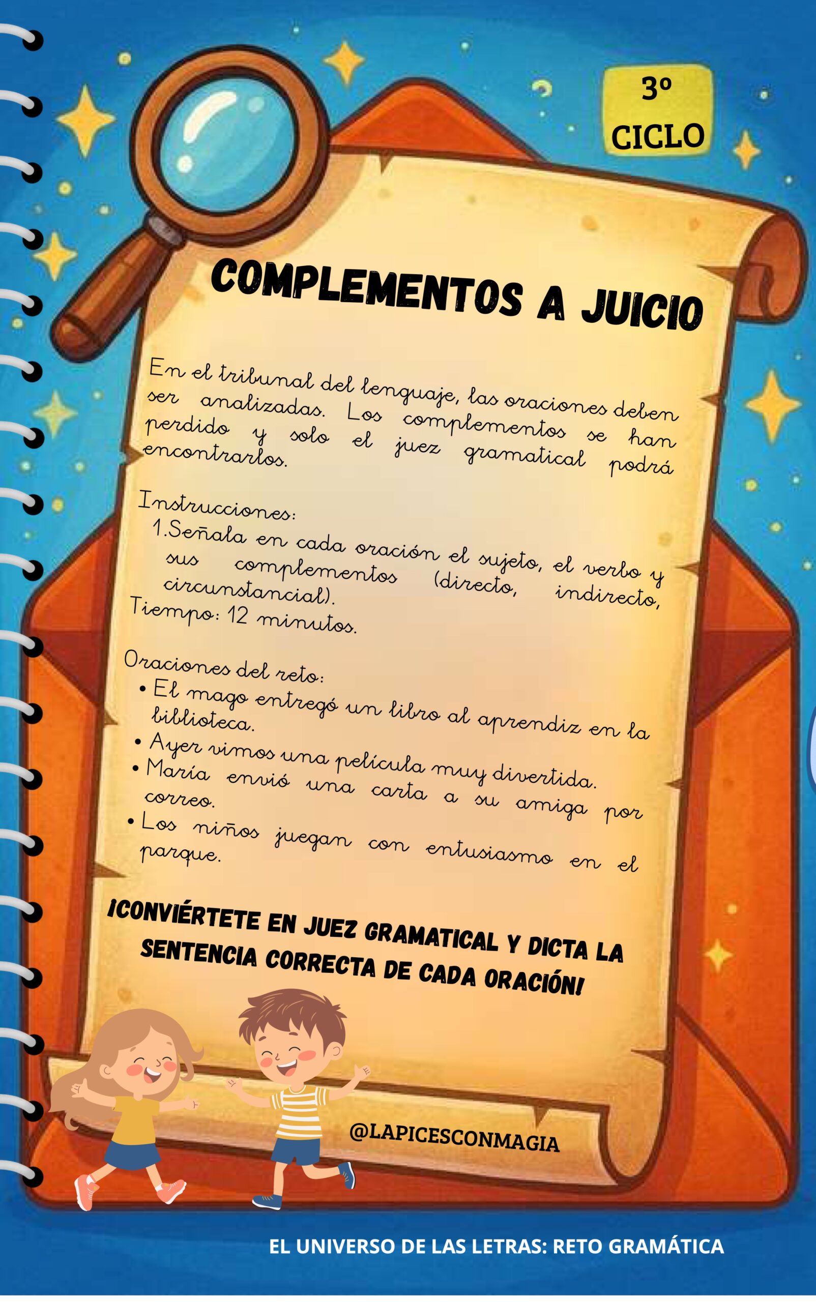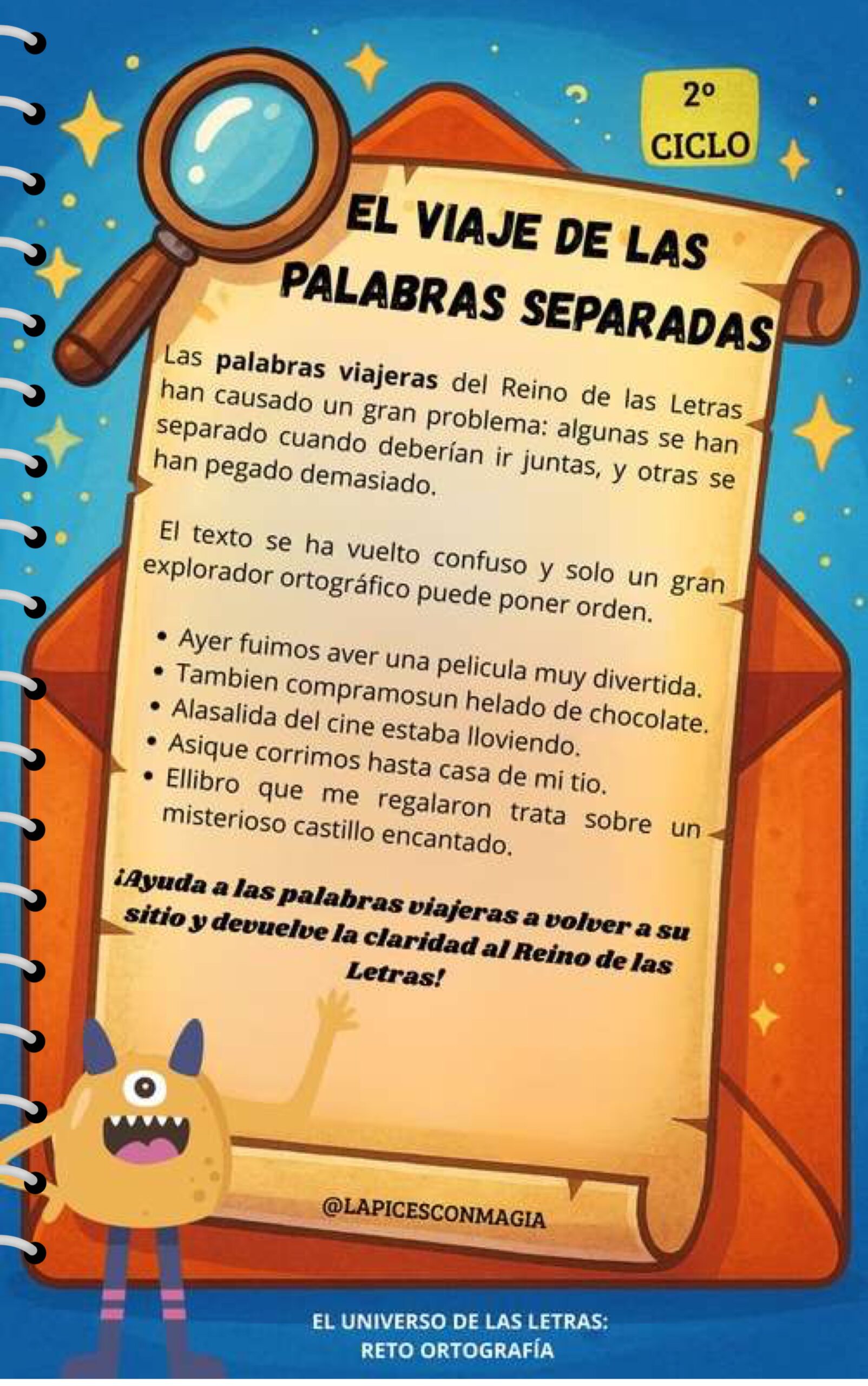 Actividades lúdicas con misiones narrativas como “El dragón de las mayúsculas”, “El cofre de los sinónimos” o “El tribunal ortográfico”.