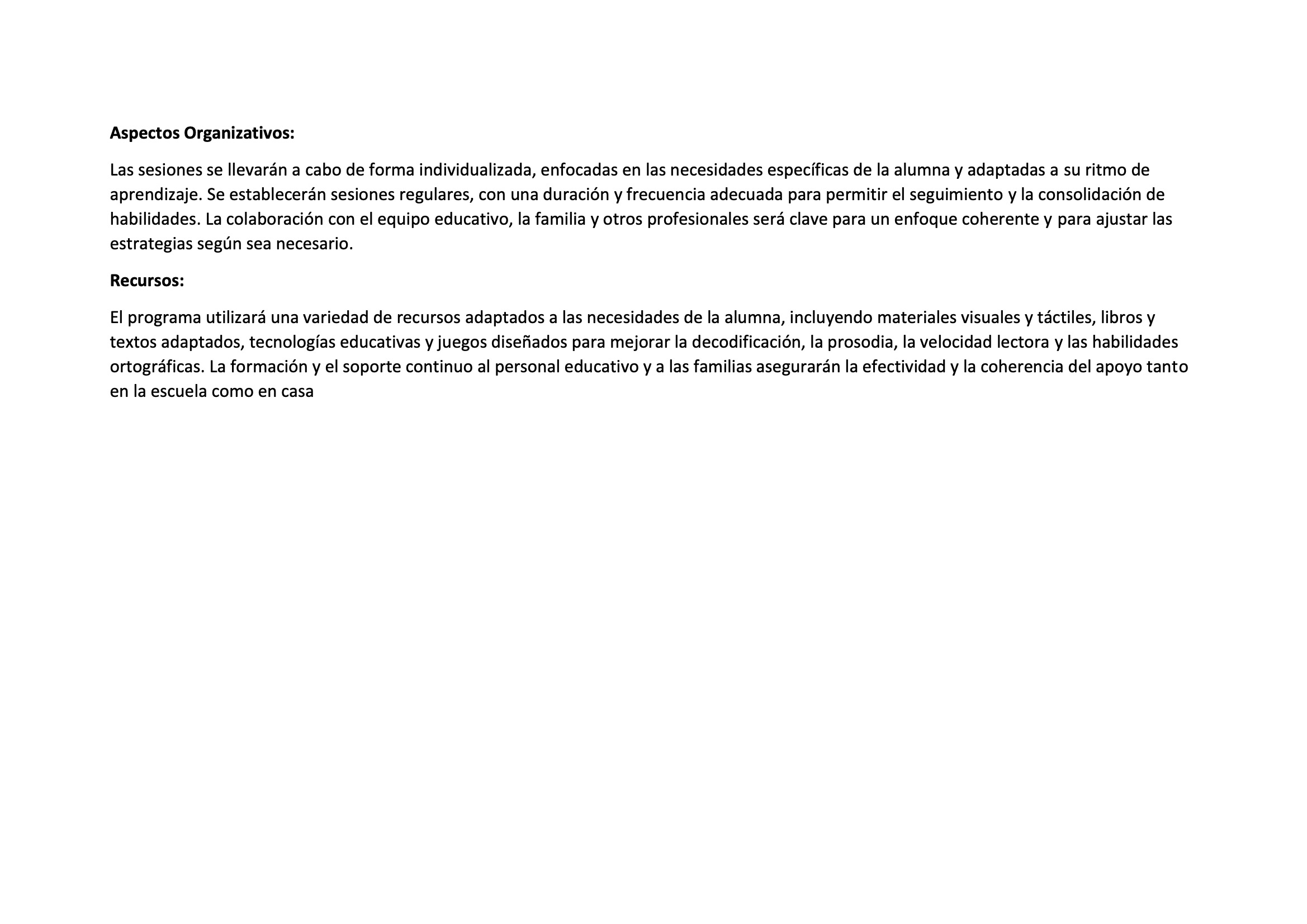 Su estructura permite planificar sesiones semanales, realizar seguimiento de progresos y adaptar las estrategias según las necesidades de cada alumno.