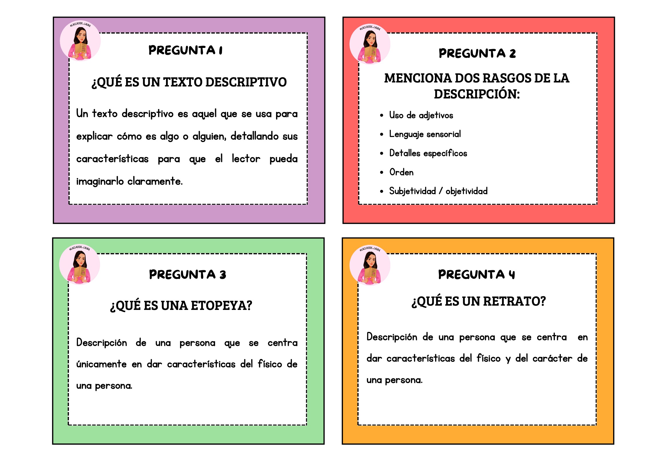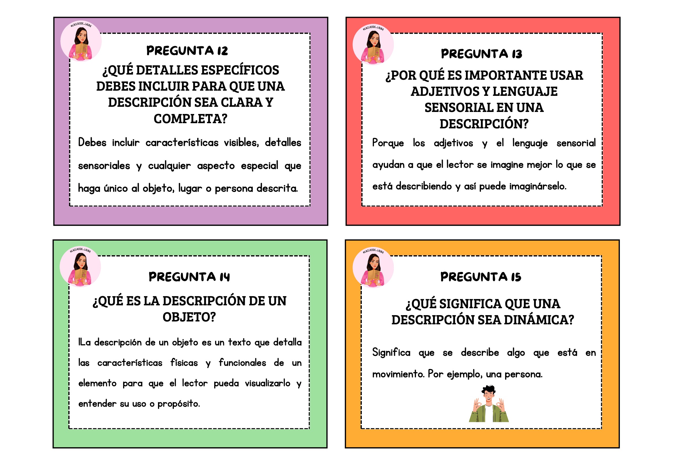 🎯 15 tarjetas de preguntas y respuestas sobre el texto descriptivo.