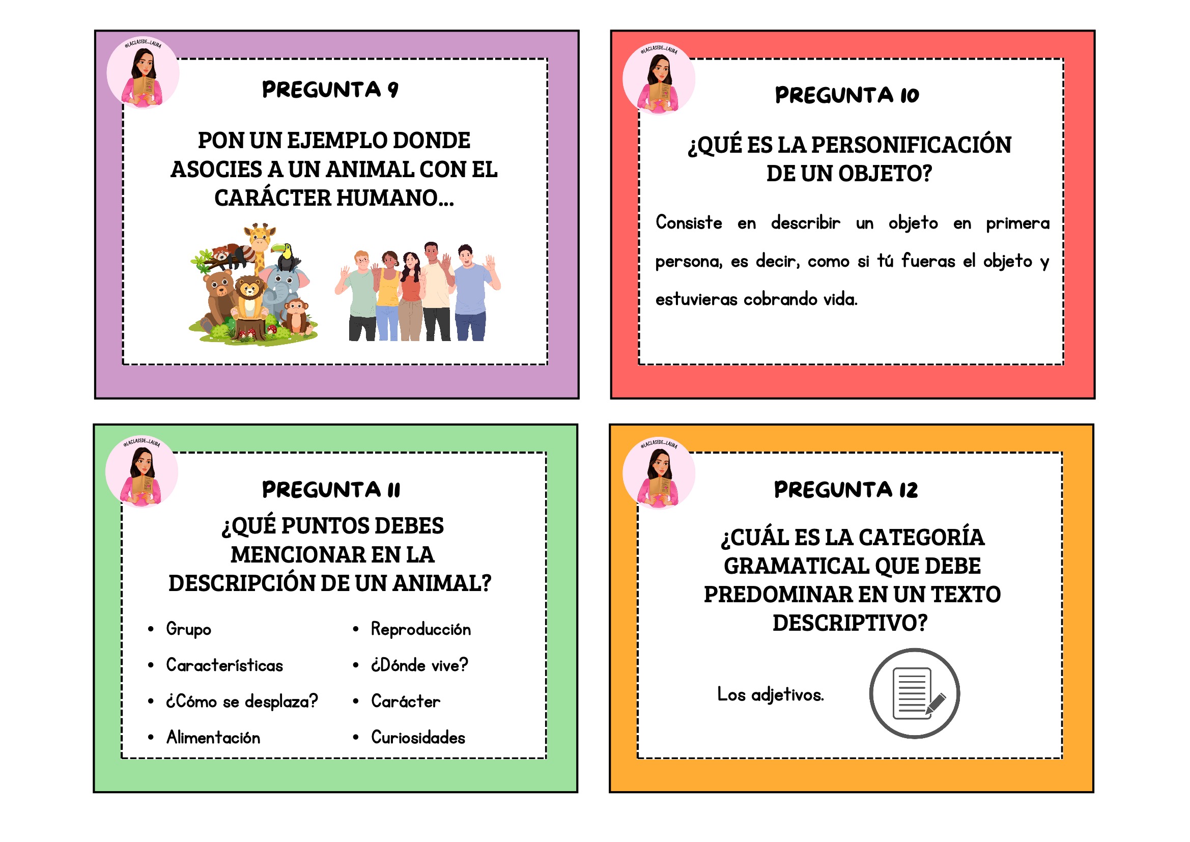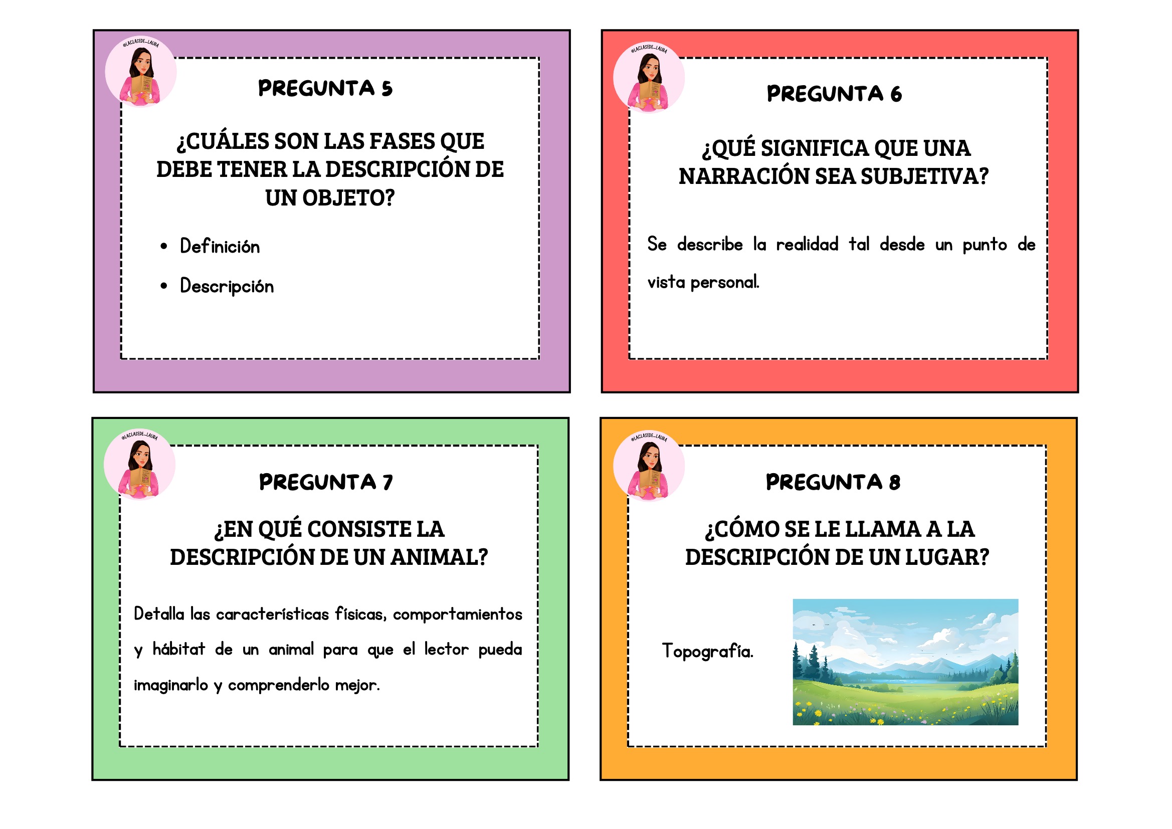 El material incluye un juego de tarjetas con preguntas y respuestas que permite trabajar conceptos clave de los textos descriptivos de manera dinámica y participativa.