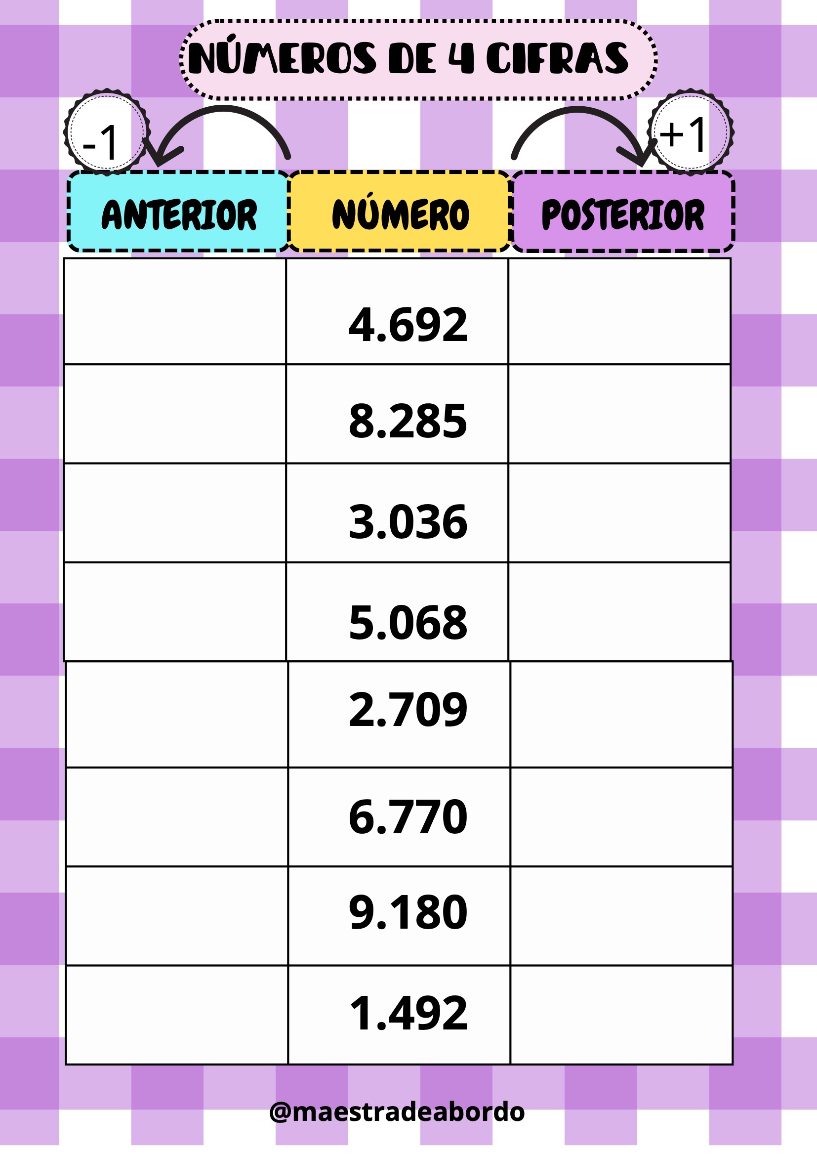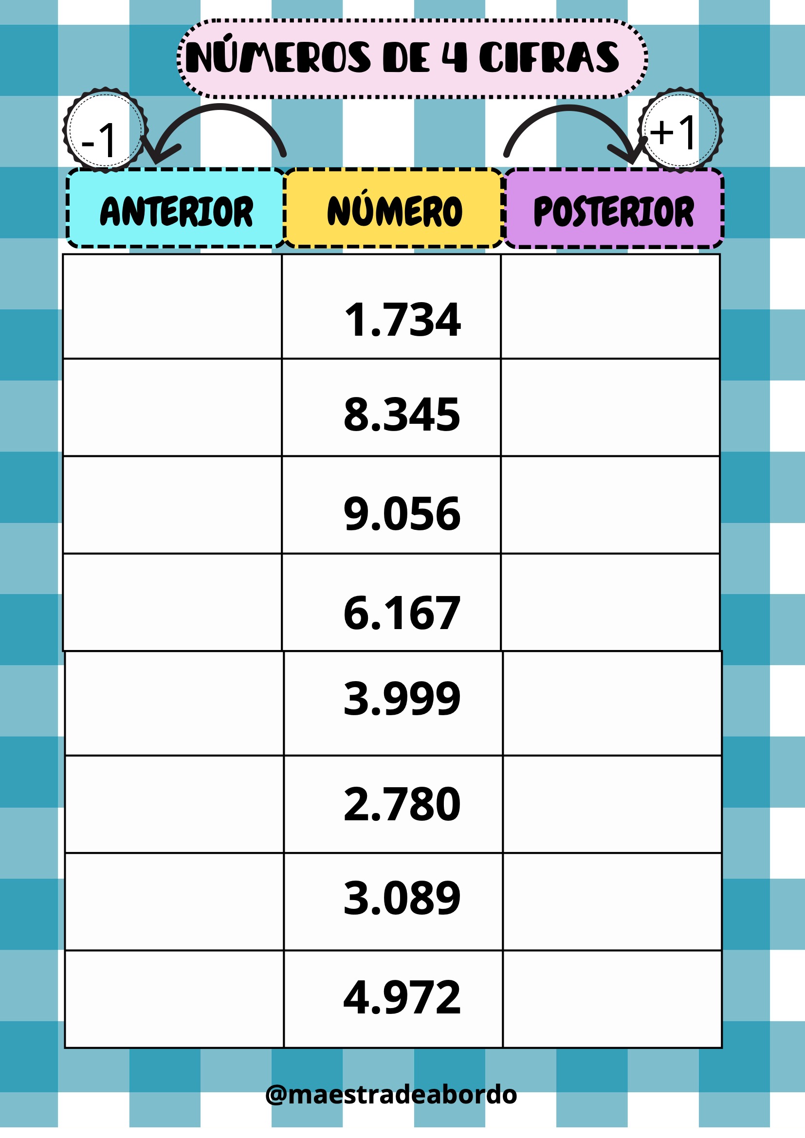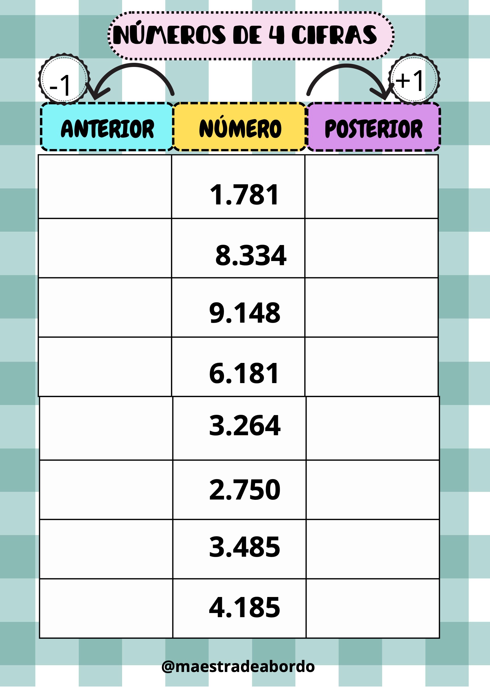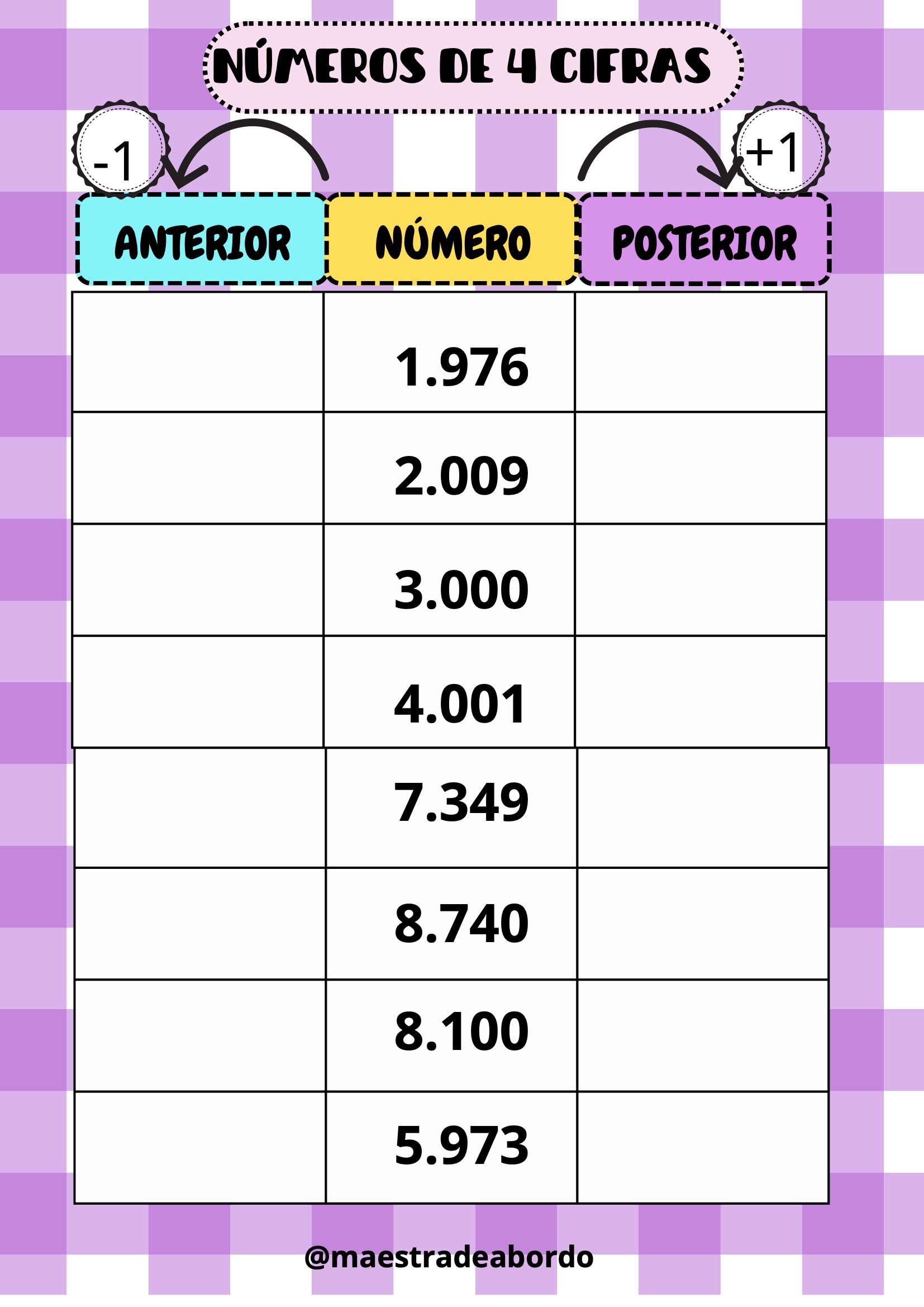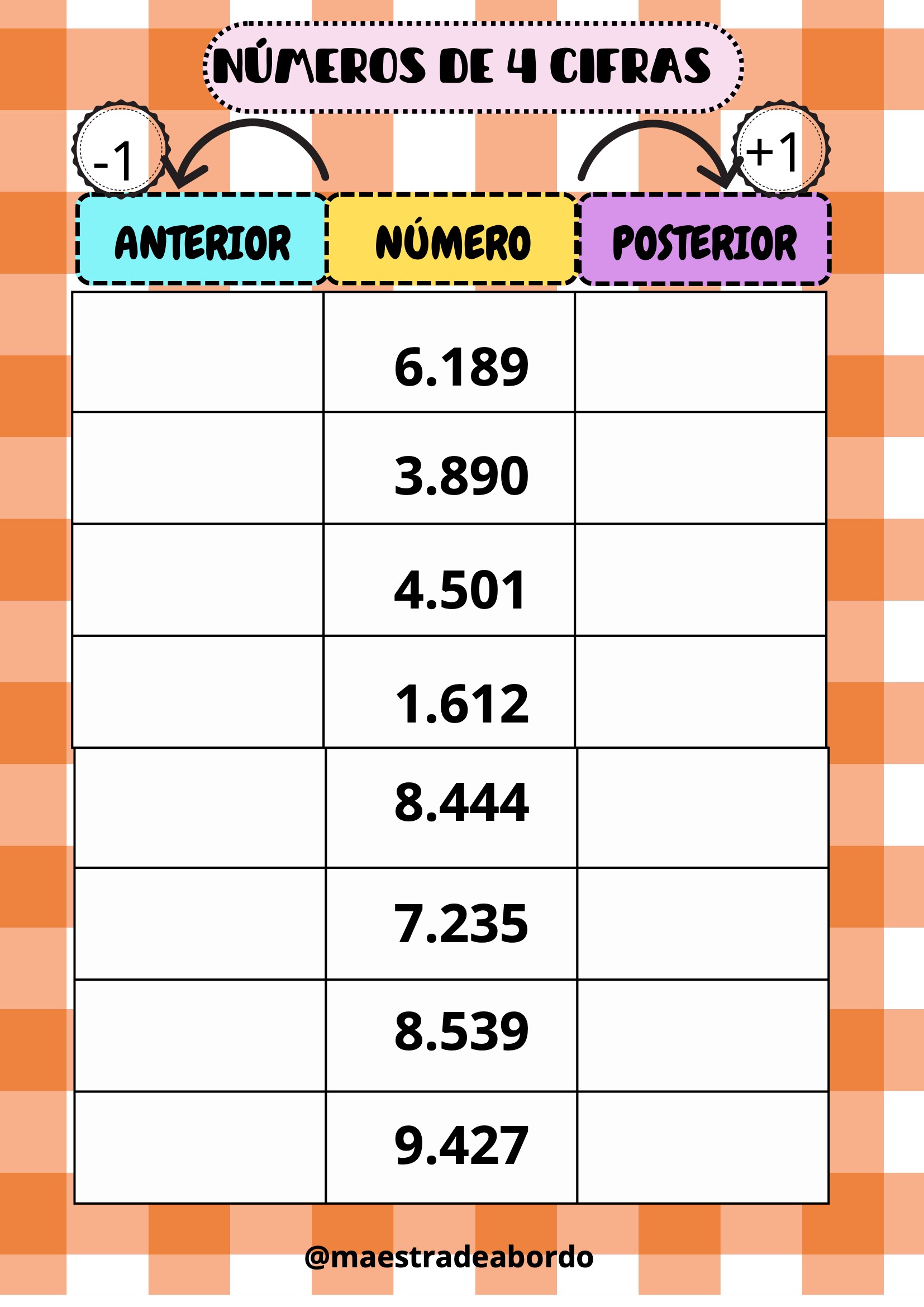 Con este recurso matemático manipulativo, los alumnos podrán reforzar el concepto de número anterior y posterior trabajando con números de cuatro cifras.