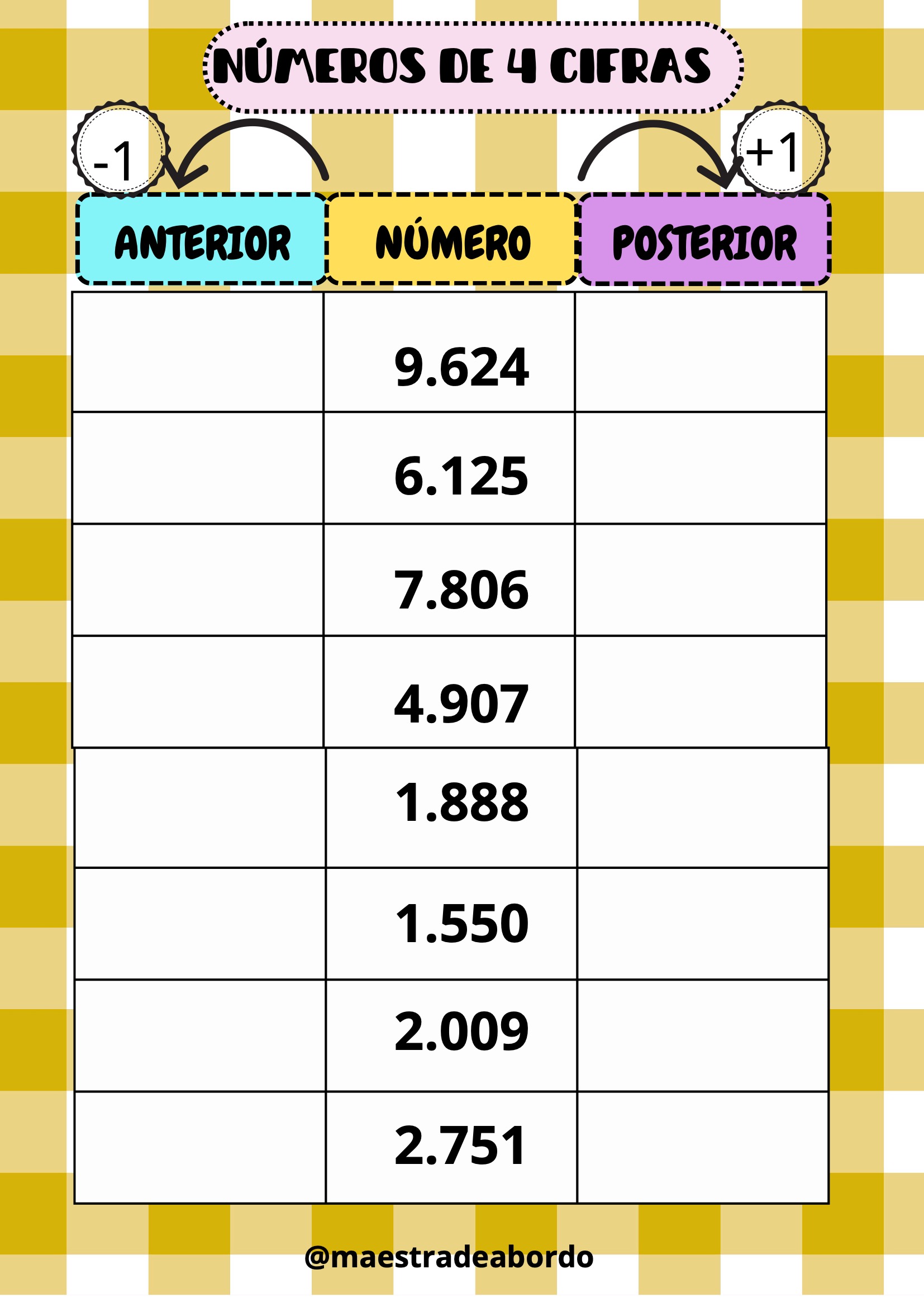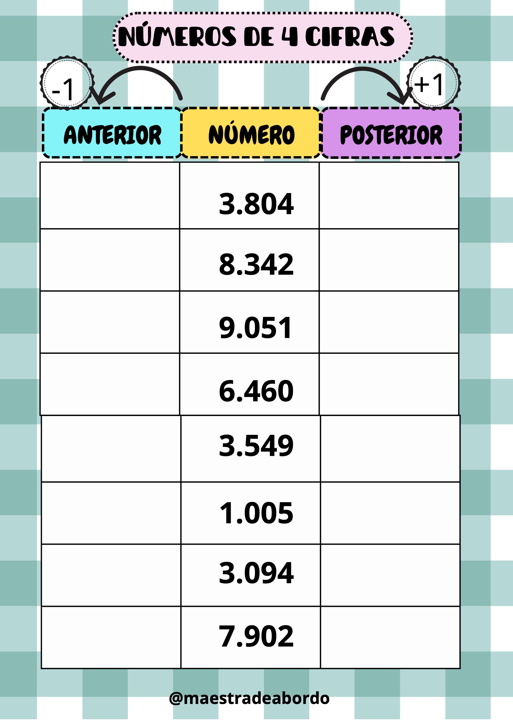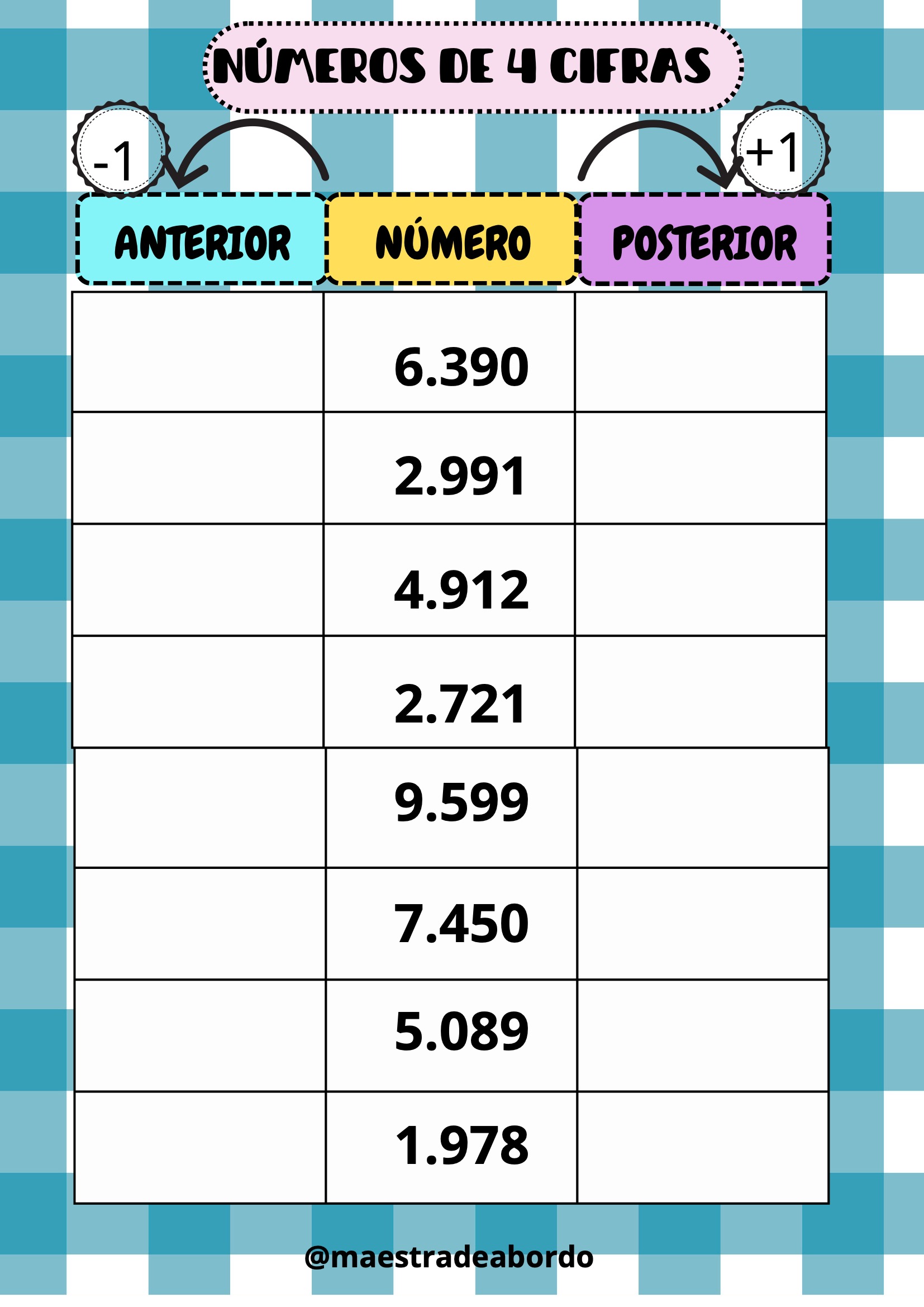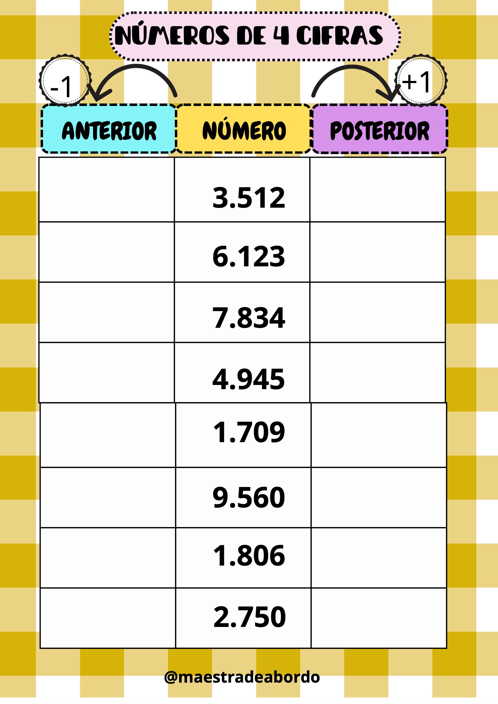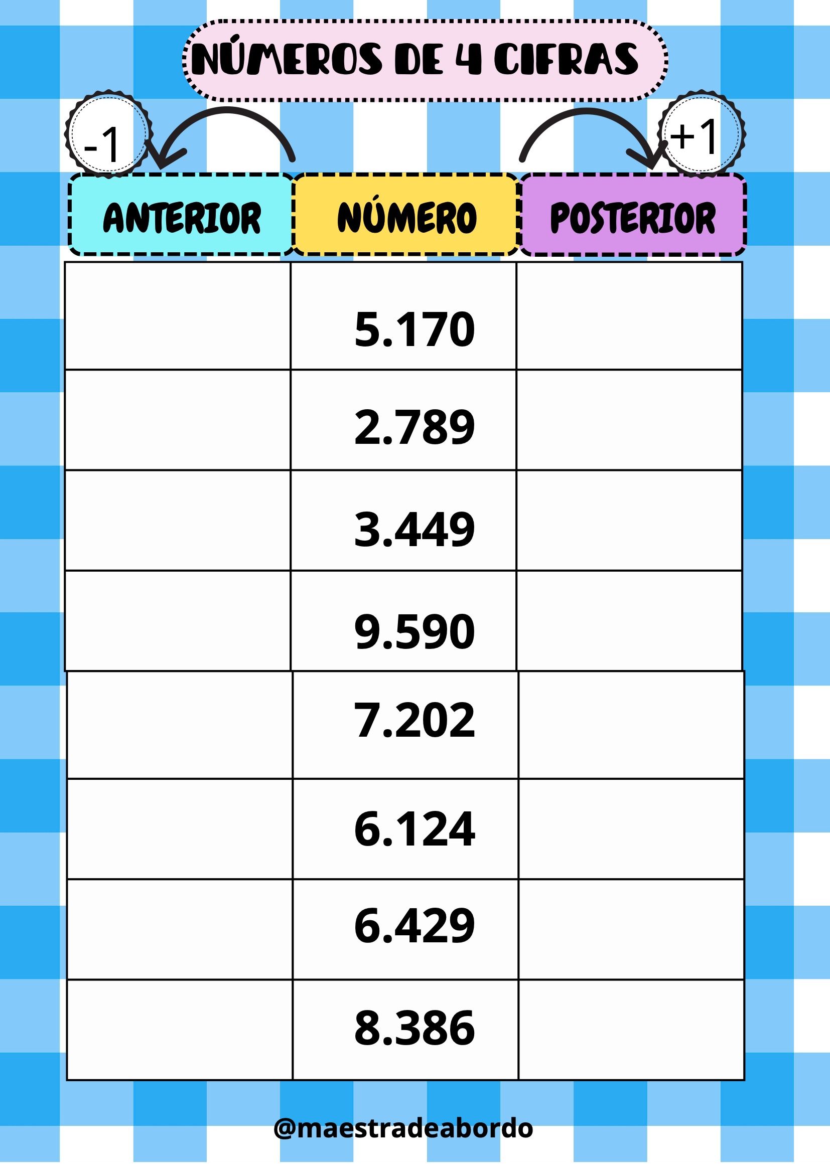 Con este recurso matemático manipulativo, los alumnos podrán reforzar el concepto de número anterior y posterior trabajando con números de cuatro cifras.