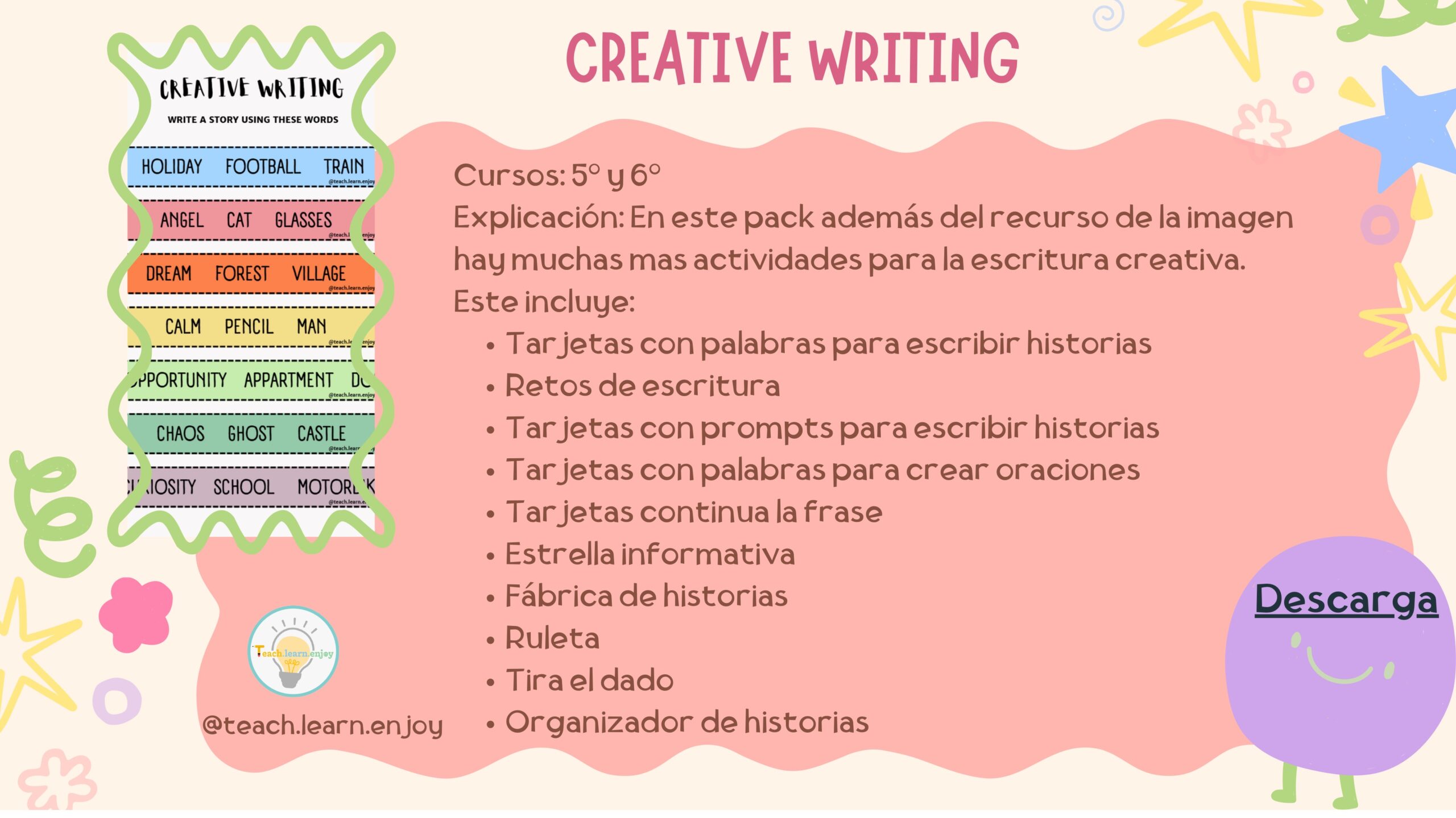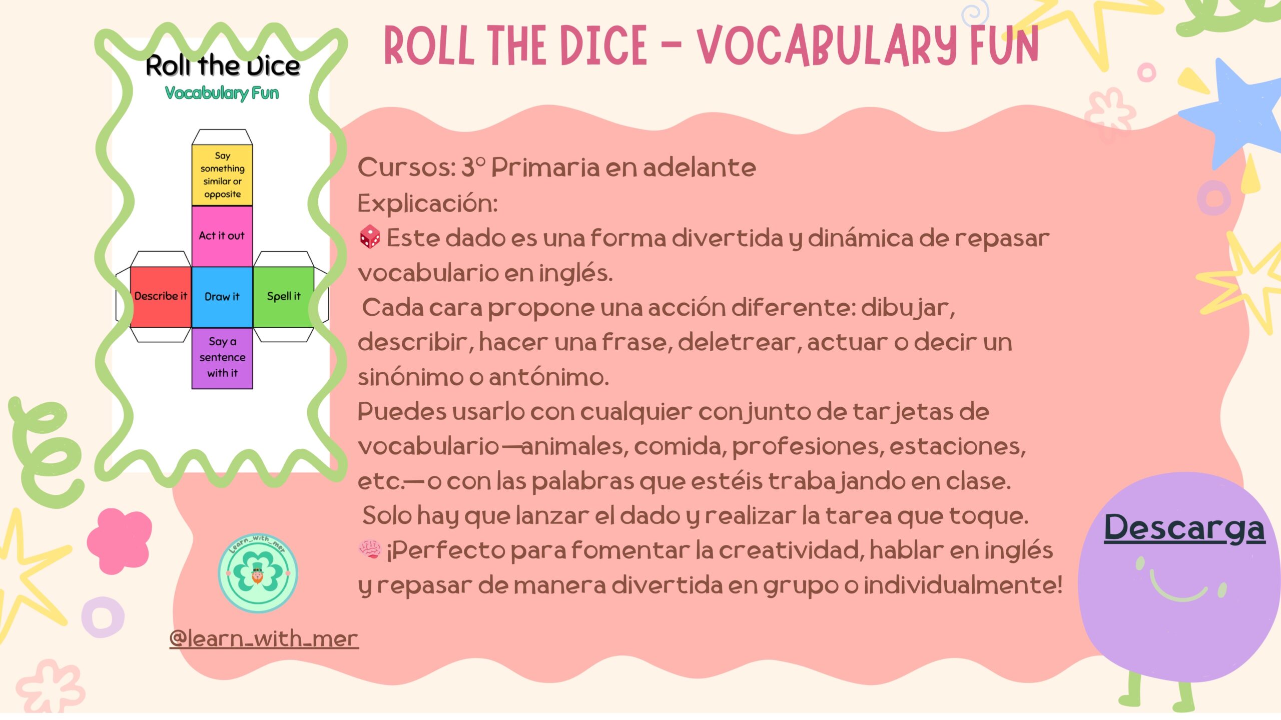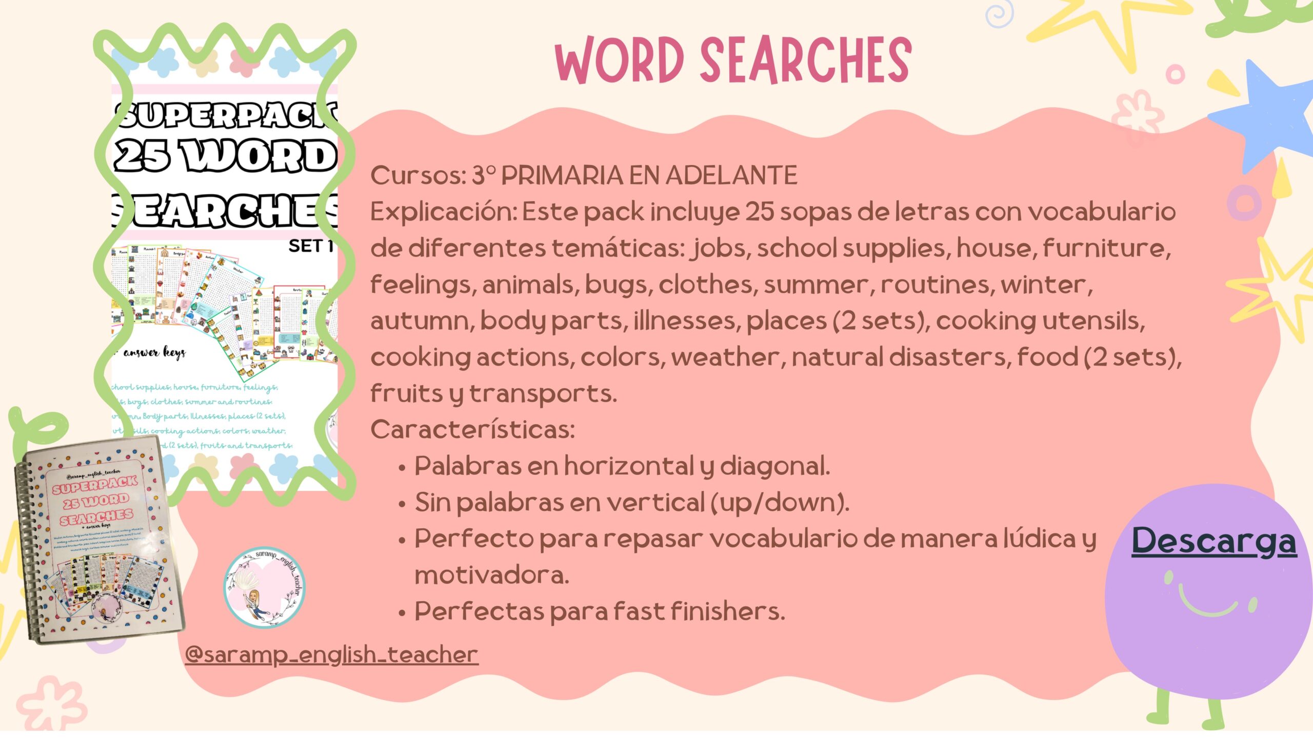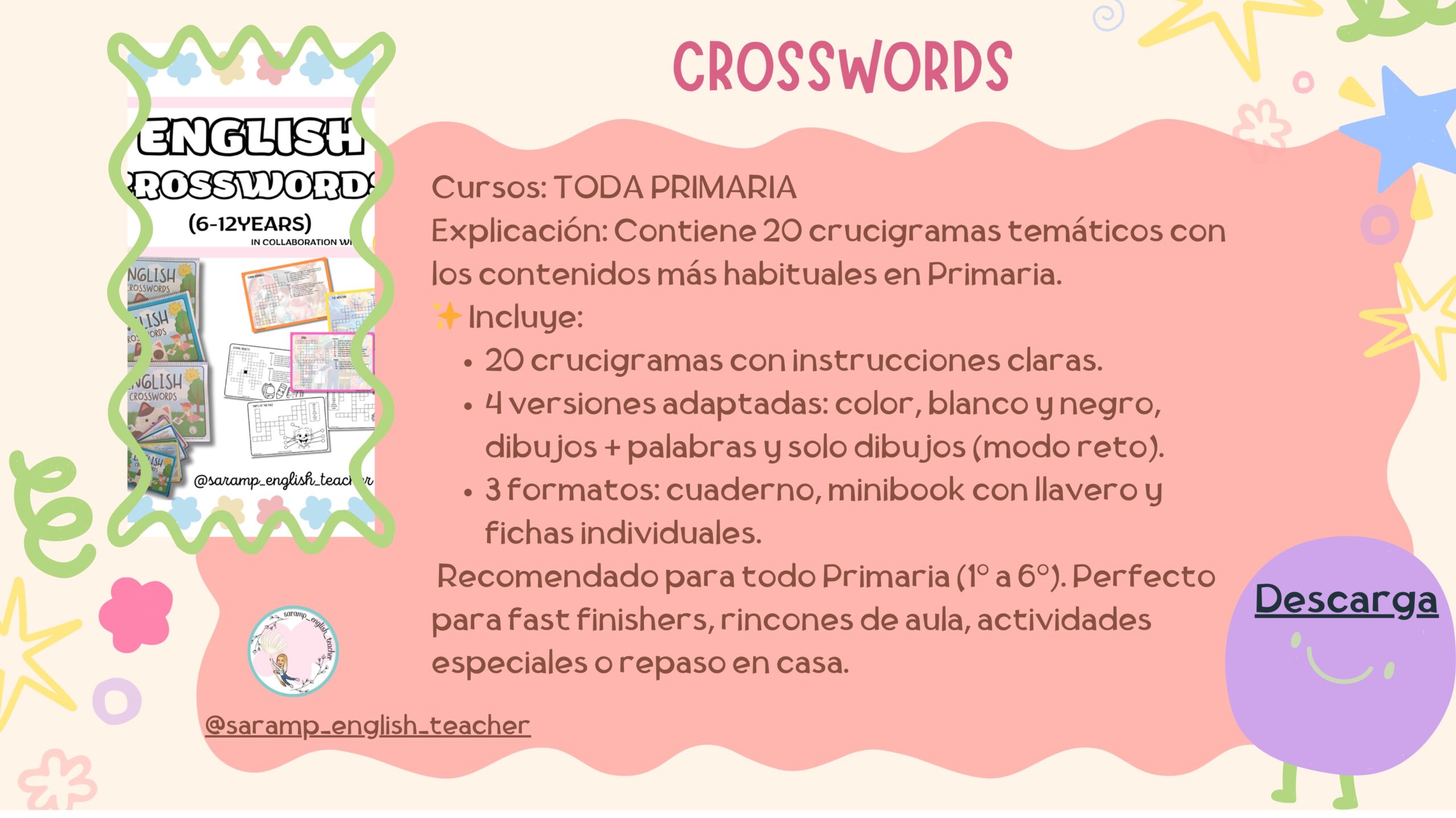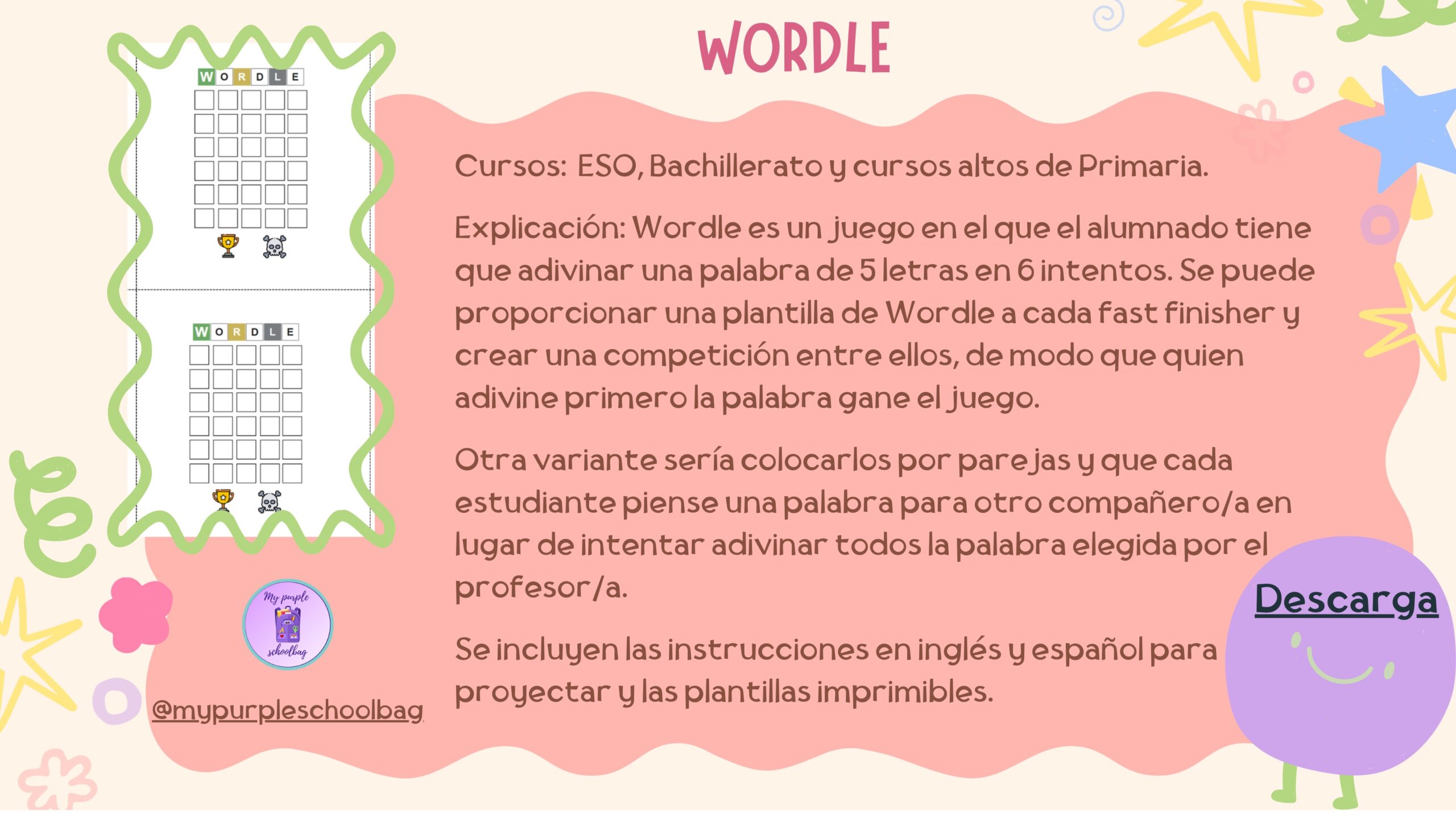🎯Encontrarás: crucigramas, sopas de letras, comecocos, cartas de tareas, dados con retos, lecturas con comprensión, juegos de mesa, puzzles de vocabulario, actividades de escritura creativa, Wordle y mucho más.