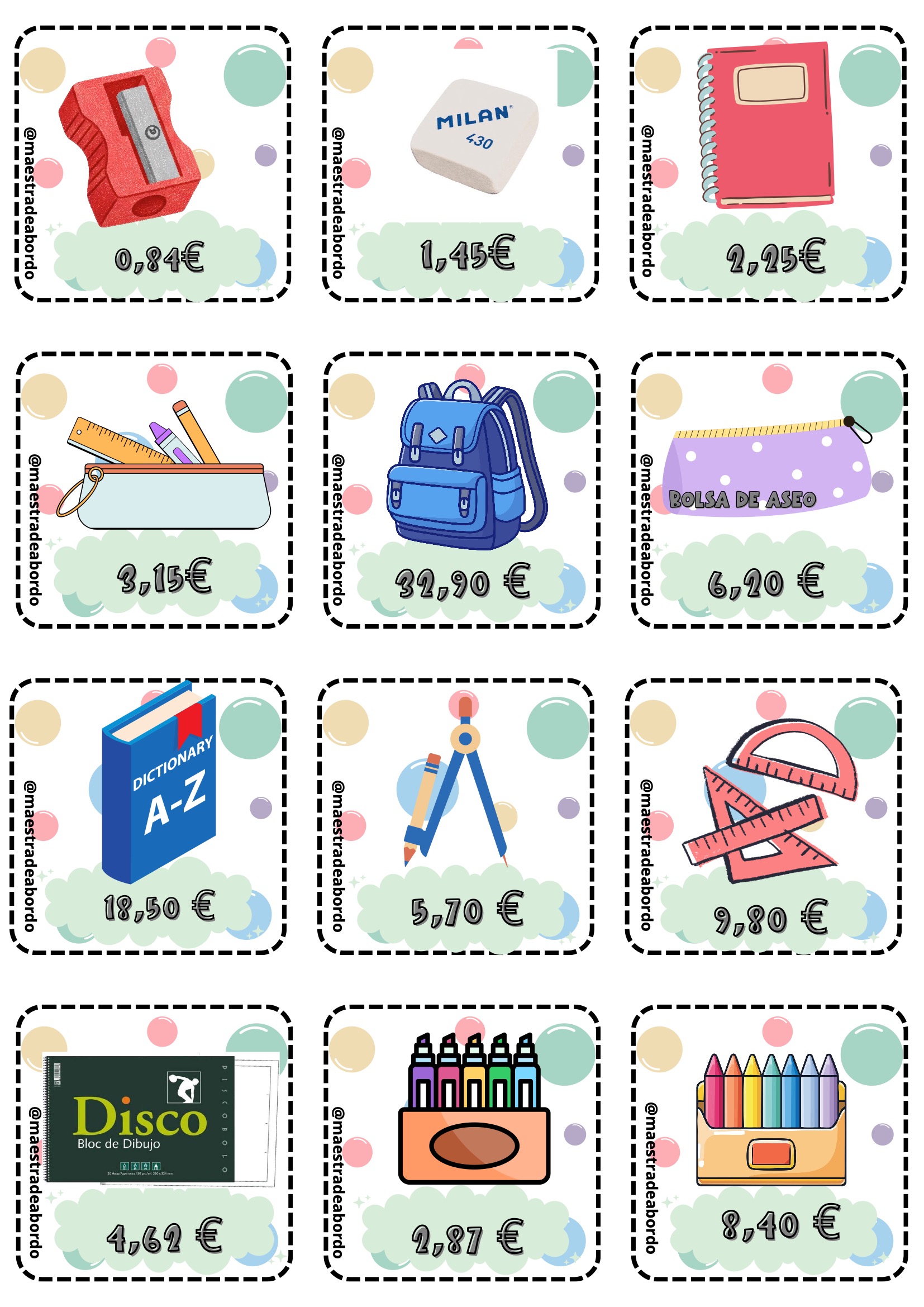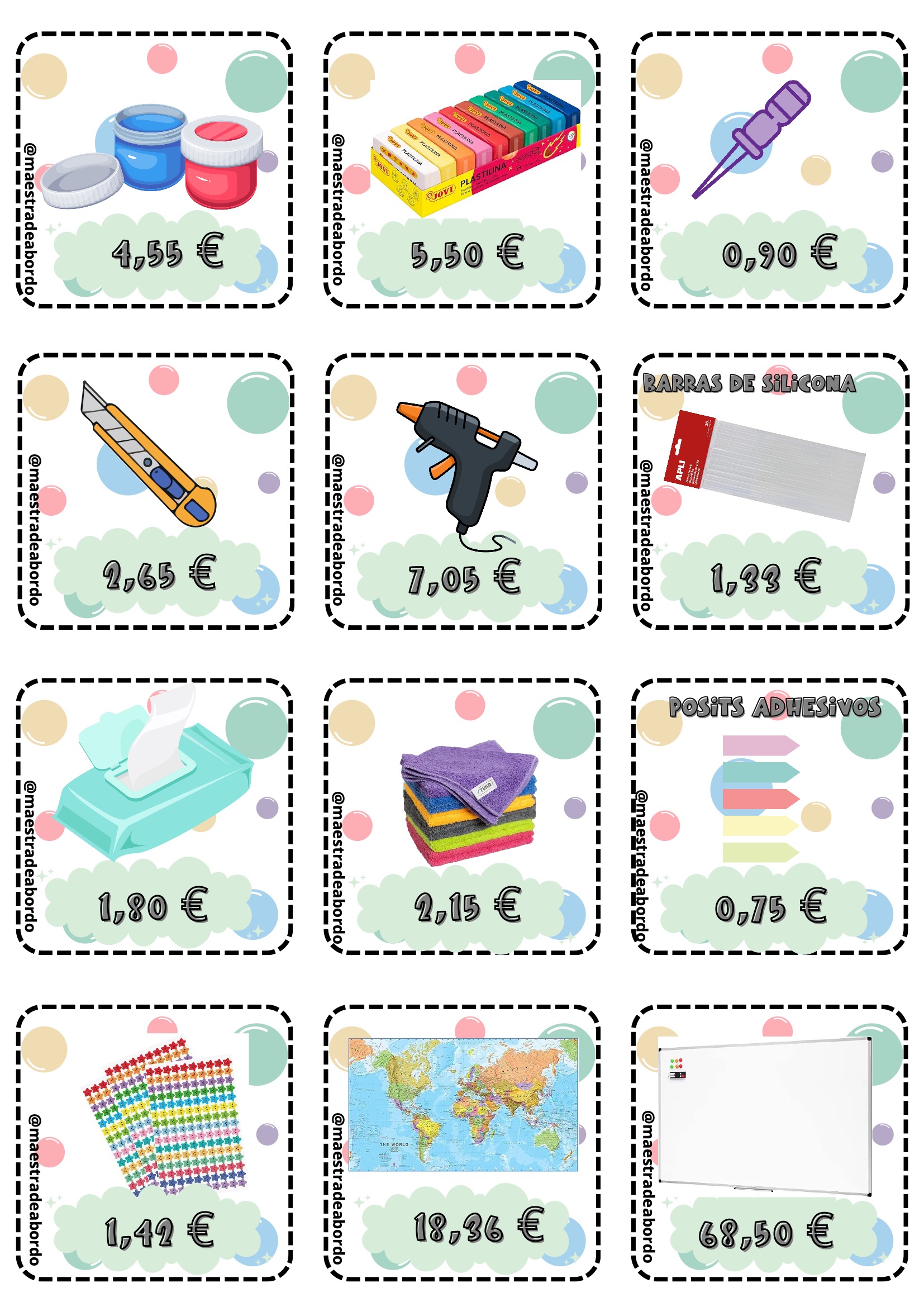 Puedes emplear las tarjetas para crear actividades muy dinámicas: simulaciones de compra y venta, retos matemáticos, juego de tienda, listas de la compra, combinaciones de precios o incluso pequeños problemas situacionales. Favorecen el uso del dinero de forma práctica y permiten reforzar conceptos clave de euros y céntimos.
