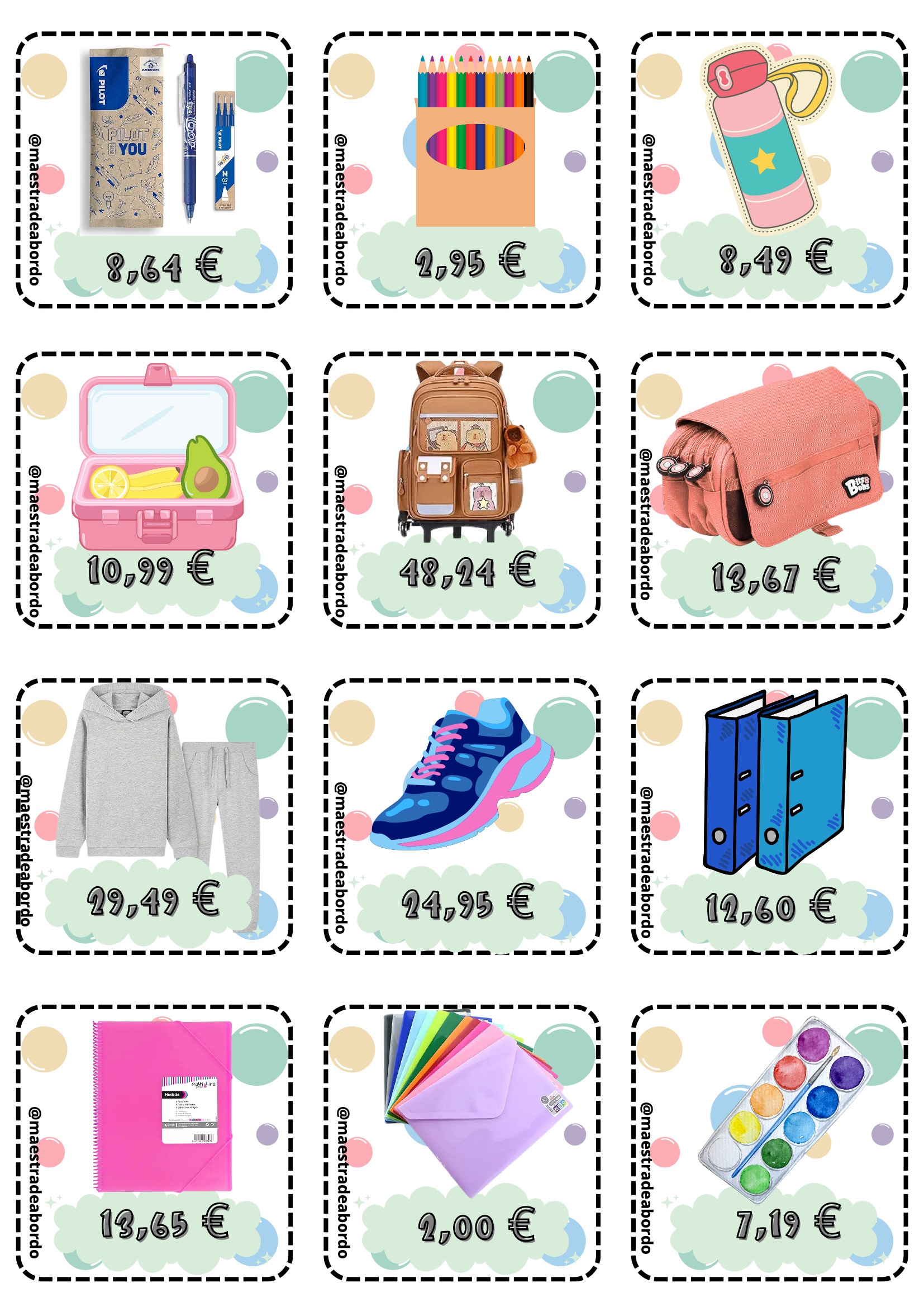 Productos variados de papelería, aula, material escolar y objetos cotidianos.