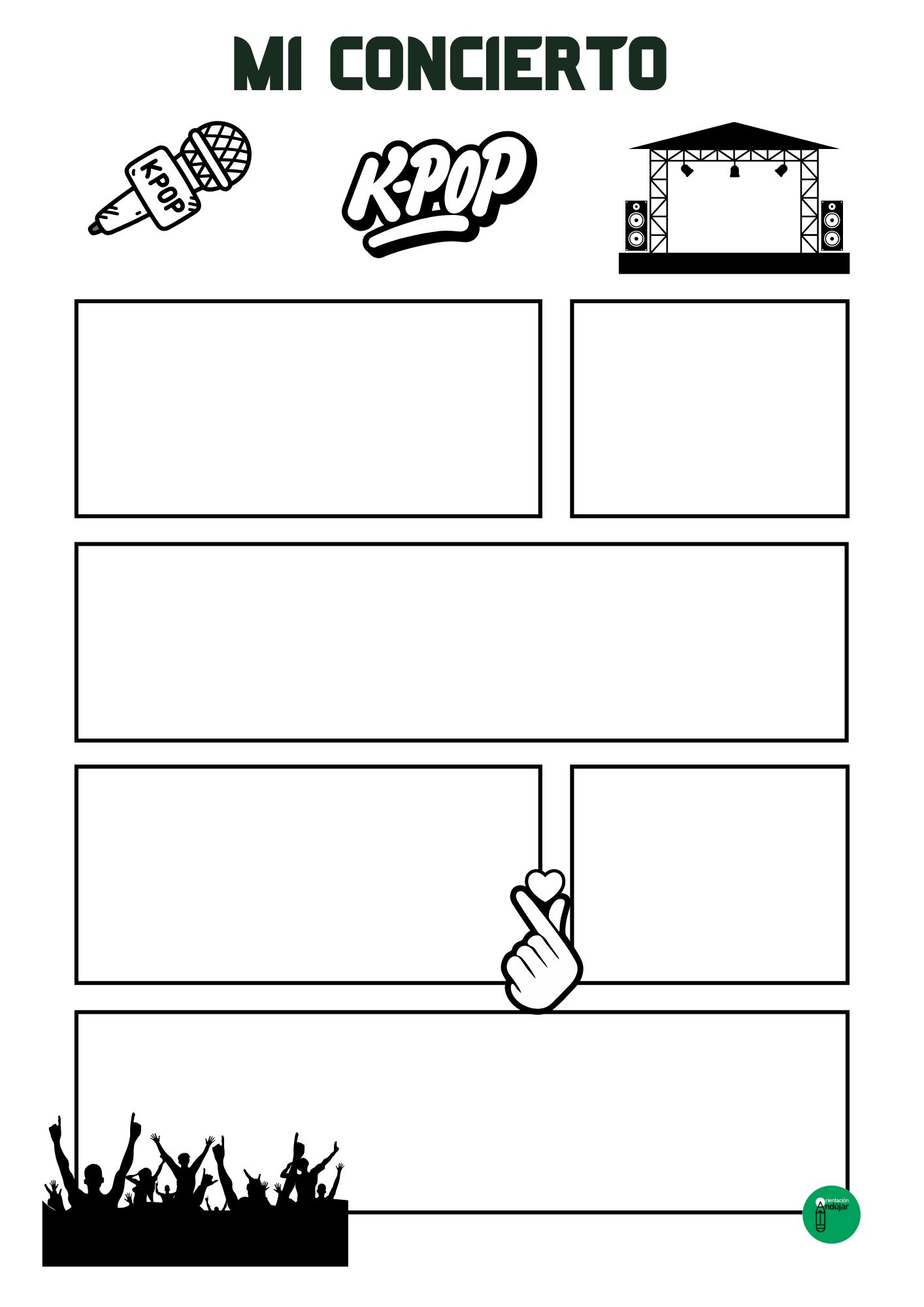 ¿Quieres que tus alumnos se conviertan en diseñadores de conciertos de K-POP por un día? Tenemos un recurso creativo que les encantará: una plantilla para que diseñen su propio cartel de concierto K-POP. En él podrán incluir el nombre de su banda favorita, la fecha y hora del evento, el lugar y detalles especiales, ¡y decorar el cartel con todo el estilo y la energía del K-POP!