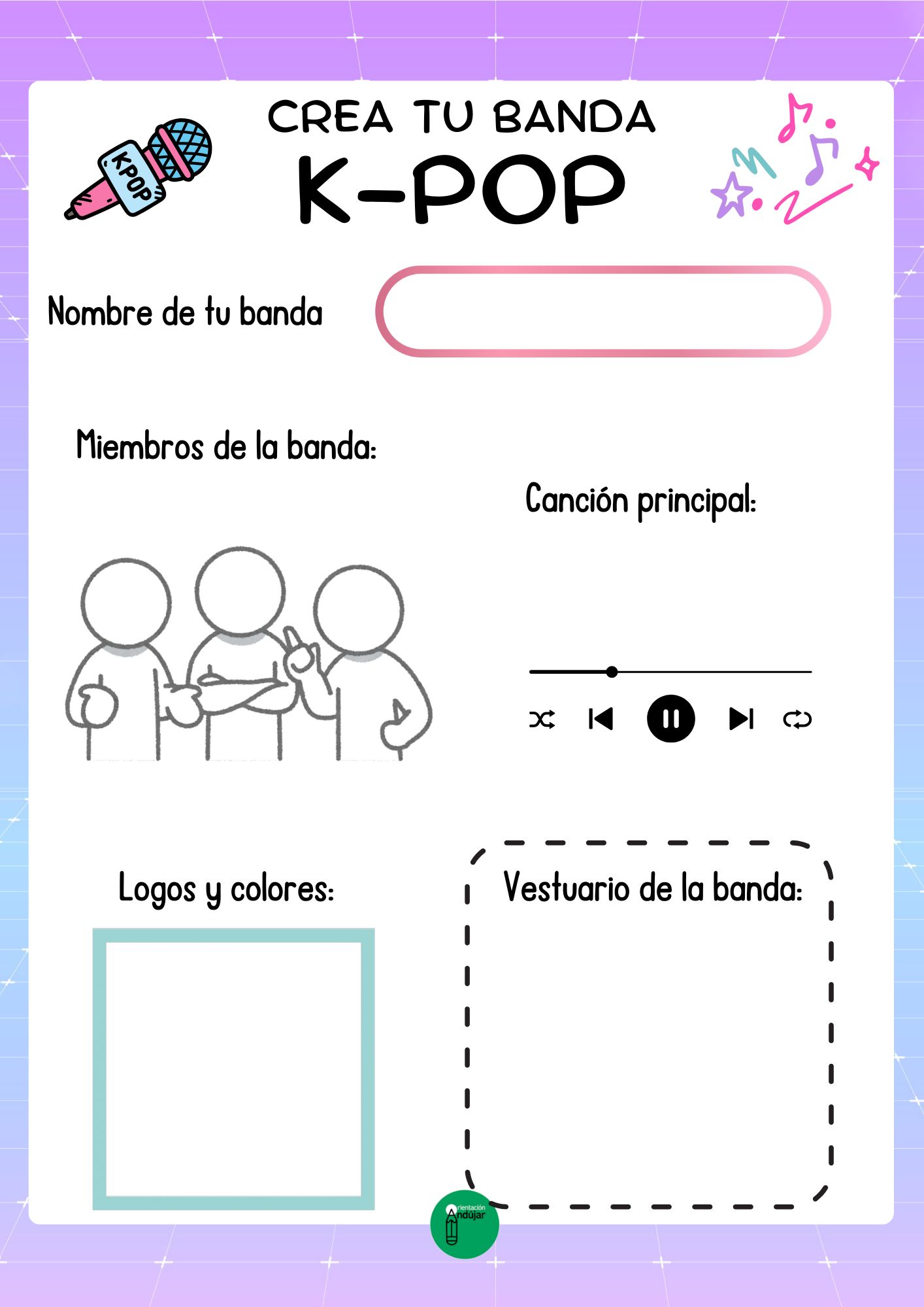 Inspirada en las populares bandas K-POP, esta actividad busca que los alumnos desarrollen su creatividad, trabajen en equipo y expresen sus ideas de manera artística mientras se divierten.