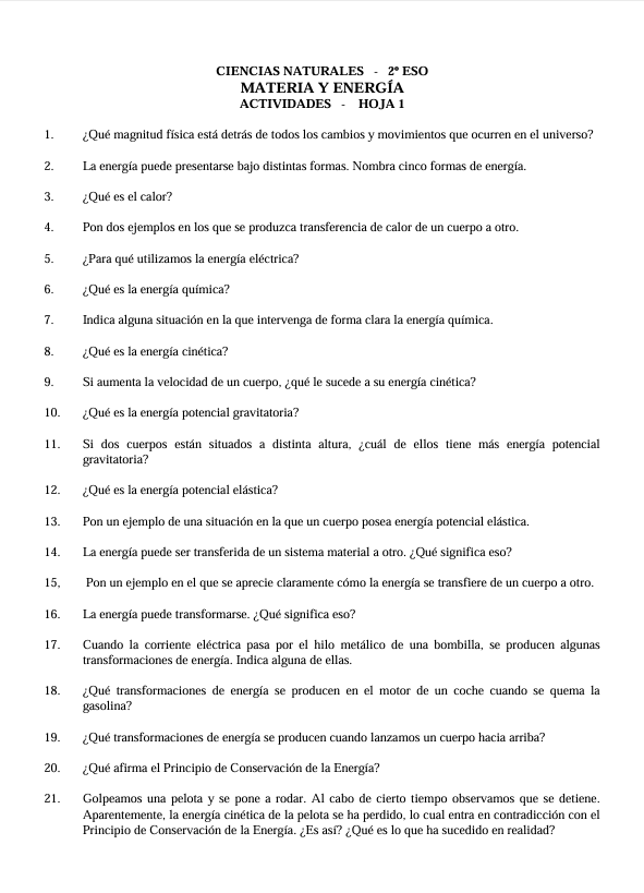 Recopilación de Ejercicios sobre Energía y sus Transformaciones de 2º ESO