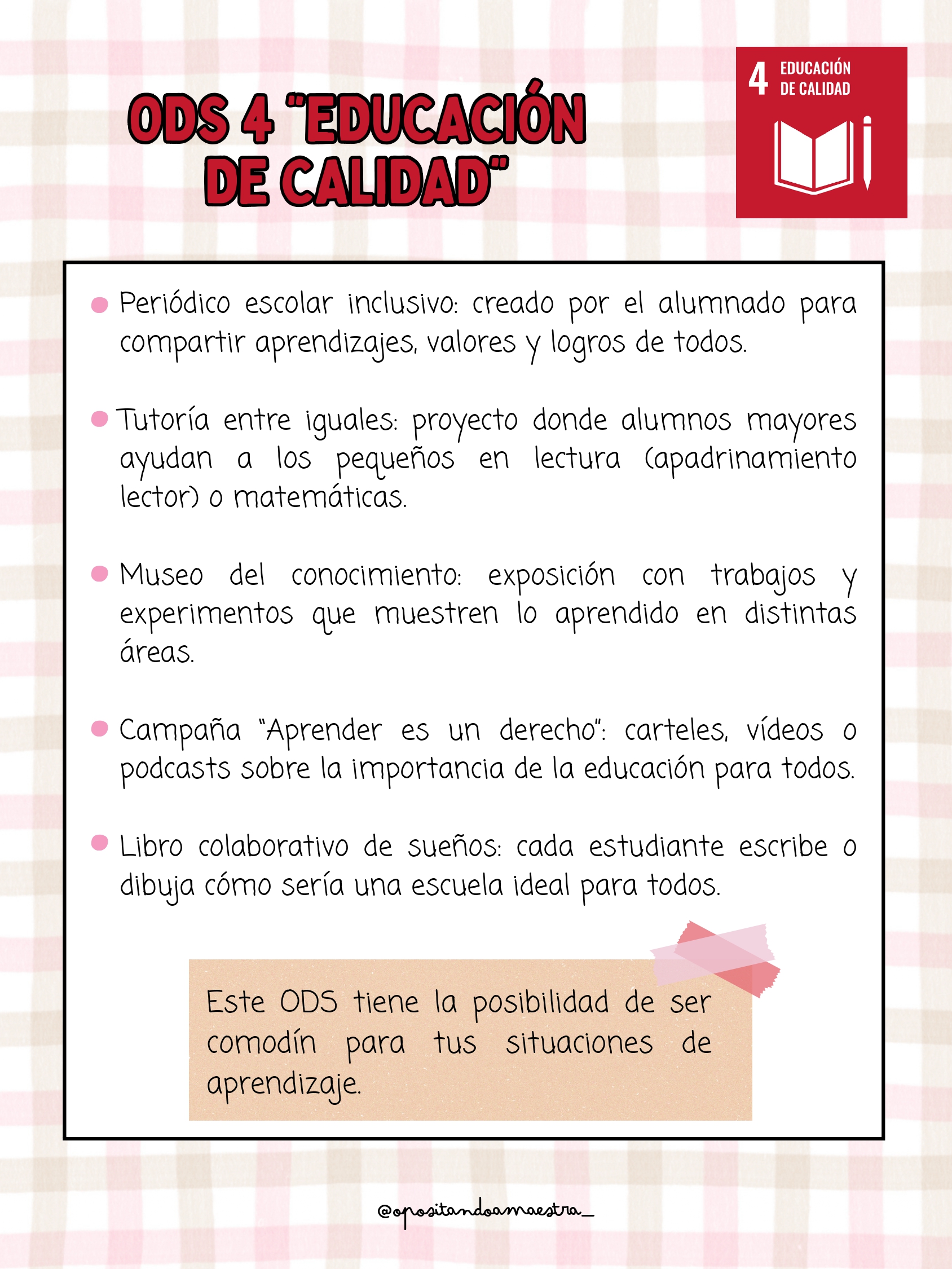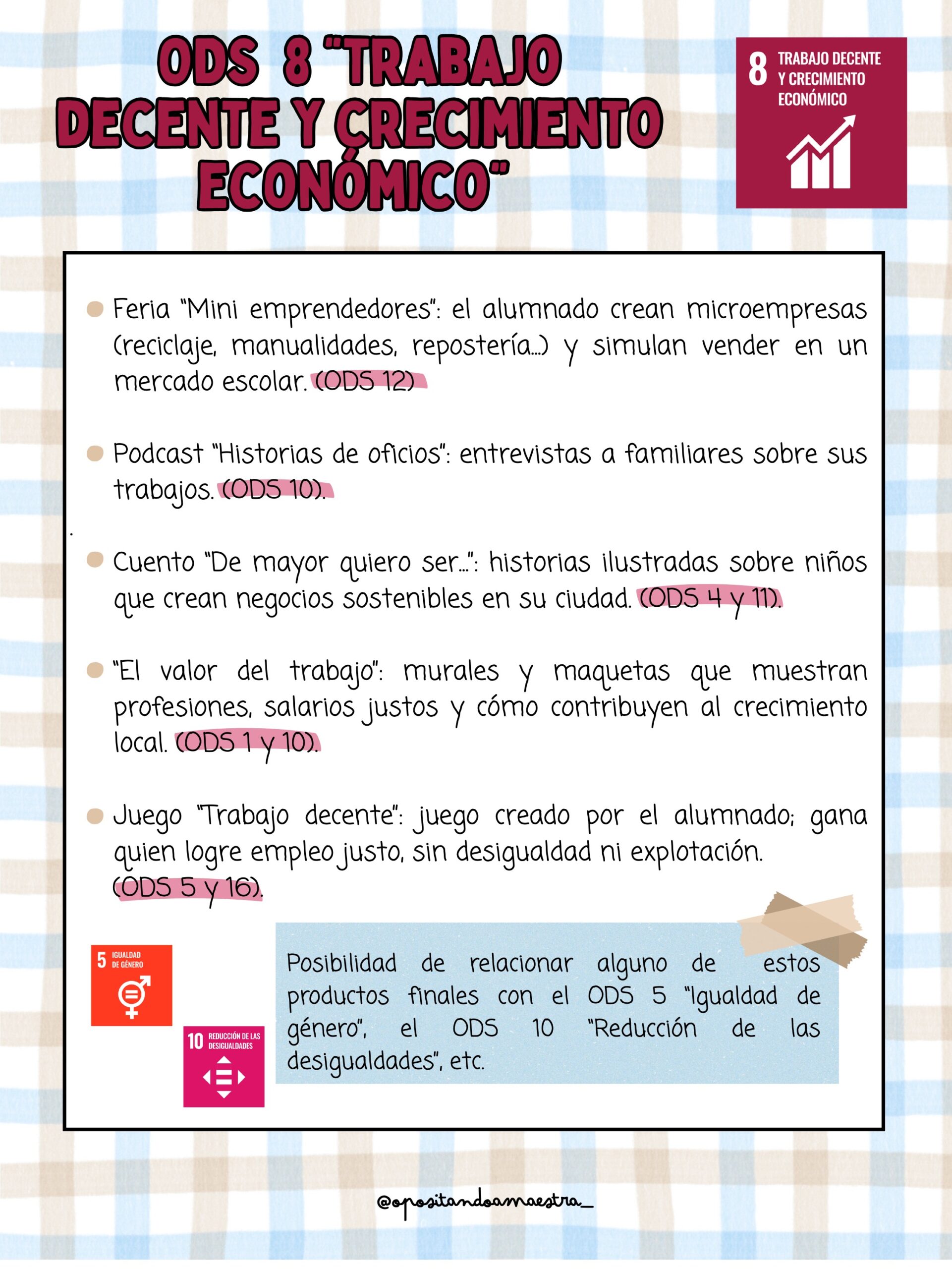 🟣 ODS 8 – Trabajo decente y crecimiento económico: feria “mini emprendedores”, podcast de oficios, cuentos vocacionales, murales y juegos temáticos.