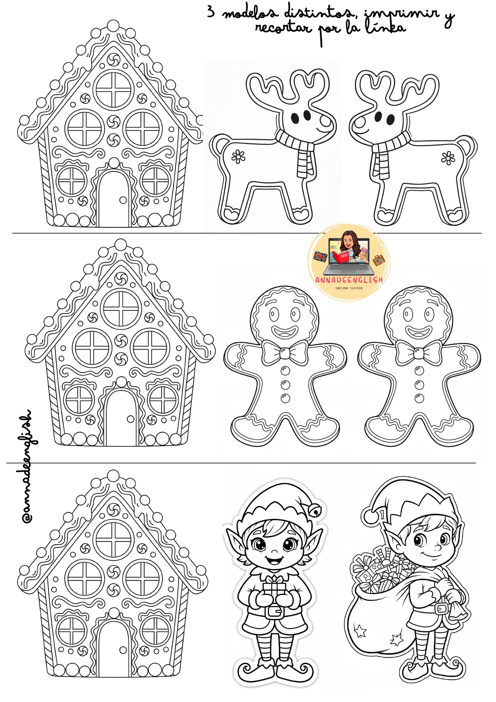 Diseños con renos, elfos, casitas, árboles y elementos decorativos.