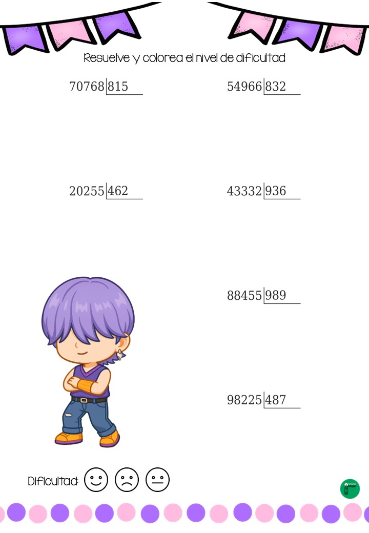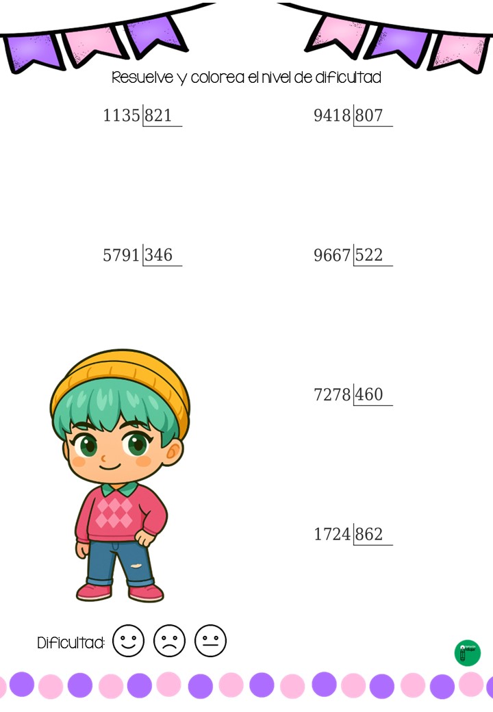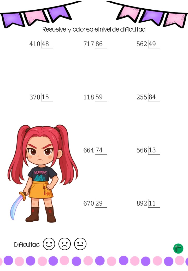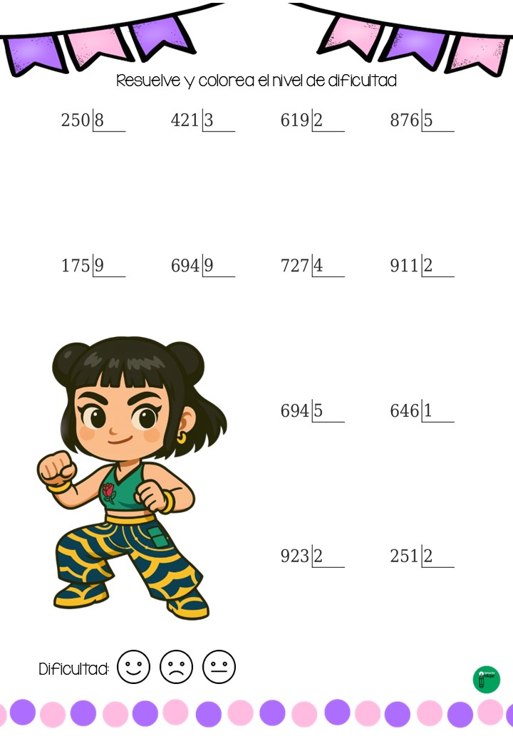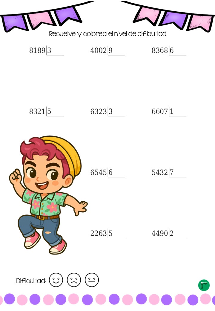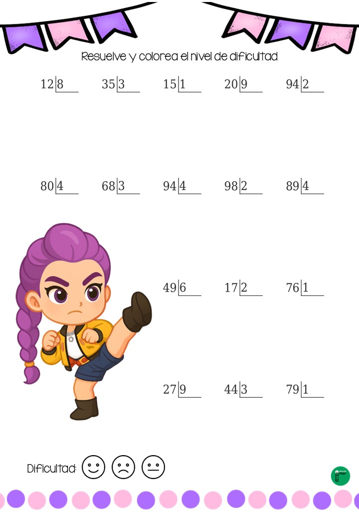 Este recurso está pensado para que los estudiantes repasen o refuercen la división de forma progresiva, comenzando por operaciones sencillas y avanzando hacia retos más complejos. Estas fichas son ideales para usar en estaciones de aprendizaje, talleres de refuerzo, deberes dirigidos o como material de apoyo durante las clases de Matemáticas.