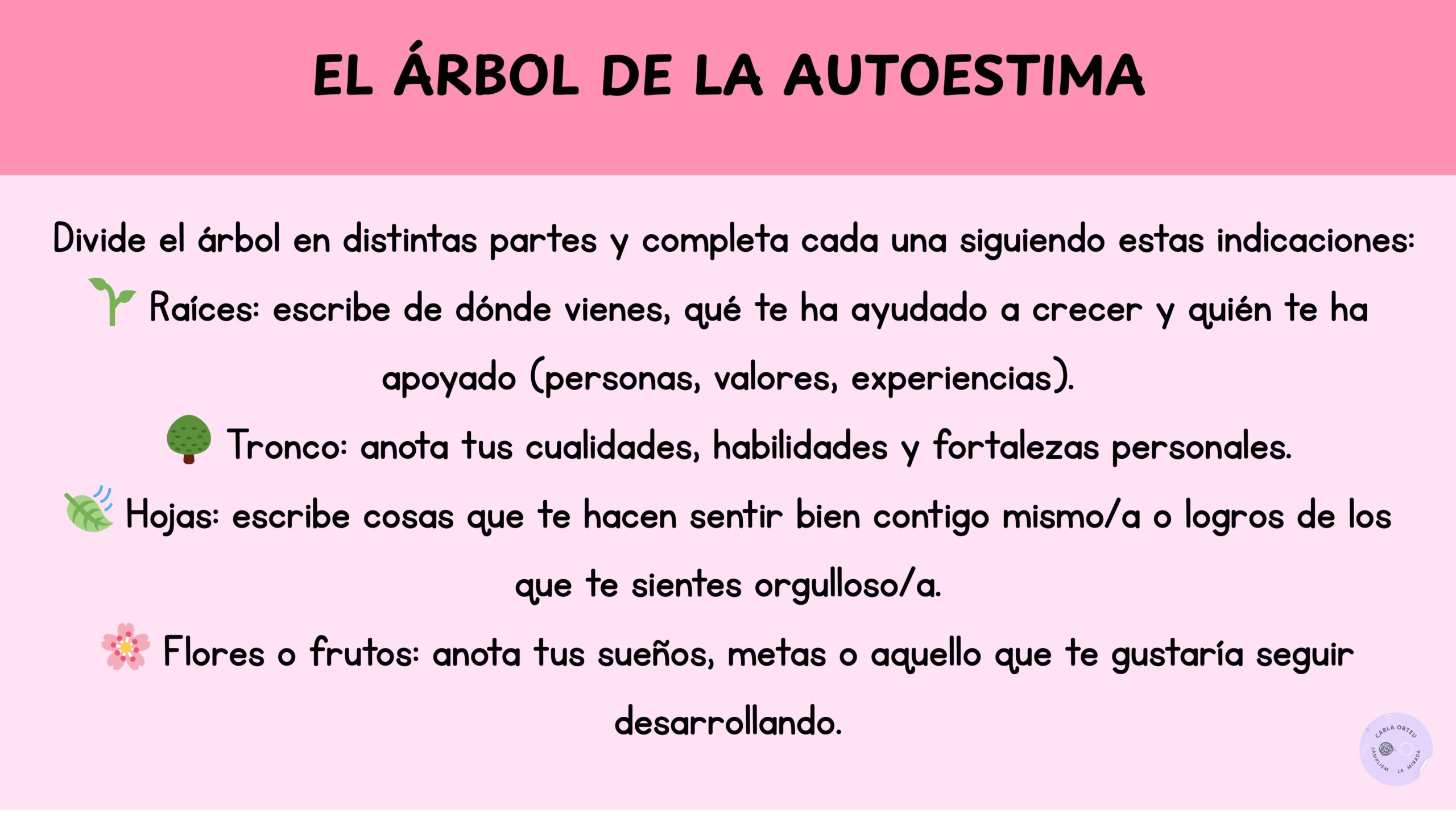 “El árbol de la autoestima” para trabajar raíces, tronco, hojas y metas.