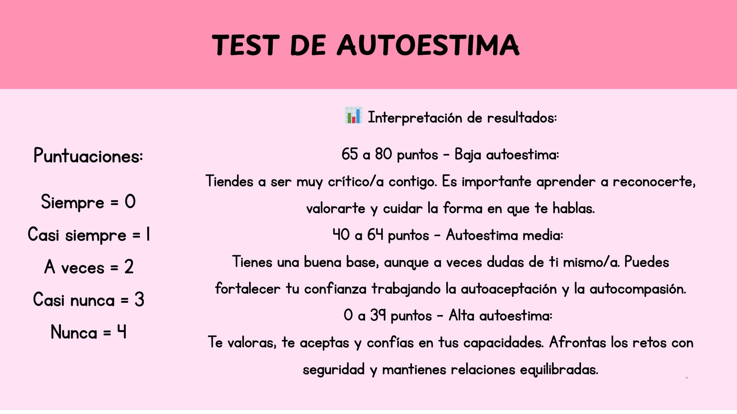 Introduce el test de autoestima como herramienta de autoconocimiento periódica.