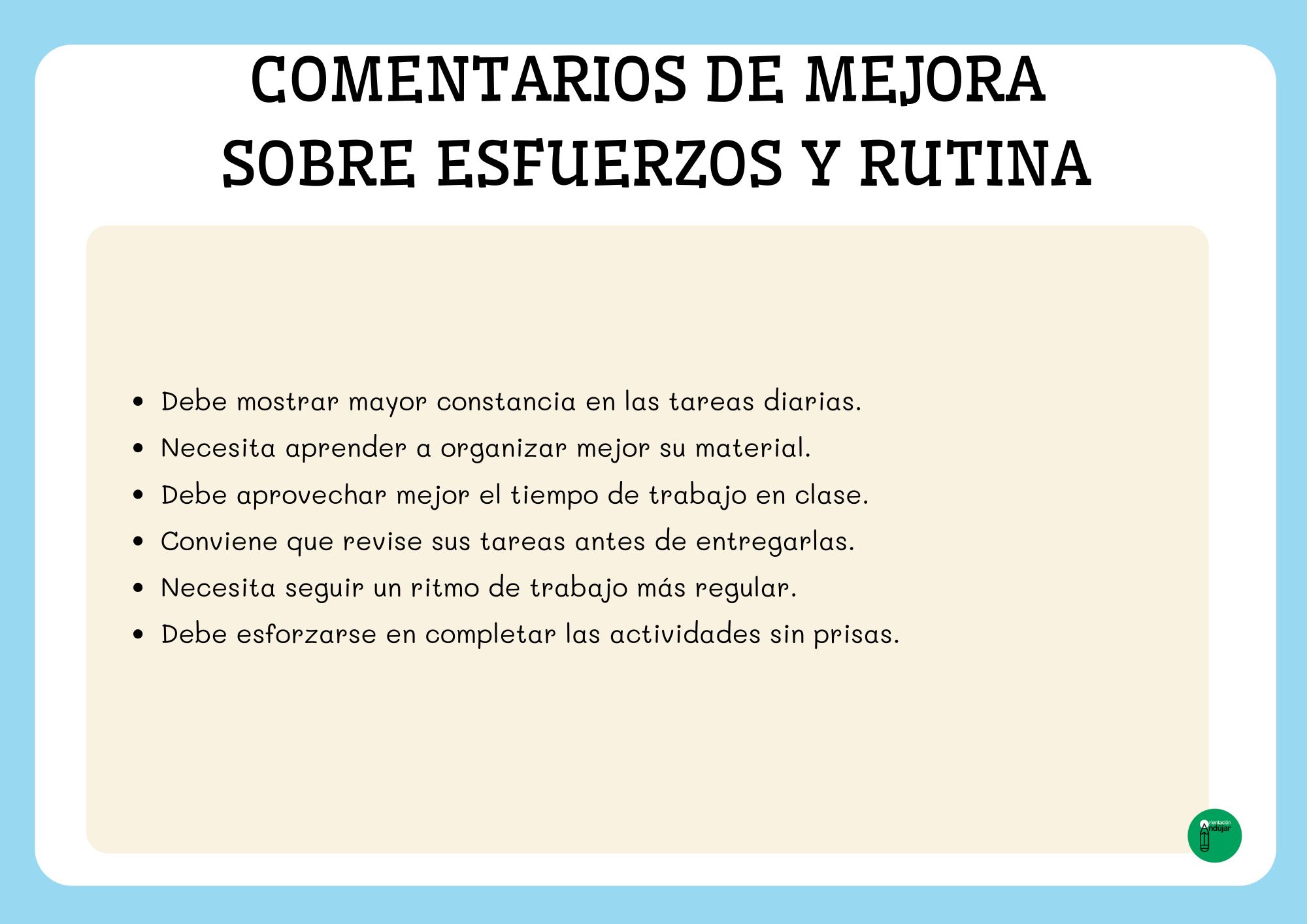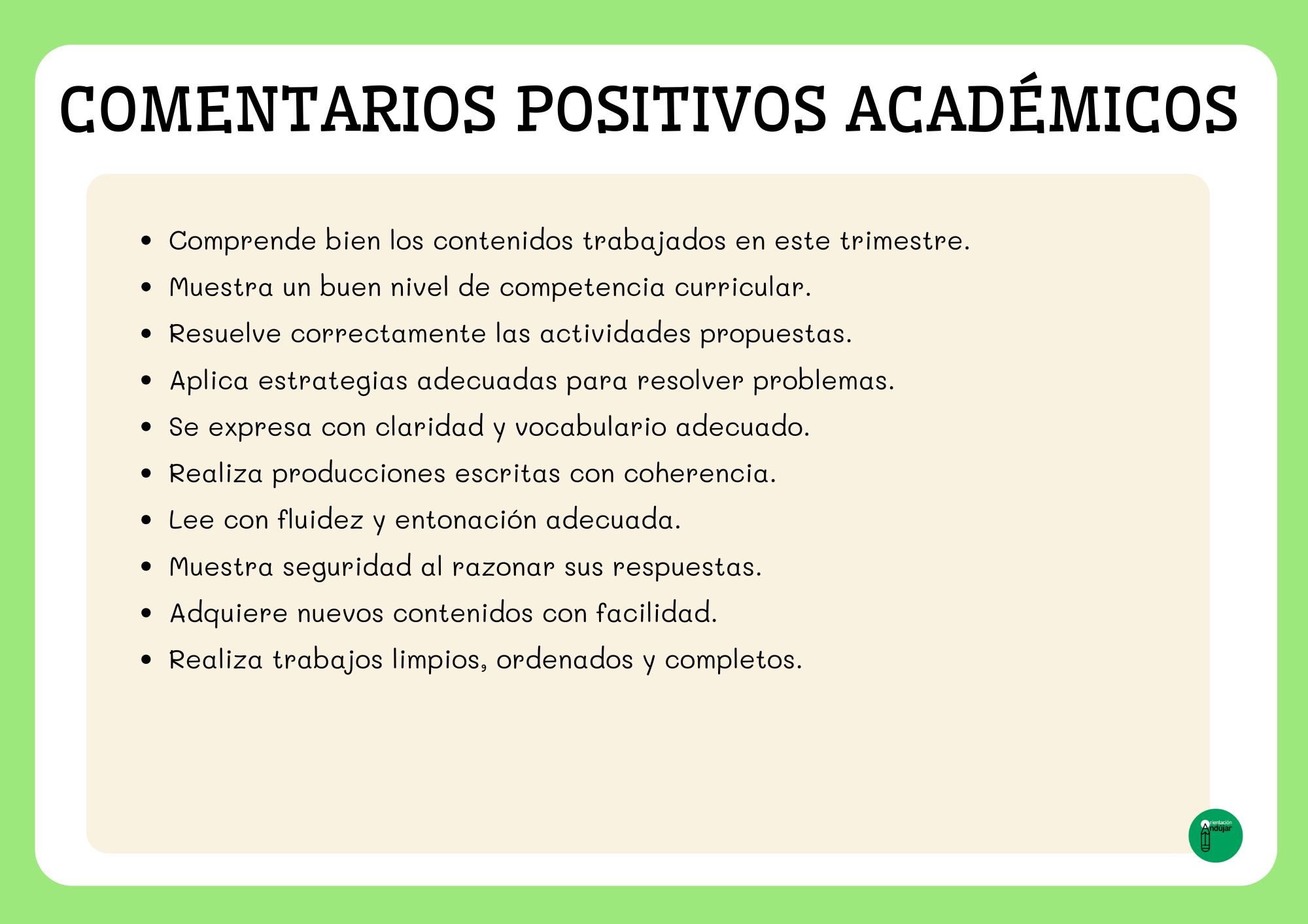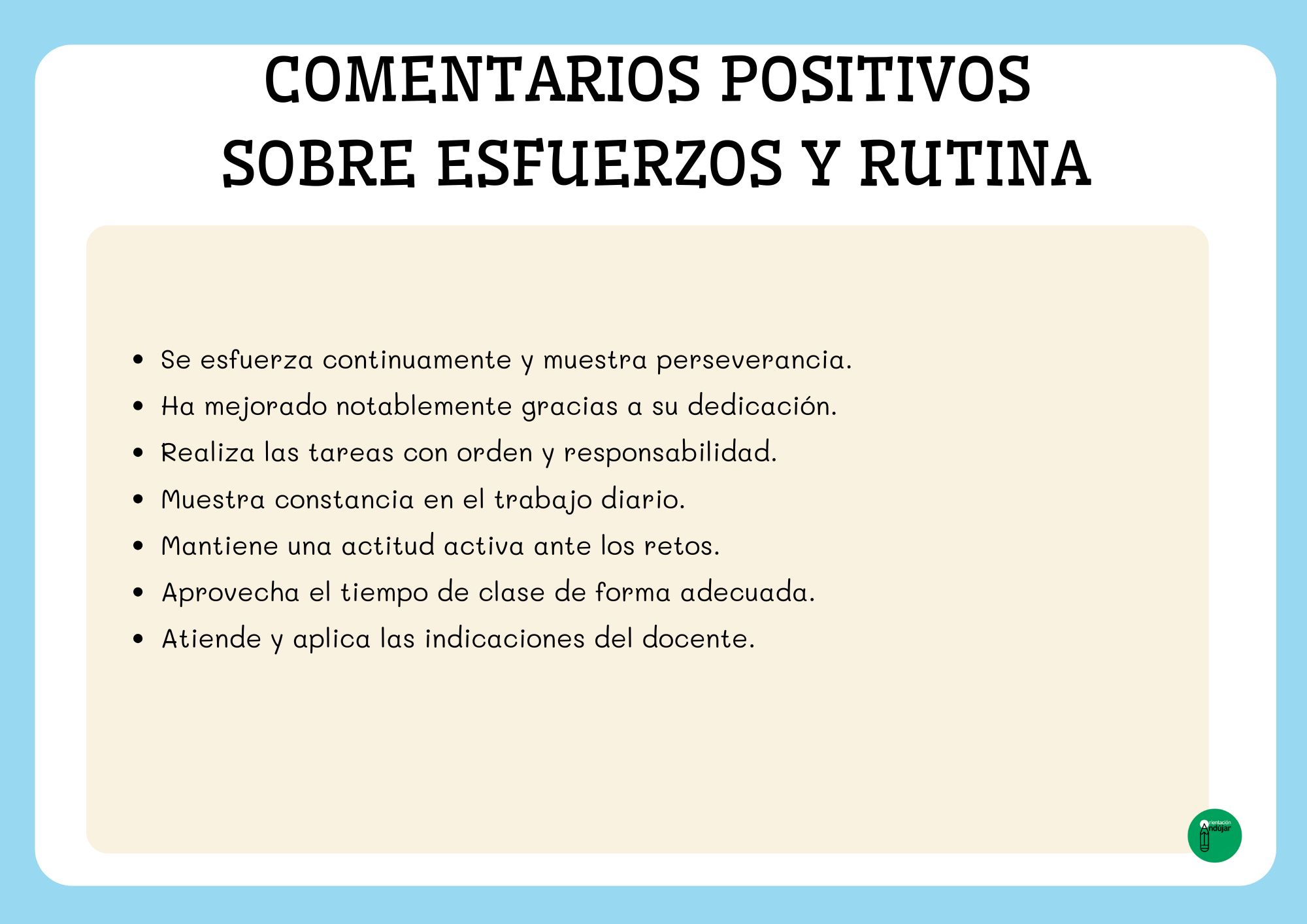A la hora de elaborar los informes de evaluación del primer trimestre, uno de los mayores retos para cualquier docente es encontrar las palabras adecuadas para describir de forma clara, objetiva y respetuosa el progreso del alumnado. Para facilitar este proceso, he preparado una colección de comentarios “salvavidas” que podrás utilizar para completar o complementar tus informes. Son frases cortas, neutras y adaptables a cualquier área, pensadas especialmente para Educación Primaria.