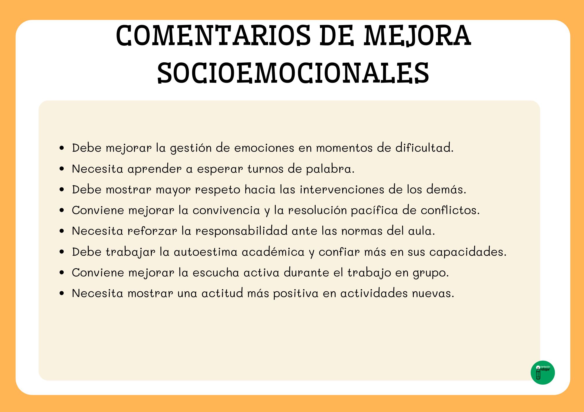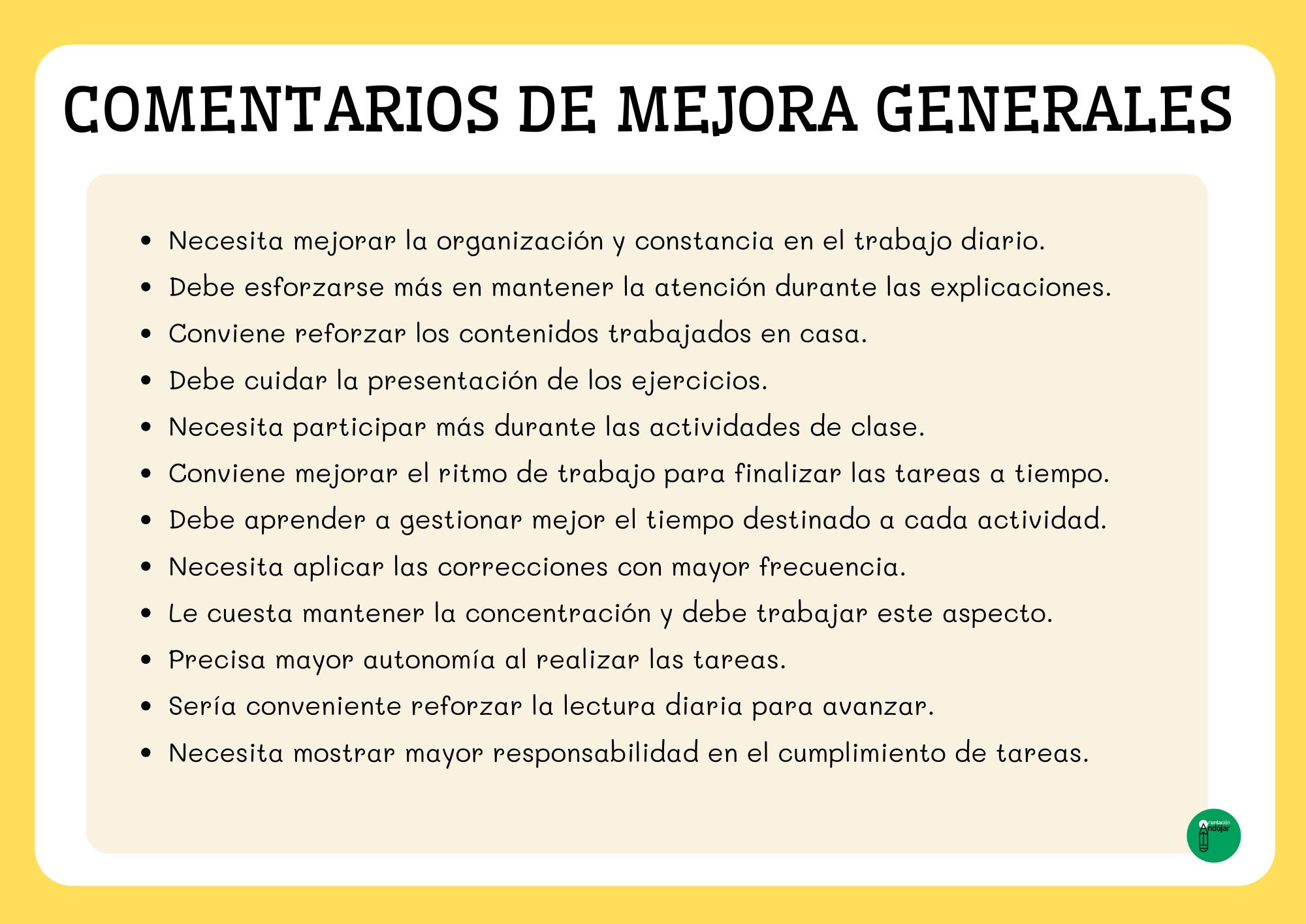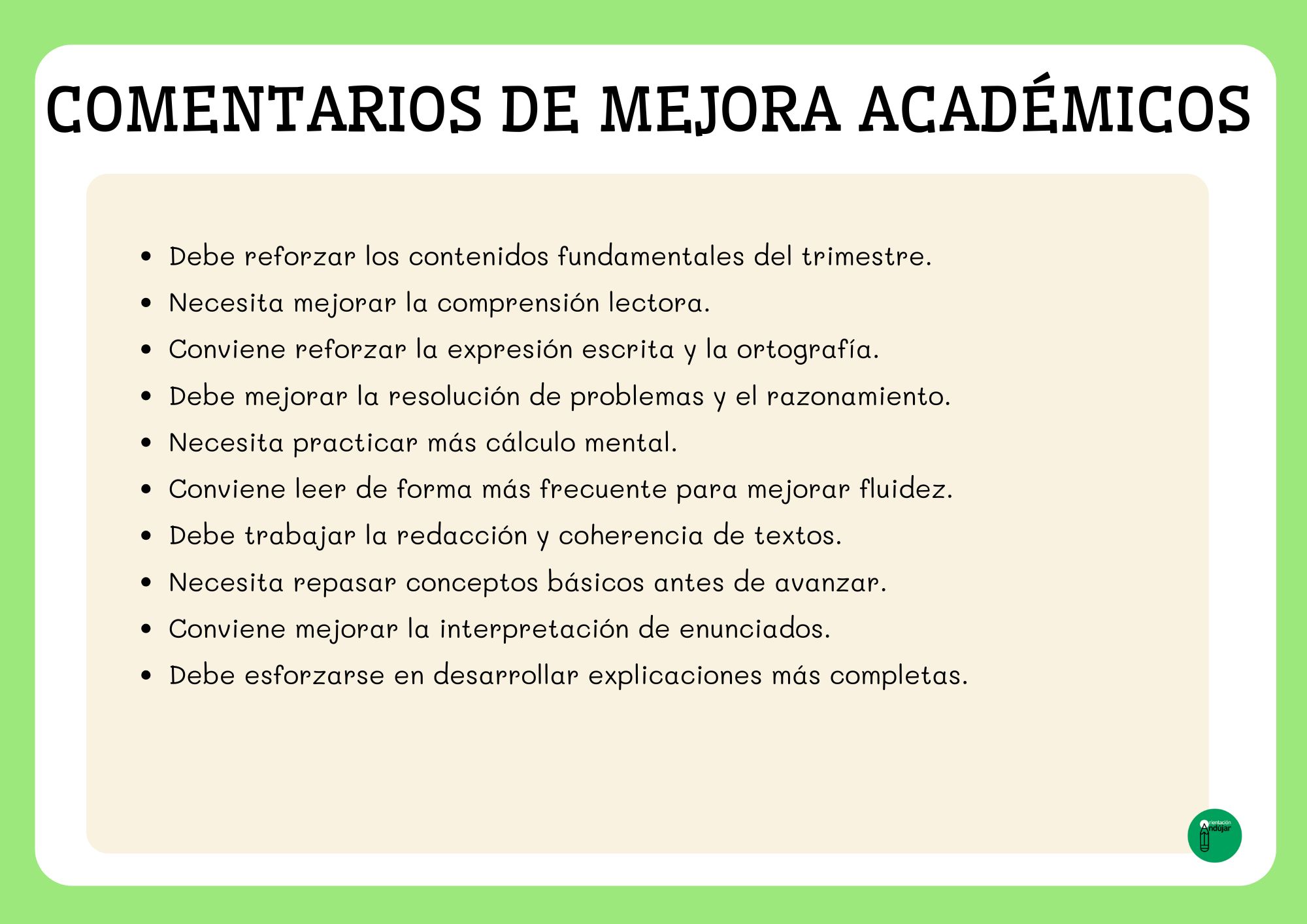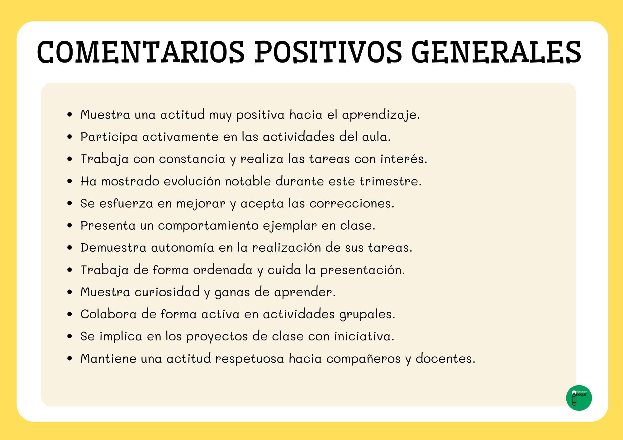 A la hora de elaborar los informes de evaluación del primer trimestre, uno de los mayores retos para cualquier docente es encontrar las palabras adecuadas para describir de forma clara, objetiva y respetuosa el progreso del alumnado. Para facilitar este proceso, he preparado una colección de comentarios “salvavidas” que podrás utilizar para completar o complementar tus informes. Son frases cortas, neutras y adaptables a cualquier área, pensadas especialmente para Educación Primaria.