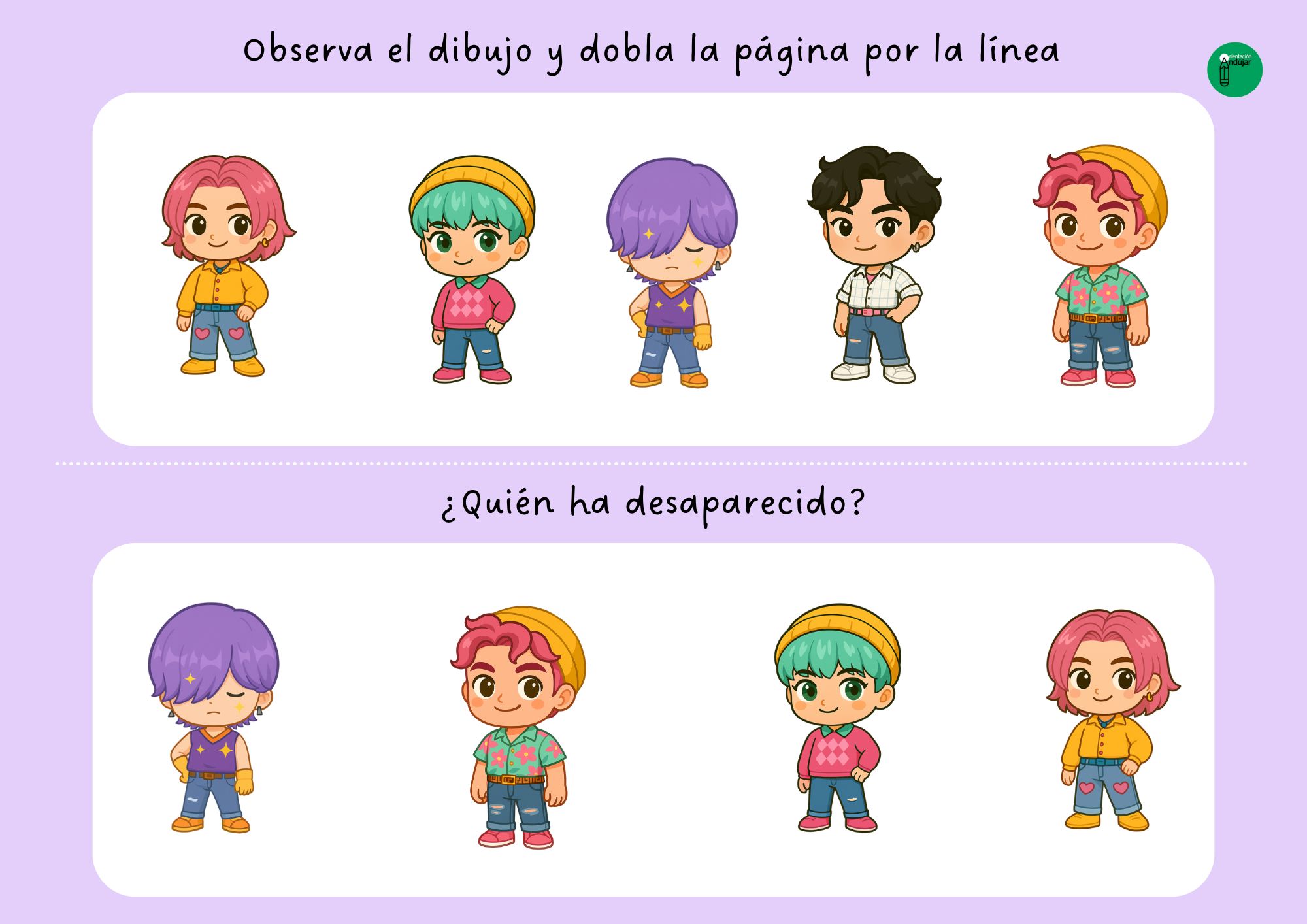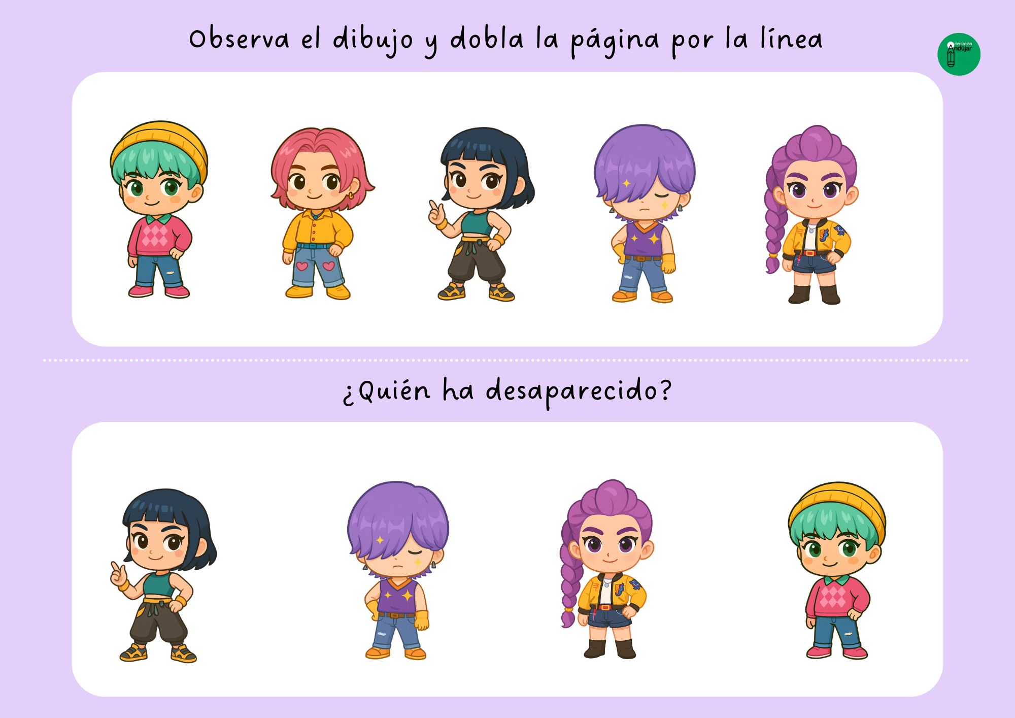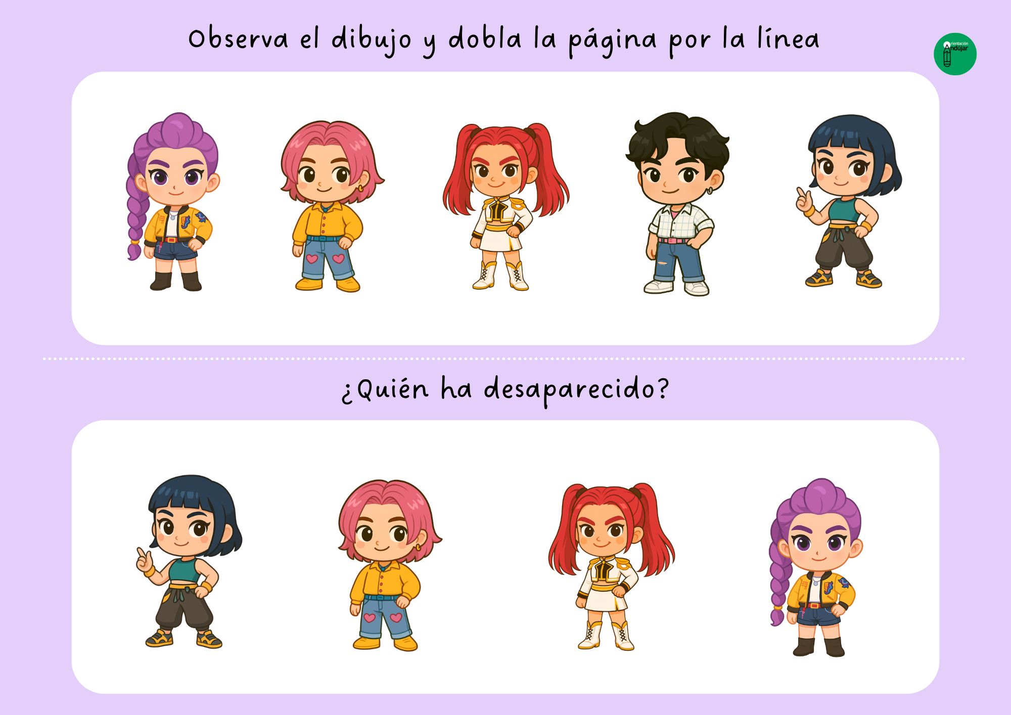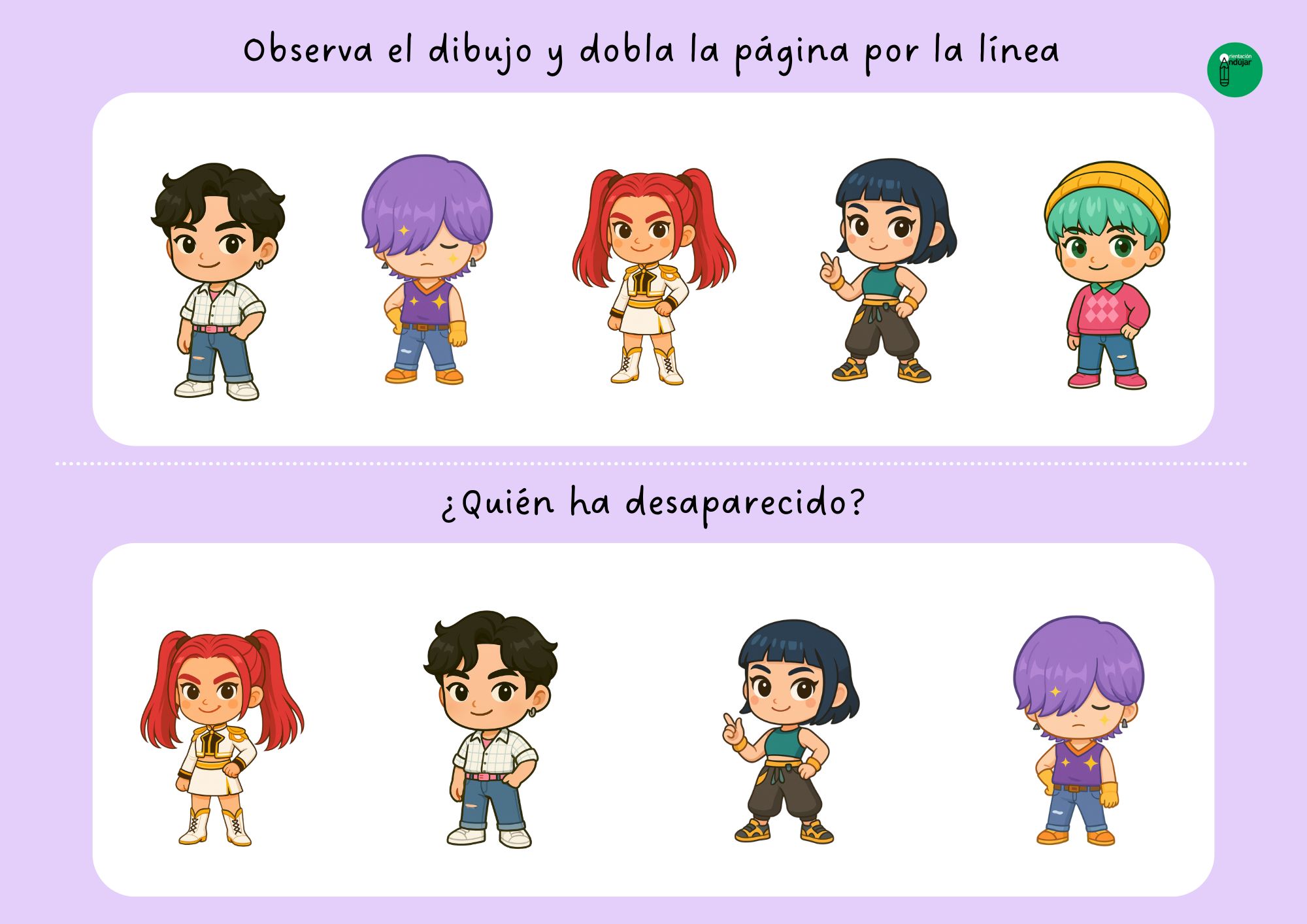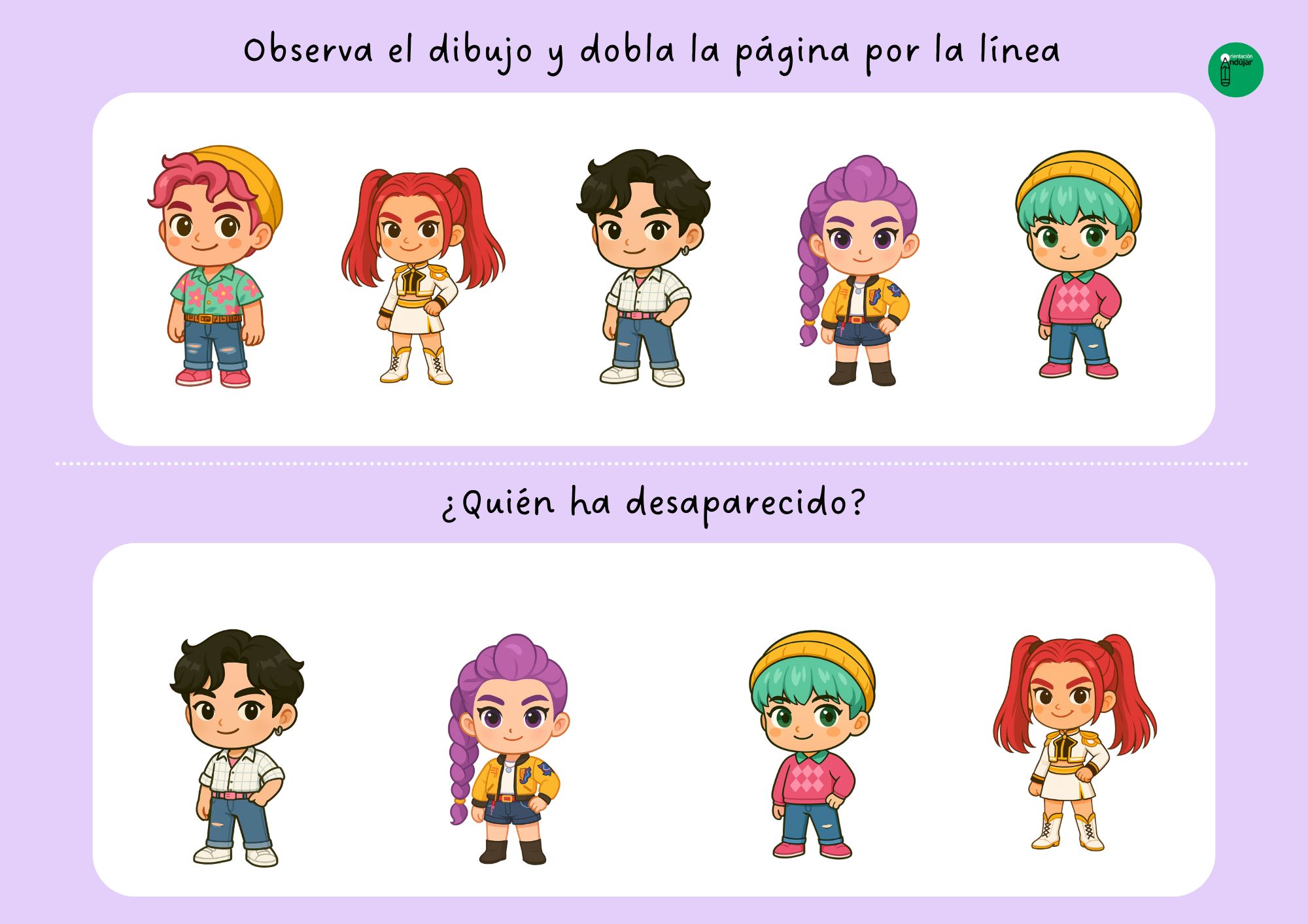 La actividad se basa en una dinámica muy sencilla y altamente motivadora. Los alumnos reciben una ficha en la que aparecen varios de estos personajes colocados de forma visible. Primero se les pide que observen la imagen durante unos segundos, prestando atención a los detalles: colores, posiciones, rasgos y número de personajes. Una vez han tenido tiempo suficiente para mirar con calma, deben doblar la hoja por la mitad para descubrir la siguiente parte de la ficha.